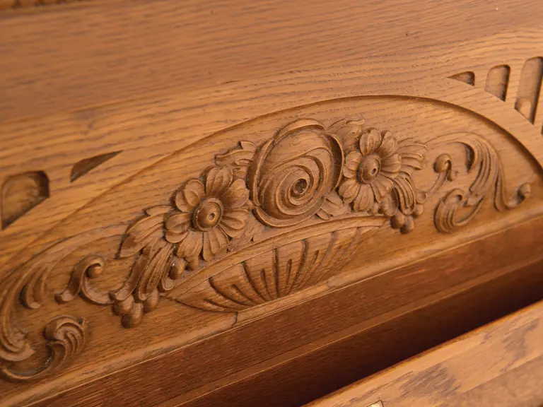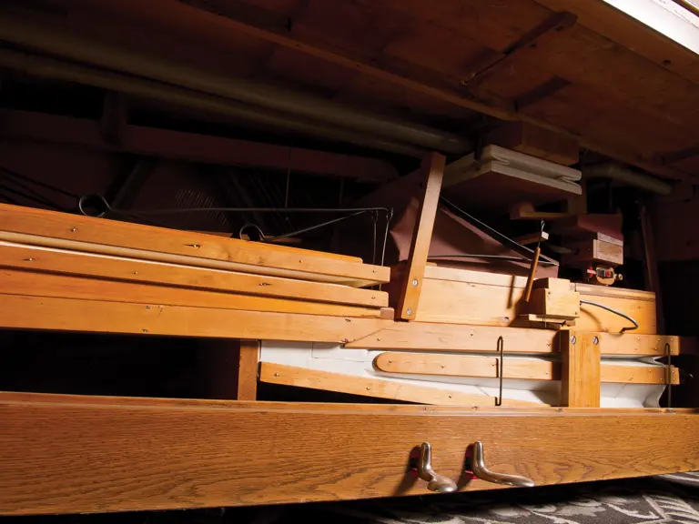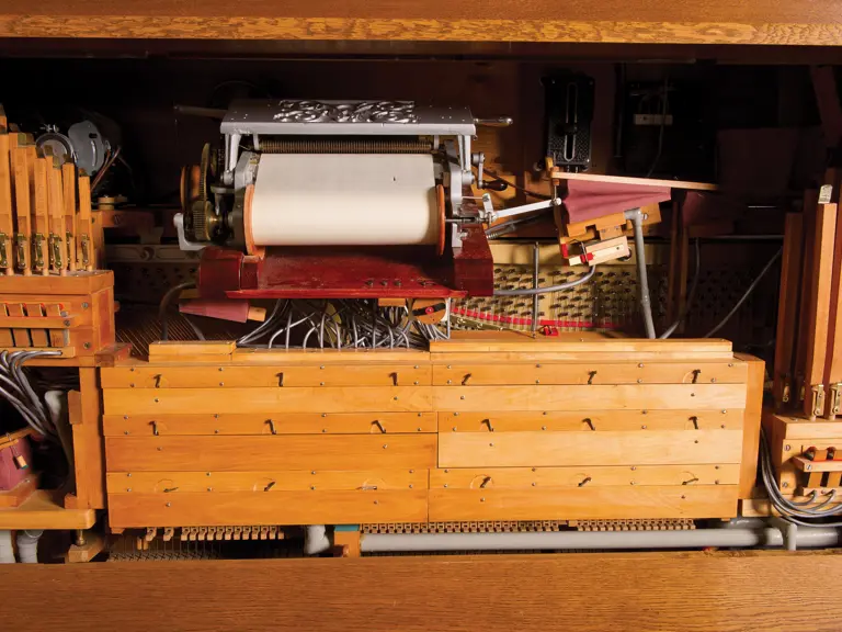 This Weber Unika, one of two in the Milhous Collection, has a piano with 28 violin pipes, swell shutters and vibrato mechanism and plays realistic-sounding piano and violin music. It plays from special Weber Unika rolls, two dozen of which are included with the instrument. This example was formerly owned by a collector in Washington State before being fully restored by Mike Argain. It is considered to be among the most desirable of the smaller German orchestrions made in Waldkirch by Gebr. Weber.