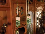 The only known surviving Tell orchestrion, this example was originally sold to a café in France, where it remained until 1997. It was acquired from the collection of Danny DeBie in Belgium and subsequently restored by Mike Argain in Fresno, California. Instrumentation includes piano with mandolin attachment, two ranks of violin pipes and a unique rank of 30 solo violin pipes with tremolo that turn the other ranks and piano treble off when they play. Percussion includes orchestra bells, drums and cymbal. The main case, side cabinets and hanging fixtures are original, except for the glass beading. The original statues have been replaced with appropriate statues of the period. The Tell plays from its original cardboard rolls and from a convenient digital MIDI player system. The last, which does not compromise the original mechanisms, makes it possible for one to commission a virtually unlimited repertoire of music if so desired. The Tell is accompanied by a dozen rolls and a library of MIDI files.