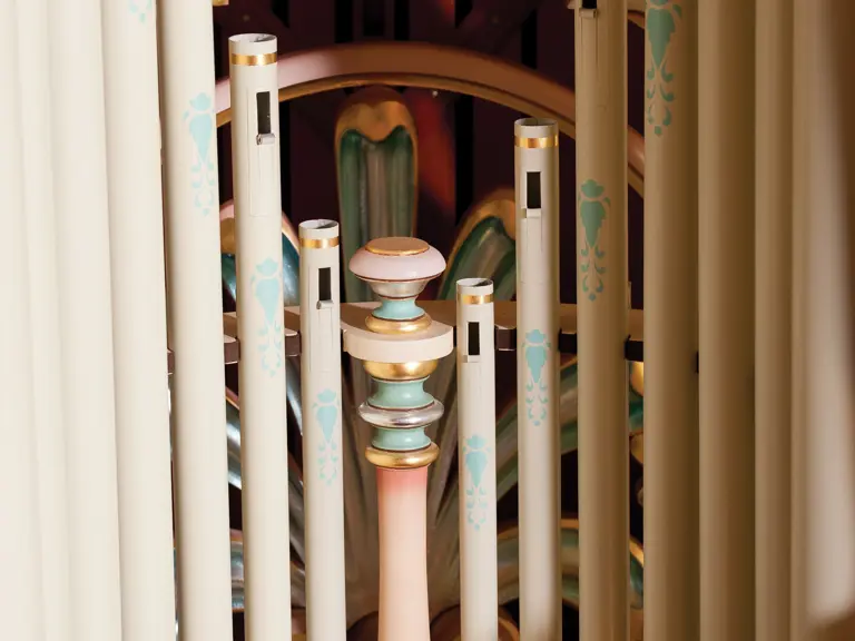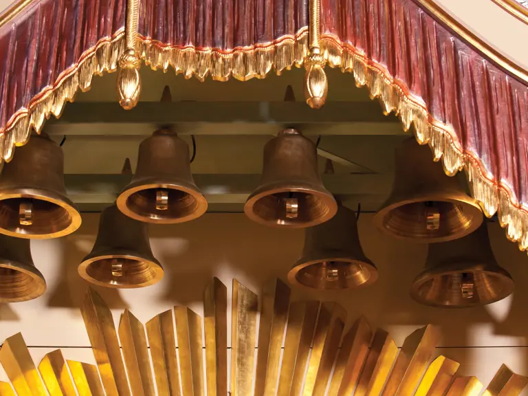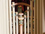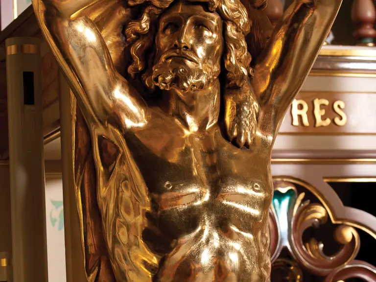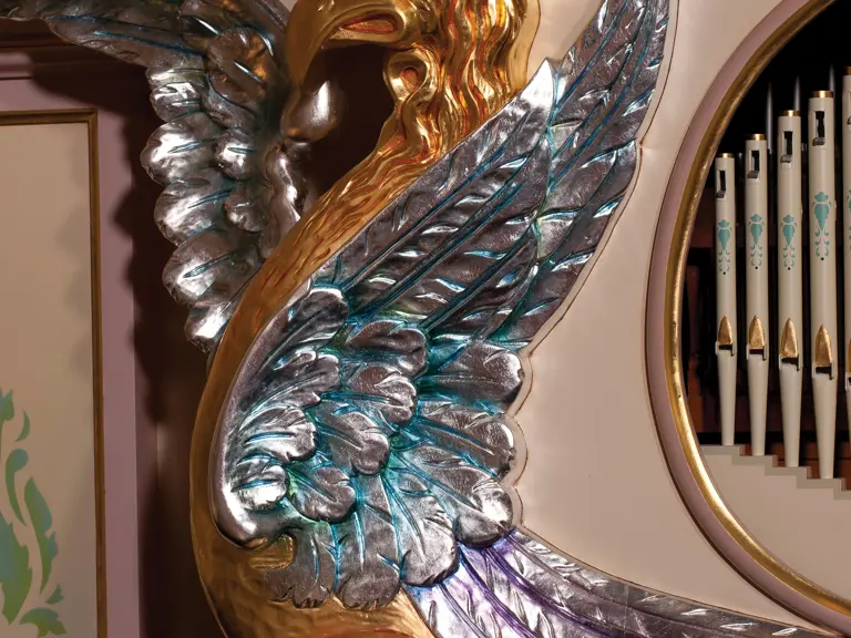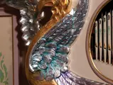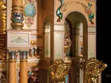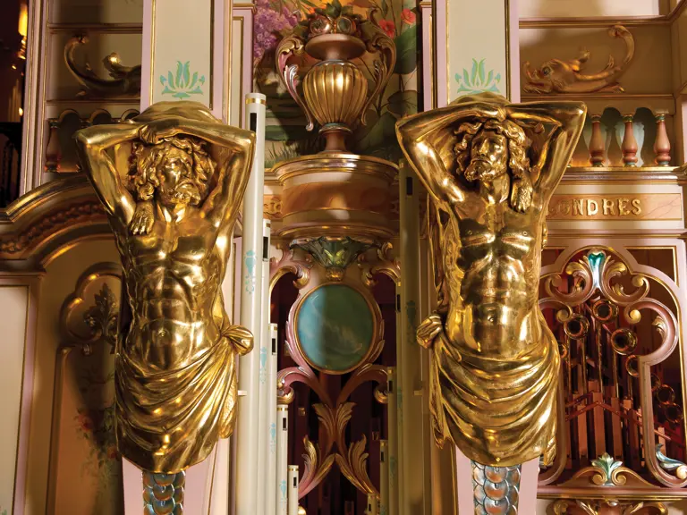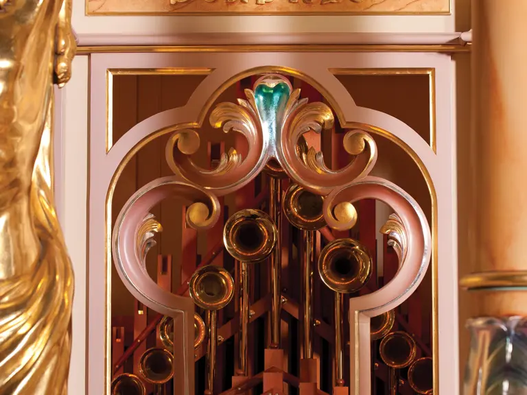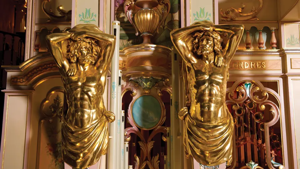This example was found in England mostly intact but with moisture damage. It underwent total restoration by the world-renowned fourth-generation organ expert Johnny Verbeeck and his staff in Belgium, replicating parts as necessary. The musical scale was extended to include a full rank of massive bronze carillon bells, the largest of which weighs about 600 pounds! Attention to detail is extraordinary—from the gold leaf to the four nine-foot tall gold statues. After restoration, Mr. Verbeeck installed the organ and has maintained it in its fine playing condition. It plays either cardboard book music or from a convenient MIDI player. With the organ are 16 very large cardboard music books and 142 MIDI files. The opportunity to acquire a Gaudin organ of this size and spectacular detail will likely never come again!