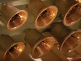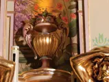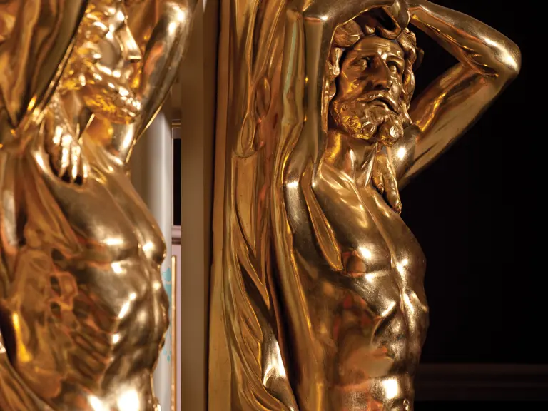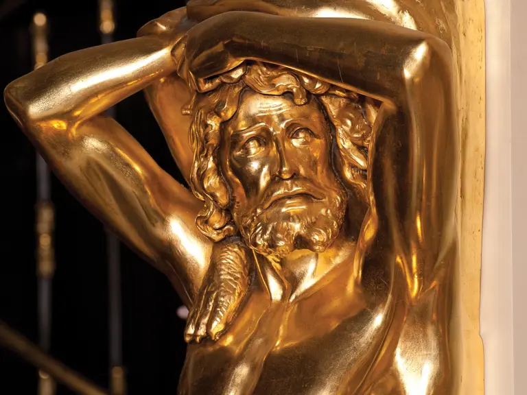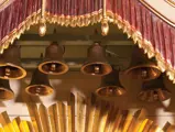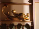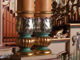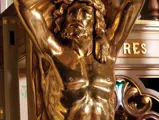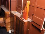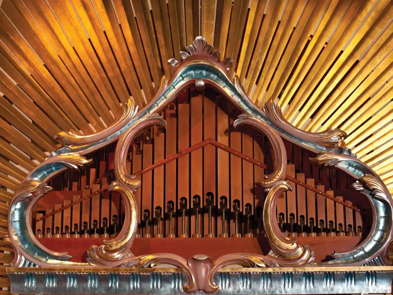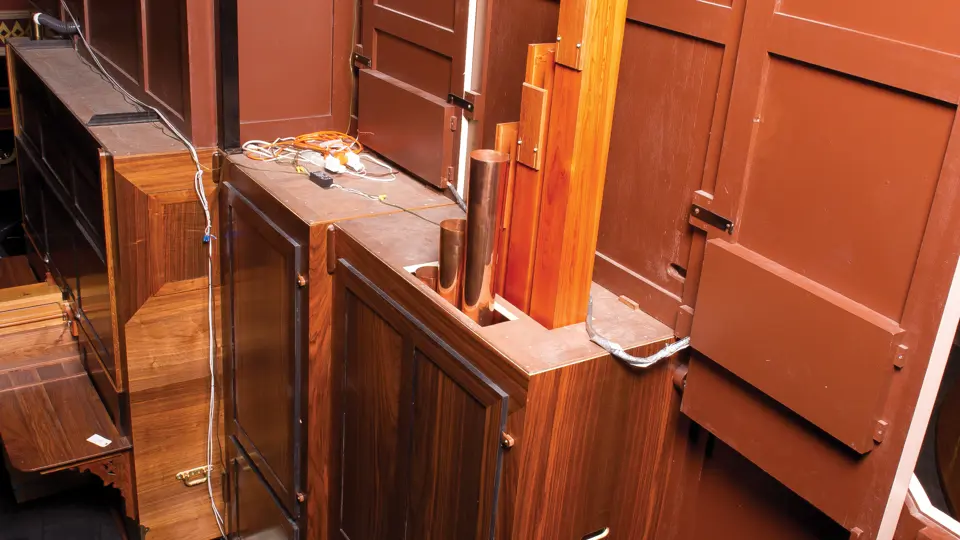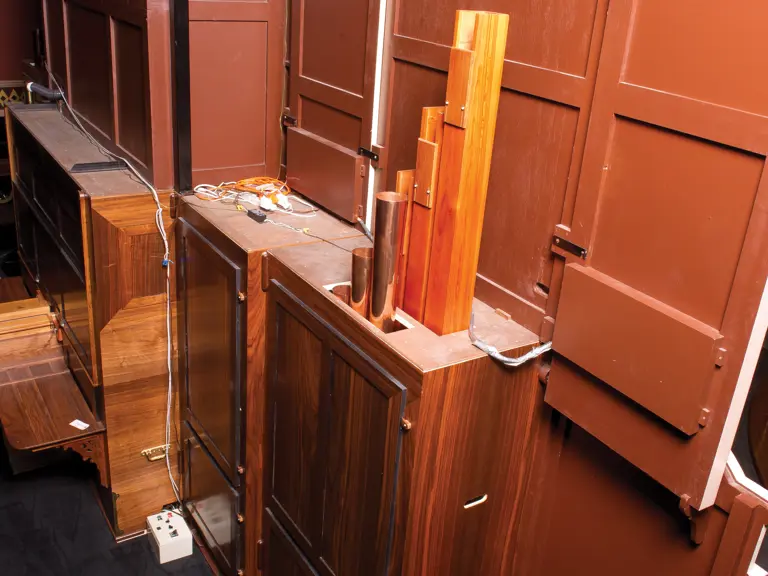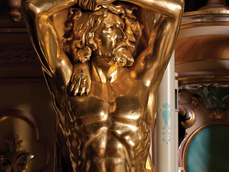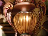 This example was found in England mostly intact but with moisture damage. It underwent total restoration by the world-renowned fourth-generation organ expert Johnny Verbeeck and his staff in Belgium, replicating parts as necessary. The musical scale was extended to include a full rank of massive bronze carillon bells, the largest of which weighs about 600 pounds! Attention to detail is extraordinary—from the gold leaf to the four nine-foot tall gold statues. After restoration, Mr. Verbeeck installed the organ and has maintained it in its fine playing condition. It plays either cardboard book music or from a convenient MIDI player. With the organ are 16 very large cardboard music books and 142 MIDI files. The opportunity to acquire a Gaudin organ of this size and spectacular detail will likely never come again!