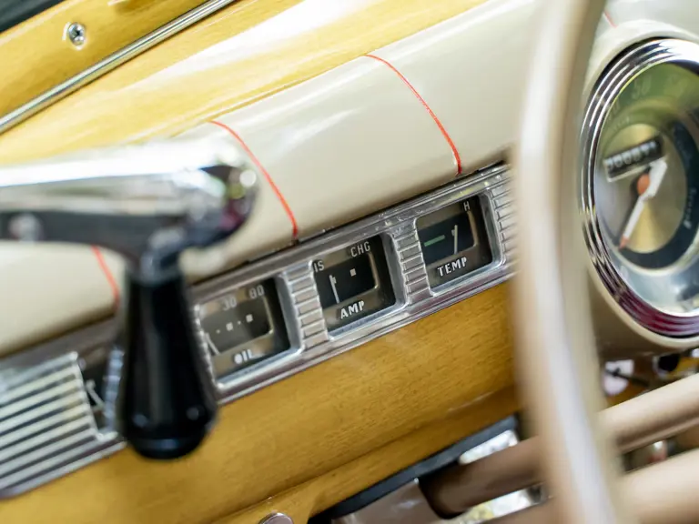 Designer Eugene “Bob” Gregorie designed the Sportsman during World War II. It was the first totally new style approved by Henry Ford II in his role as president of Ford Motor Company. Interiors were similar to the regular convertible, though hydraulic windows were standard. Genuine leather covered the seats in a choice of tan, red, or gray. A chrome steering-wheel horn ring, righthand visor, and door armrest were included. Certainly not an economy model, Sportsmans were listed for $1,982; almost $500 more than the standard convertible. All were equipped with Ford’s 100-horsepower, 239-cubic-inch V-8, and three-speed manual transmission.