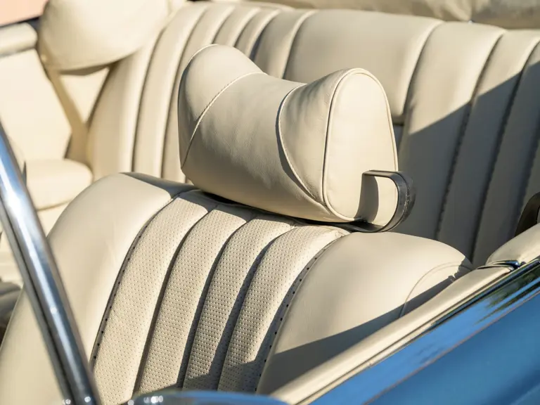 Klockemann, well known in Mercedes-Benz circles for his expertise in both 300 SLs and the myriad W111 models, performed an exceptional bare-metal repaint in the car’s original factory-correct shade of Medium Blue Metallic. The interior was similarly reupholstered as it was when delivered new with Parchment leather. The blue square-weave carpets were substituted for parchment ones, thereby creating a more visually homogenous aesthetic to the luxurious interior. The superb wood inlays on the dash are also worthy of note, having been refinished in burled walnut, which adds a further sense of excess to an already luxury-laden driving machine. Klockemann also lavished this handsome cabriolet with a new top trimmed in dark blue fabric.