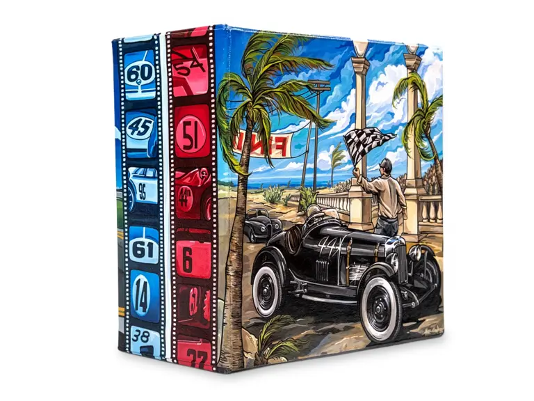 This example, 007, features a slipcase designed by Kate Cook, artist and owner of Asphalt Canvas Custom Art. Cook is known for her unique “ärtəˈmō-tiv® Method,” using inks and automotive enamels to paint canvas, metal, and even buildings. Her slipcase design depicts Brumos across the decades. The front slipcover design features the 2011 Grand-Am Championship Brumos Porsche crossing the finish line at Daytona, while the back depicts Ira Brundage’s Duesenberg-Miller, George Huntoon at the wheel, winning the 1950 Palm Beach Shores Grand Prix. The spine of the slipcover proudly displays the various racing numbers the Brundage and Brumos Porsche team cars donned over the years.
