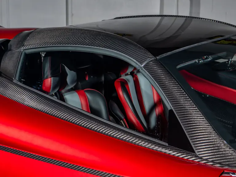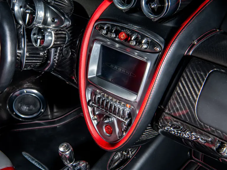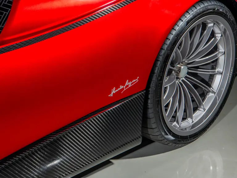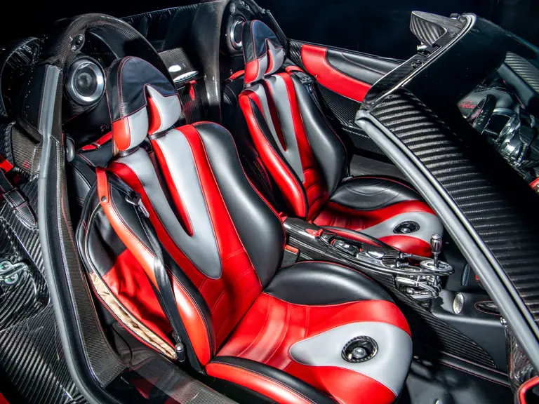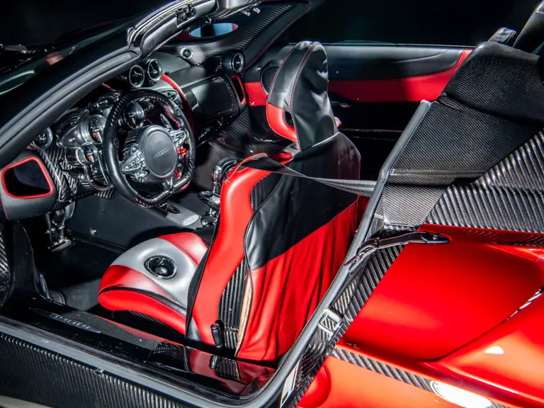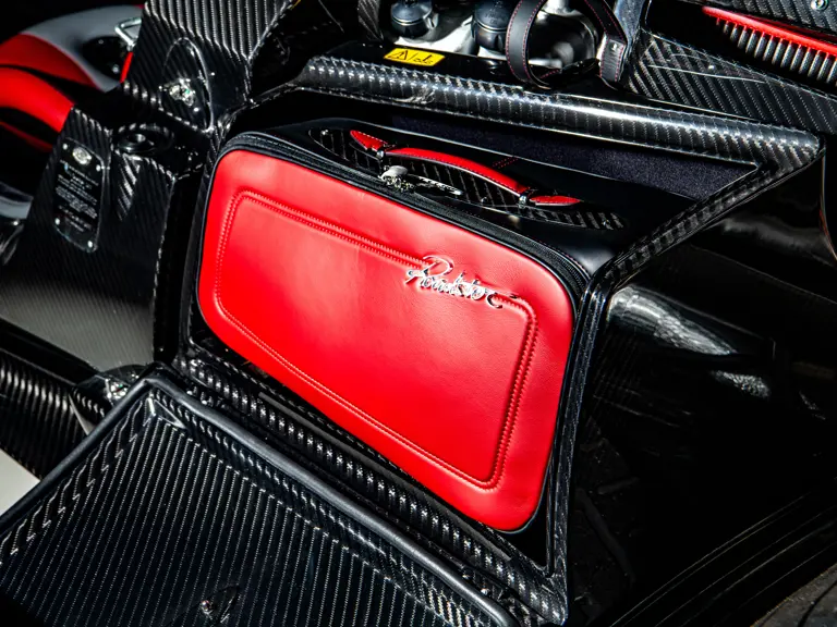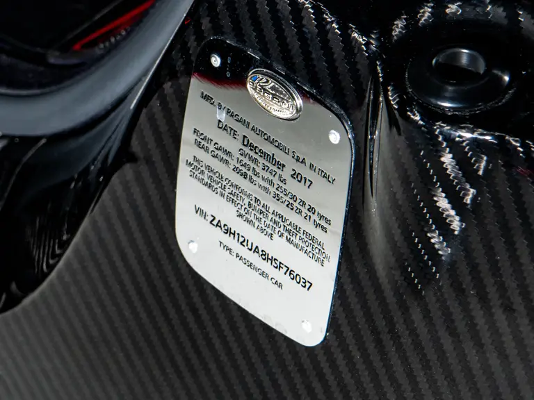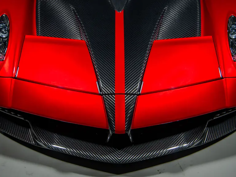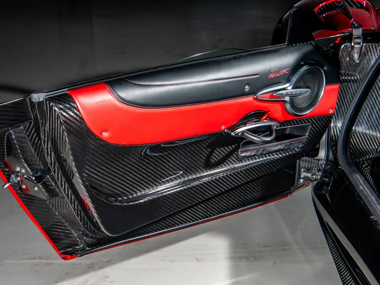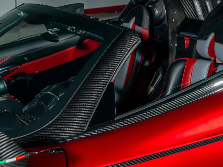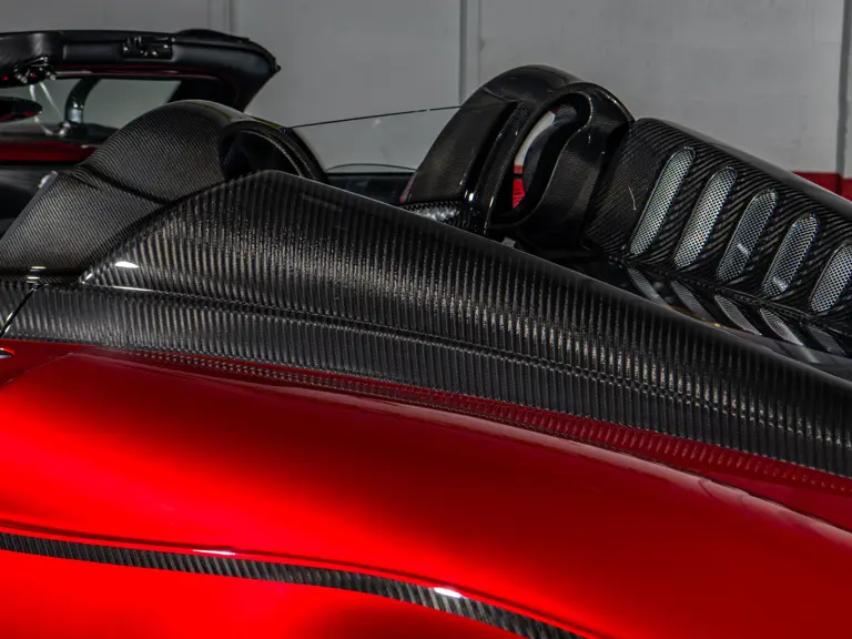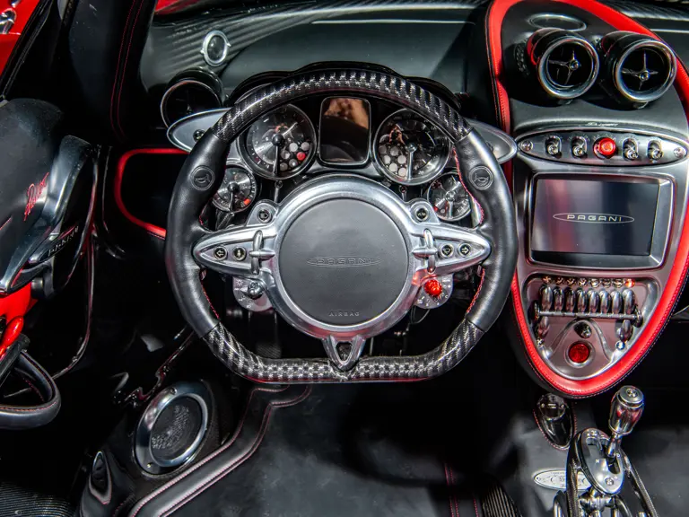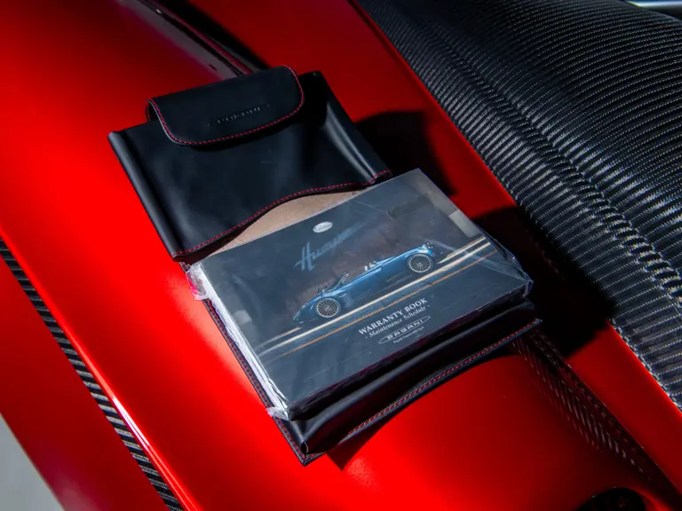 Delivered via Miller Motorcars of Greenwich, Connecticut, this Huayra Roadster has been owned by just one dedicated collector from new. As noted by its window sticker, the total MSRP for this chassis was €2,604,110, or the equivalent of over $3,100,000 at the time. Its exterior is finished in striking Rosso Dubai. A custom stripe of exposed carbon fiber runs along the side character line from the front to the rear of the car; this bold accent that pays tribute to Horacio Pagani’s signature material, which is also extensively featured in exposed form on the front splitter, the marque’s famous leaf-shaped mirrors, the rear end and diffuser, the lower portion’s of the car’s sides, the windshield surround, and the hardtop, as well as throughout the cabin.