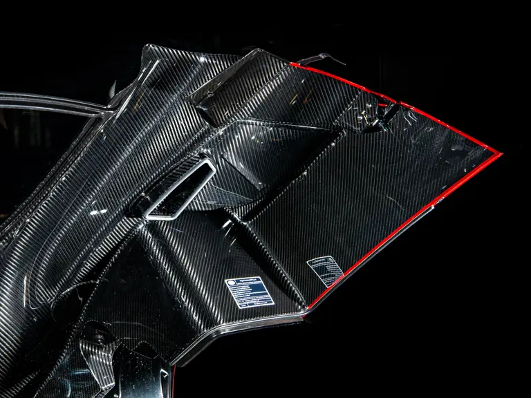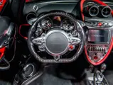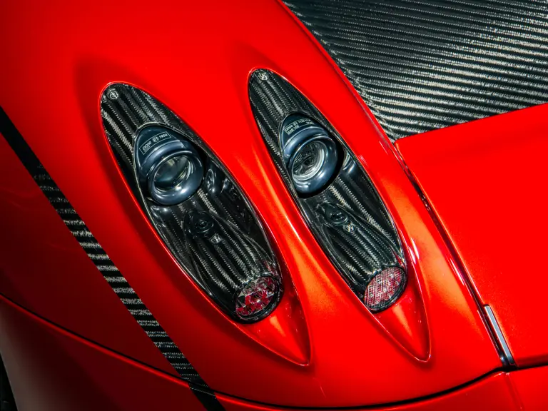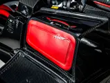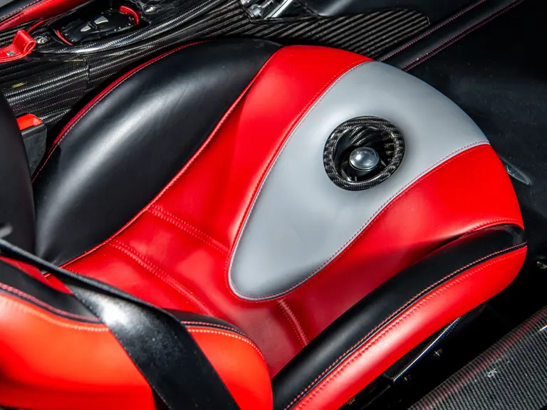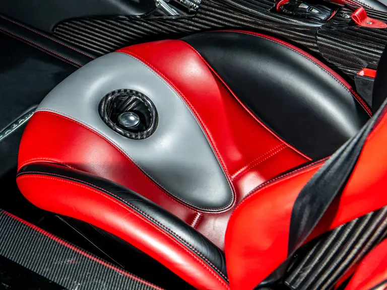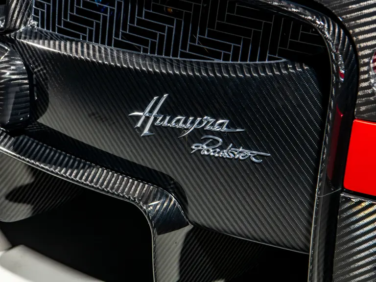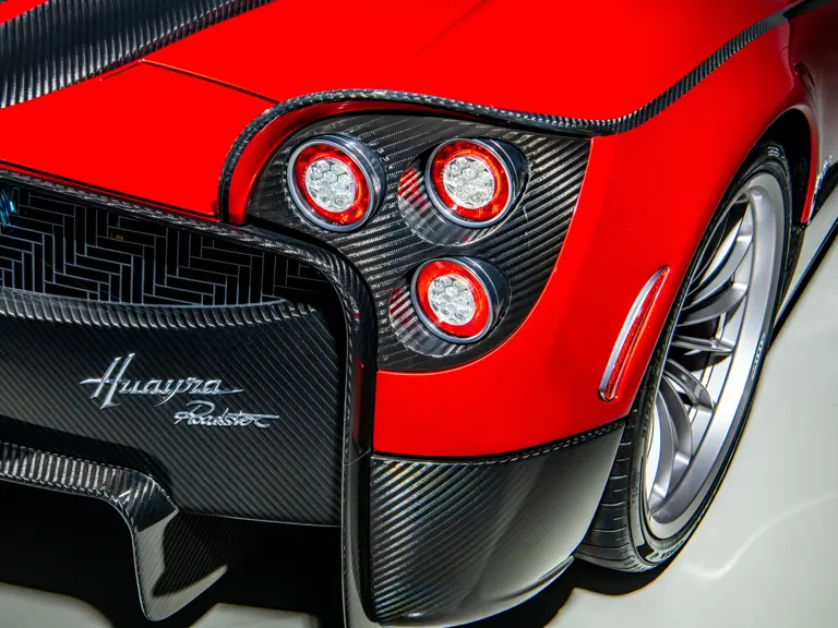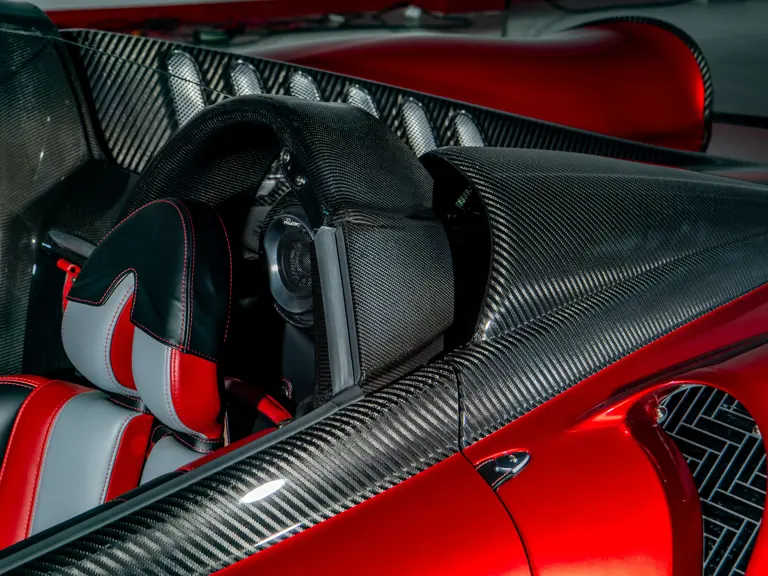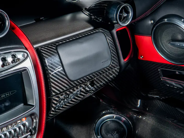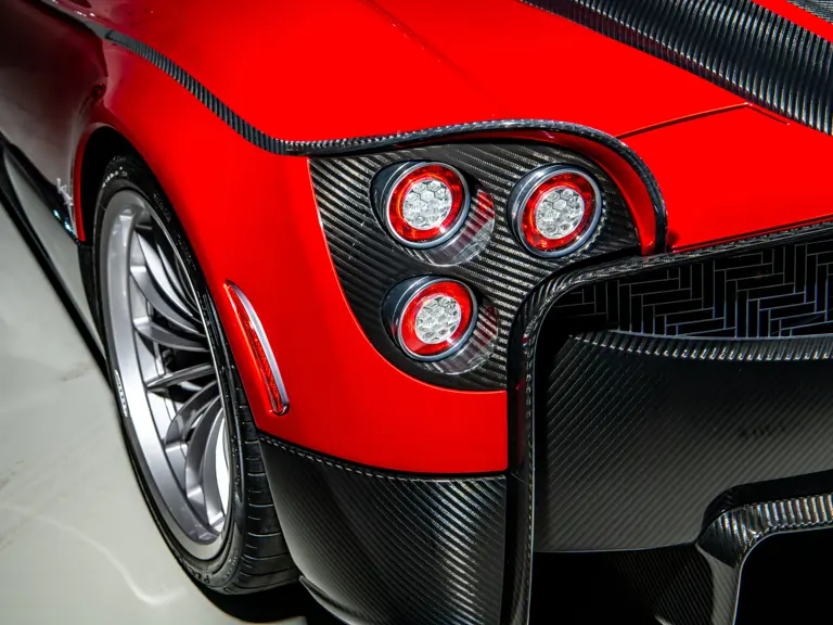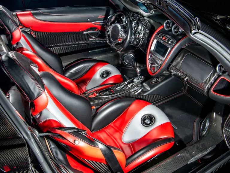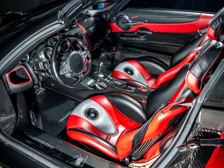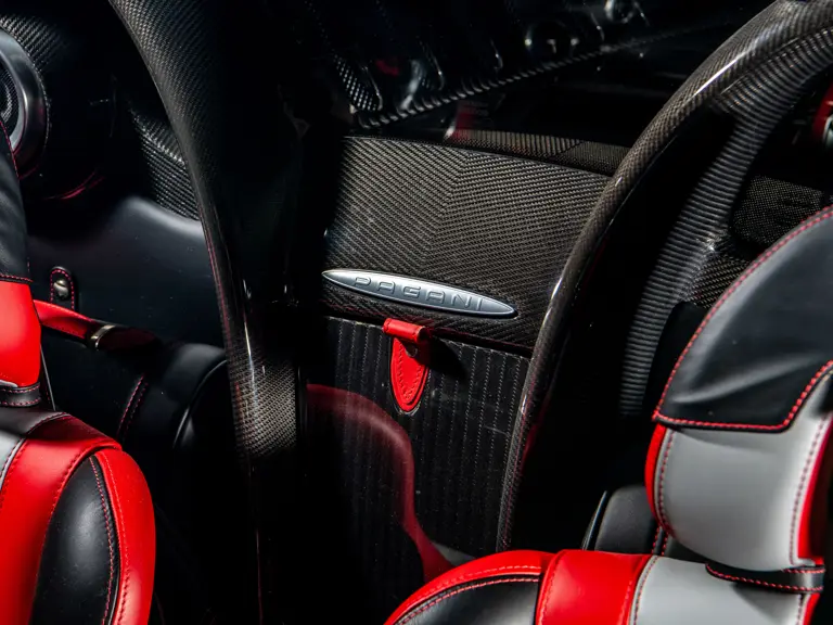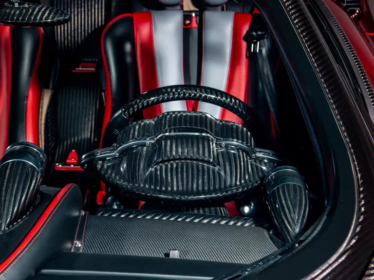 Delivered via Miller Motorcars of Greenwich, Connecticut, this Huayra Roadster has been owned by just one dedicated collector from new. As noted by its window sticker, the total MSRP for this chassis was €2,604,110, or the equivalent of over $3,100,000 at the time. Its exterior is finished in striking Rosso Dubai. A custom stripe of exposed carbon fiber runs along the side character line from the front to the rear of the car; this bold accent that pays tribute to Horacio Pagani’s signature material, which is also extensively featured in exposed form on the front splitter, the marque’s famous leaf-shaped mirrors, the rear end and diffuser, the lower portion’s of the car’s sides, the windshield surround, and the hardtop, as well as throughout the cabin.