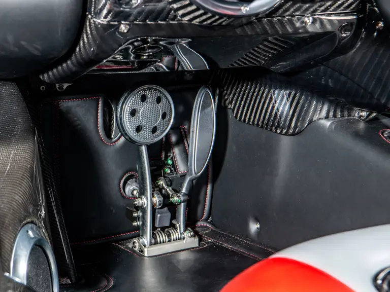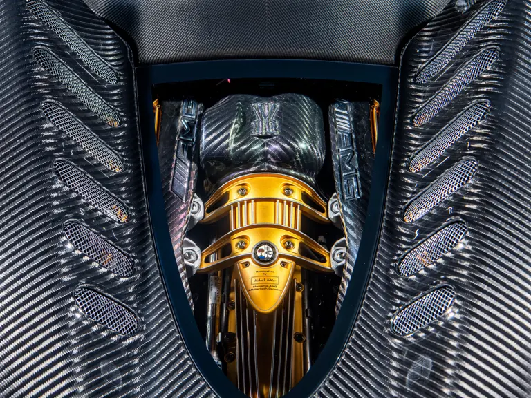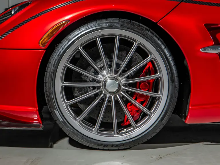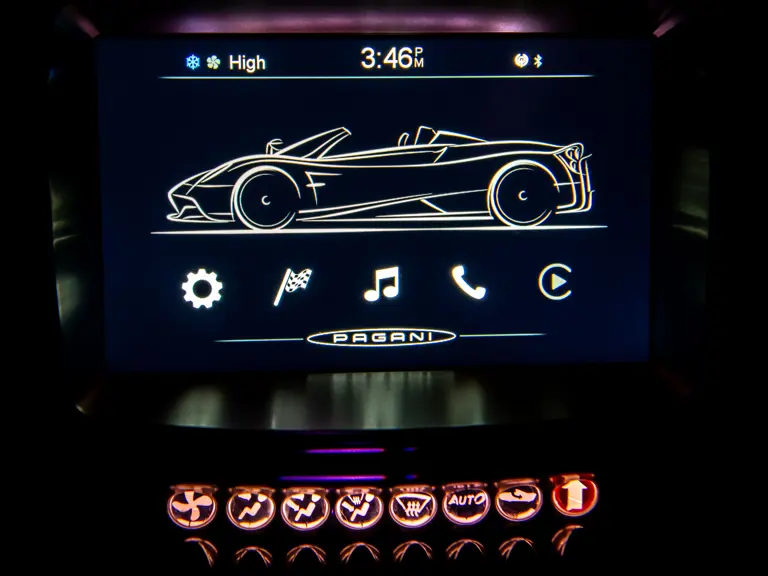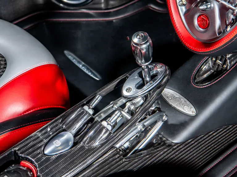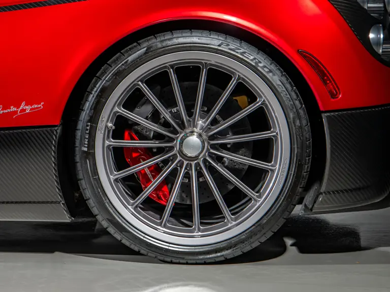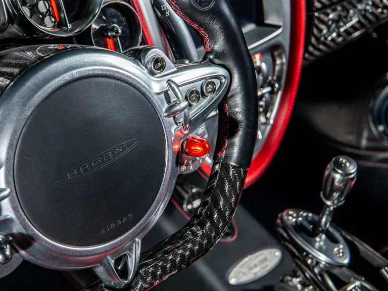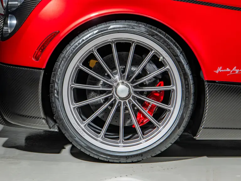 An AMG-sourced twin-turbocharged V-12 engine built specifically for Pagani in Germany by Michael Kübler produced over 700 horsepower, while a seven-speed sequential gearbox with an unusual single-disc clutch configuration was chosen for its rapid gear changes and its remarkably low weight. Massive Brembo-sourced four-piston front and rear brakes grab the 15-inch drilled carbon ceramic brakes to bring the car to a halt reliably, consistently, and above all, exceptionally rapidly.