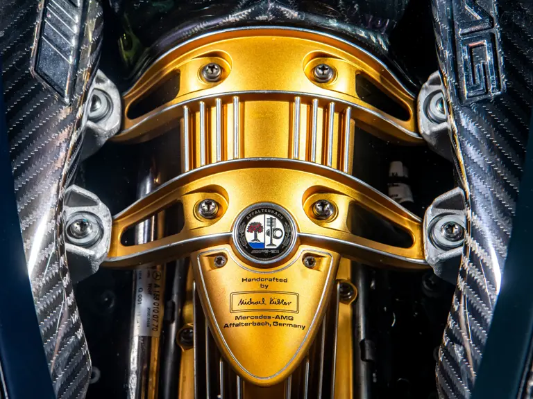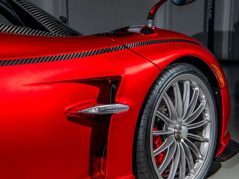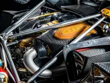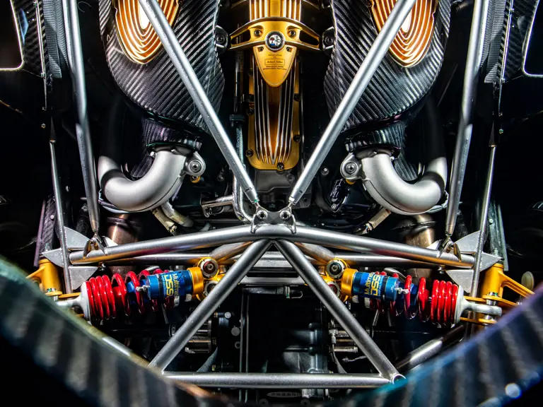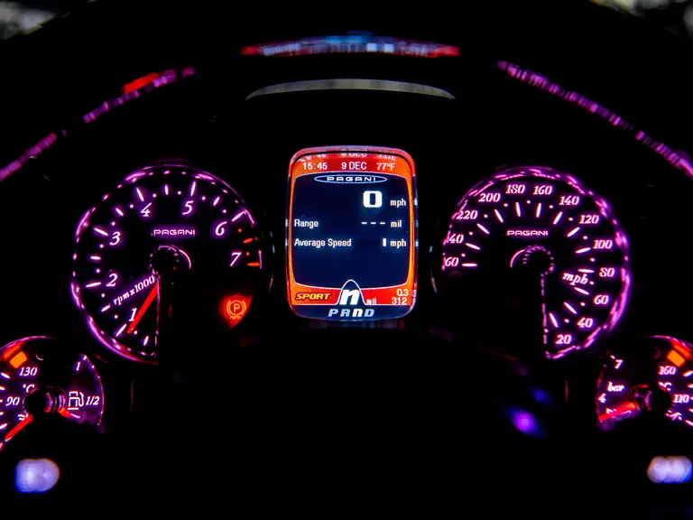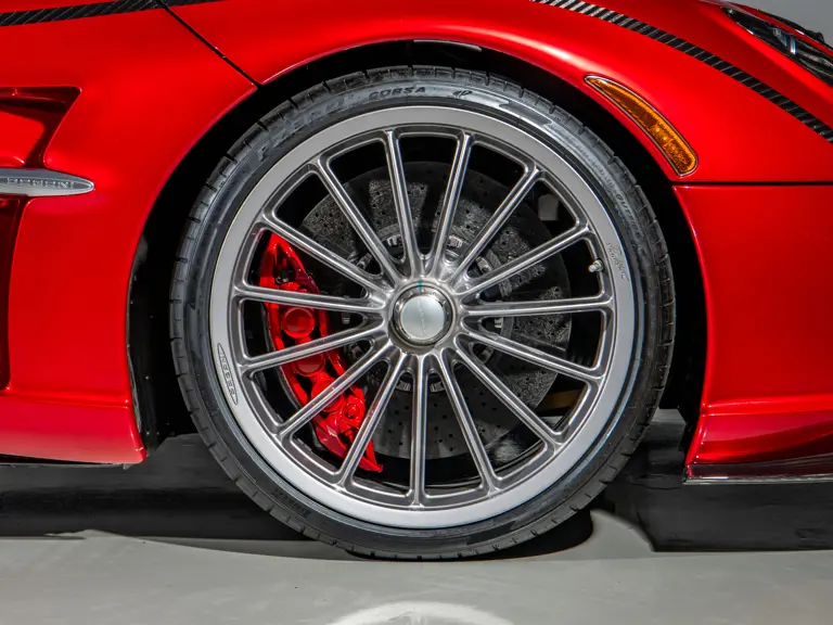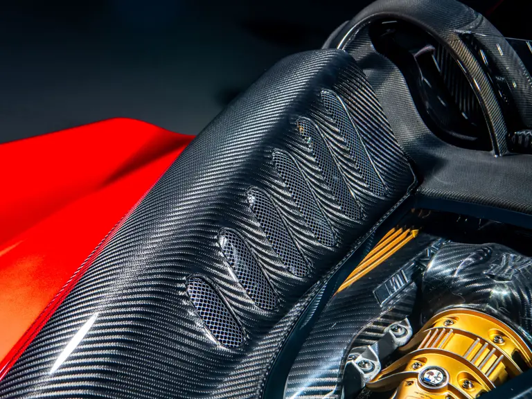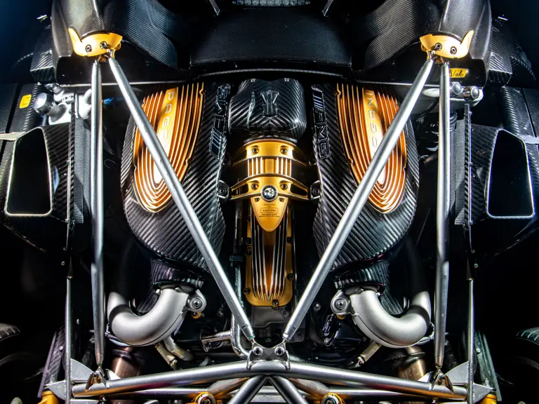 An AMG-sourced twin-turbocharged V-12 engine built specifically for Pagani in Germany by Michael Kübler produced over 700 horsepower, while a seven-speed sequential gearbox with an unusual single-disc clutch configuration was chosen for its rapid gear changes and its remarkably low weight. Massive Brembo-sourced four-piston front and rear brakes grab the 15-inch drilled carbon ceramic brakes to bring the car to a halt reliably, consistently, and above all, exceptionally rapidly.