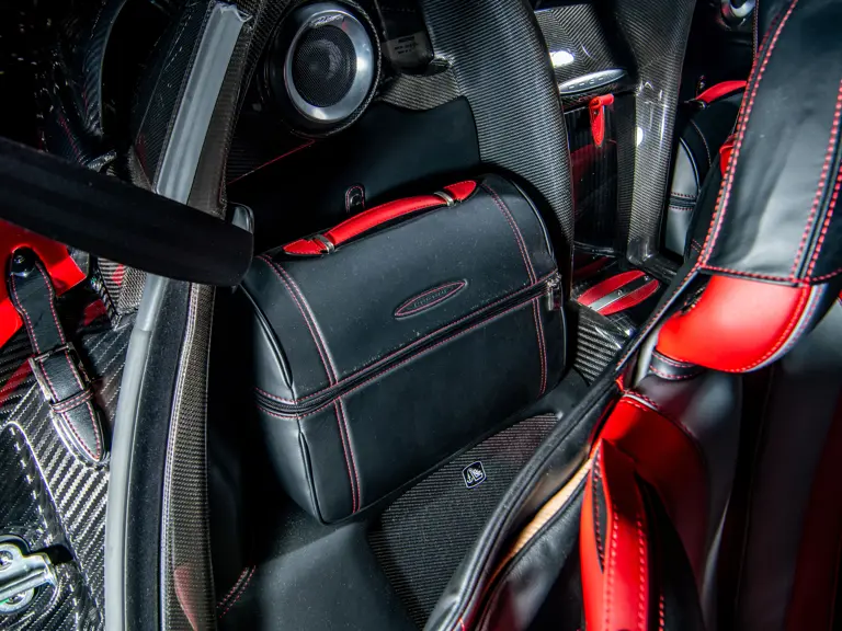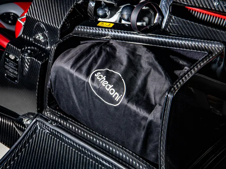In addition to a standard, lightweight Inconel titanium exhaust system, carbon ceramic brakes, and a front lifting system, this roadster benefits from optional instrument clusters in Black, Titanium-finish Huayra-style wheels, and interior and exterior Titanium-finish aluminum for a cohesive look. As a finishing touch, the build included a set of two-tone Schedoni luggage (itself an option costing over $25,000), which neatly tucks behind the two seats and into special compartments beneath the rear cover.
