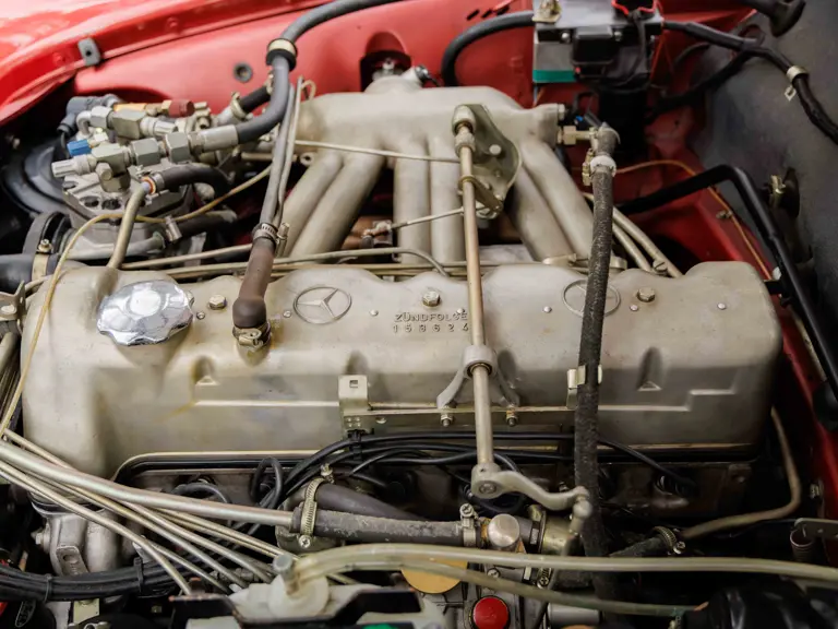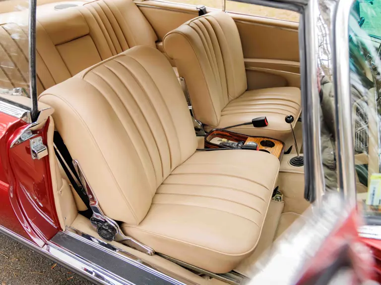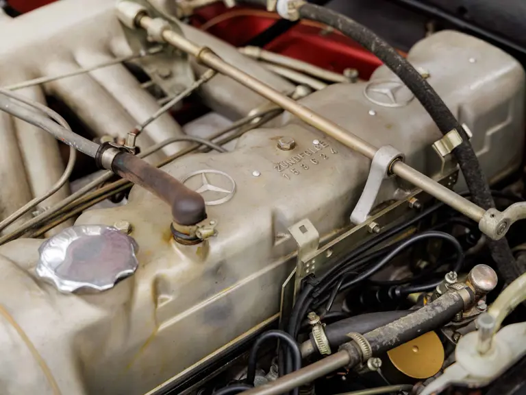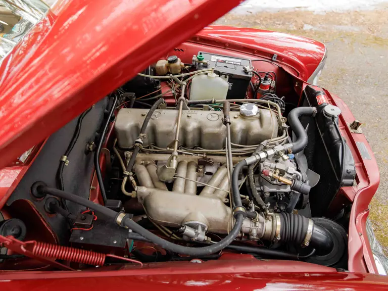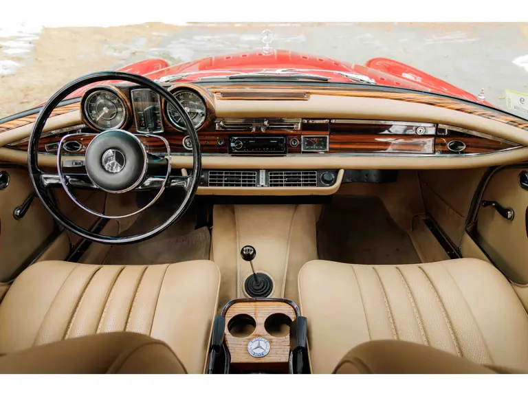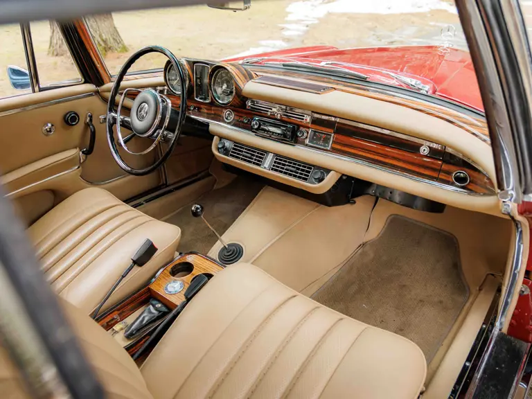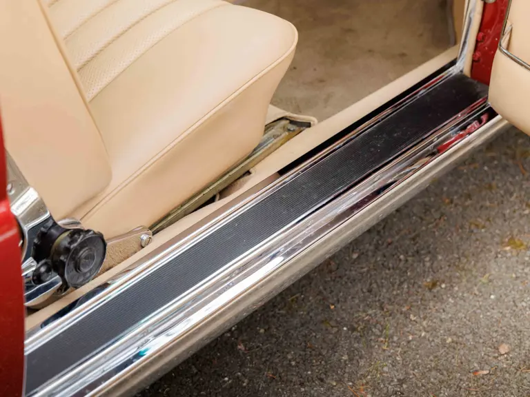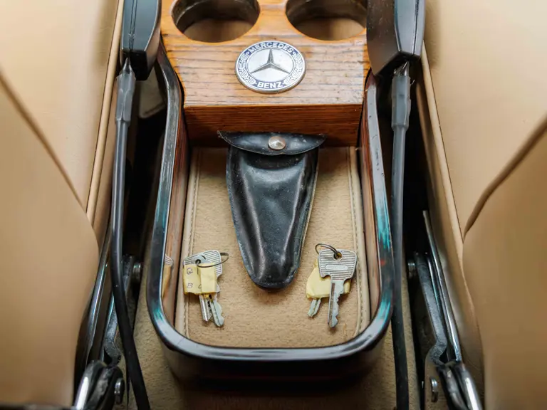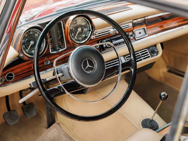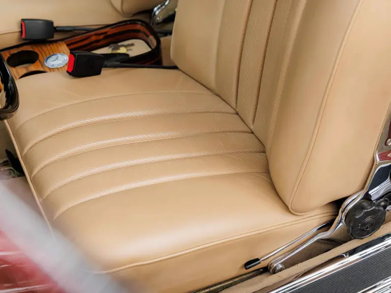 Beginning in 2013, the car underwent a comprehensive, ground-up restoration by Riga Master Workshop in Latvia. Scores of accompaning photographs document its careful disassembly to the bare metal chassis, followed by detailed metalwork and a refinish in its factory-correct Hellrot, or Light Red (DB-519). The restoration continued with a complete overhaul of all mechanical and electrical systems, including rebuilding the engine, transmission, rear axle, suspension, and brakes. Further work included new wiring, replated brightwork, a period-correct upgraded air conditioning system, and all-new beige leather upholstery by Leder-Reinhardt. The car is also equipped with a modern Blaupunkt AM/FM CD stereo, with a correct-type Becker Europa unit included with the sale.