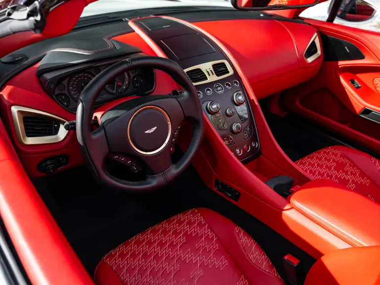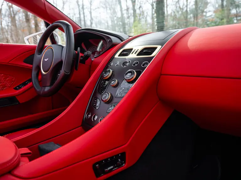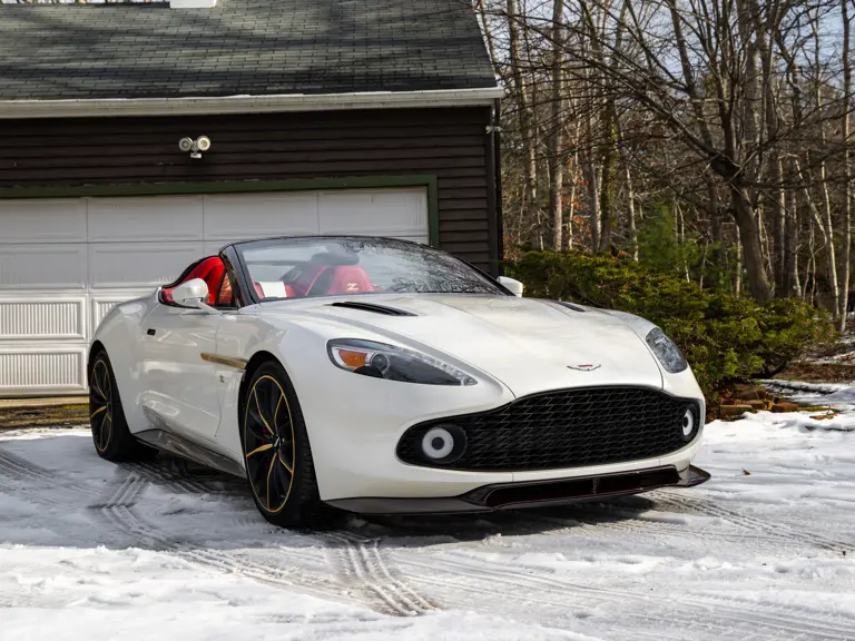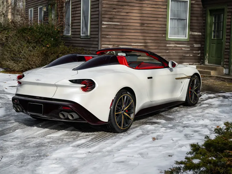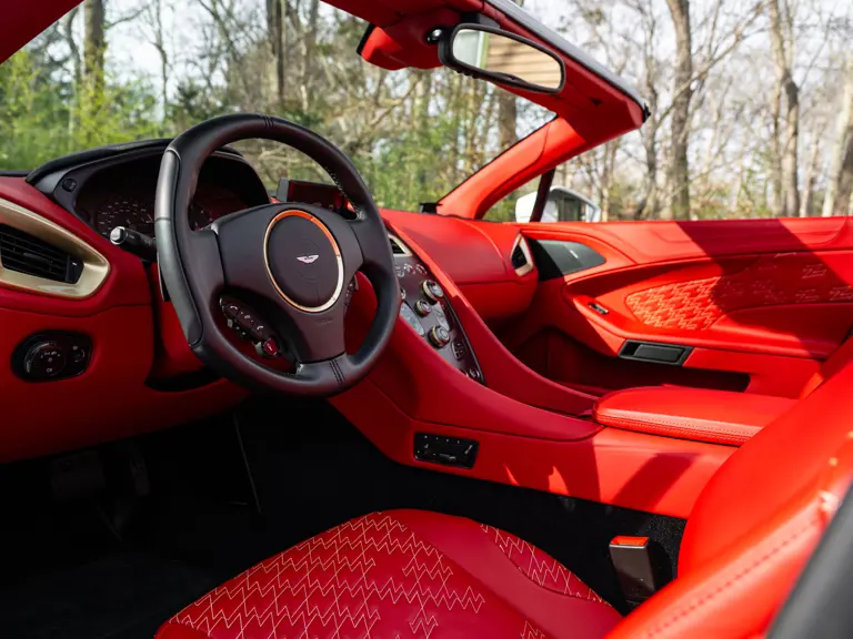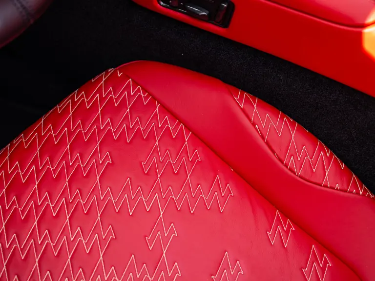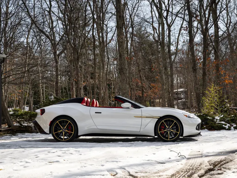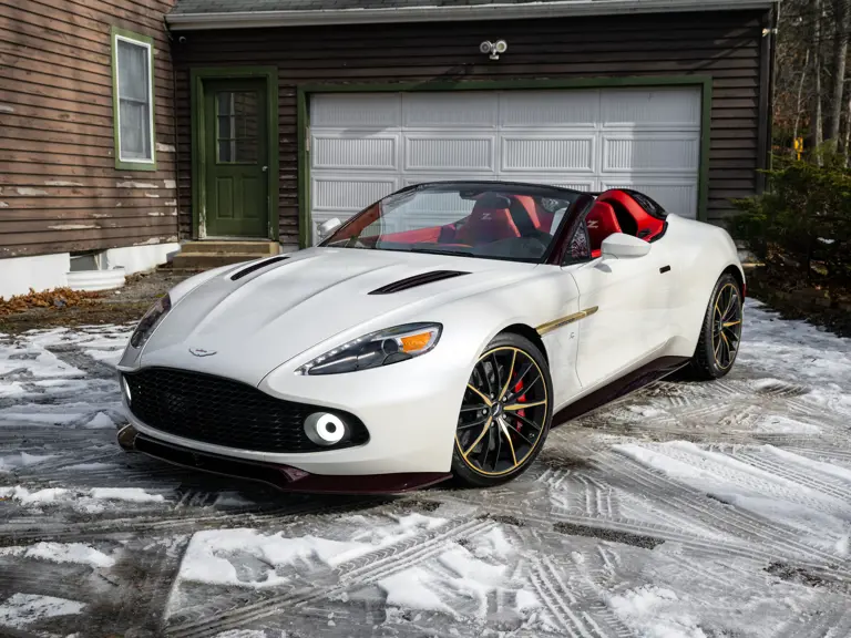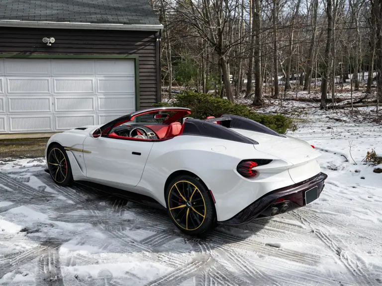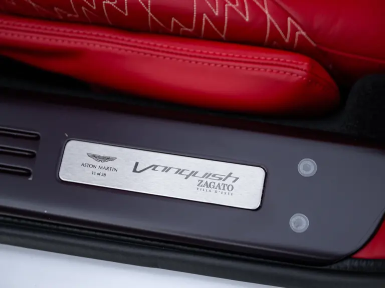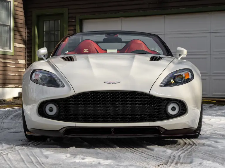 Numbered as the 11th of just 28 examples constructed, this striking Vanquish Zagato Speedster is presented from the care of its original owner, an Aston Martin VIP client. Finished in a bespoke specification of Morning Frost White over Obsidian Black and Spicy Red Z-quilted leather with Winter Wheat embroidery, the car reflects an extraordinary level of personalization. Equipped with nearly $140,000 in factory options, this Speedster features the coveted Villa d’Este package, which includes 20-inch 15-spoke satin black diamond-turned alloy wheels with a bronze tint, bronzed anodized side strakes, and gloss black window trim. Additional highlights include a One-77 steering wheel, carbon fiber paddle shifters, red brake calipers, red-tinted carbon fiber trim, leather-wrapped A-pillars, and distinctive Z-pattern front and rear grilles. The grilles alone represent a $45,000 option, each machined from a single solid block of aluminum.