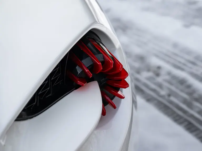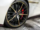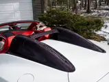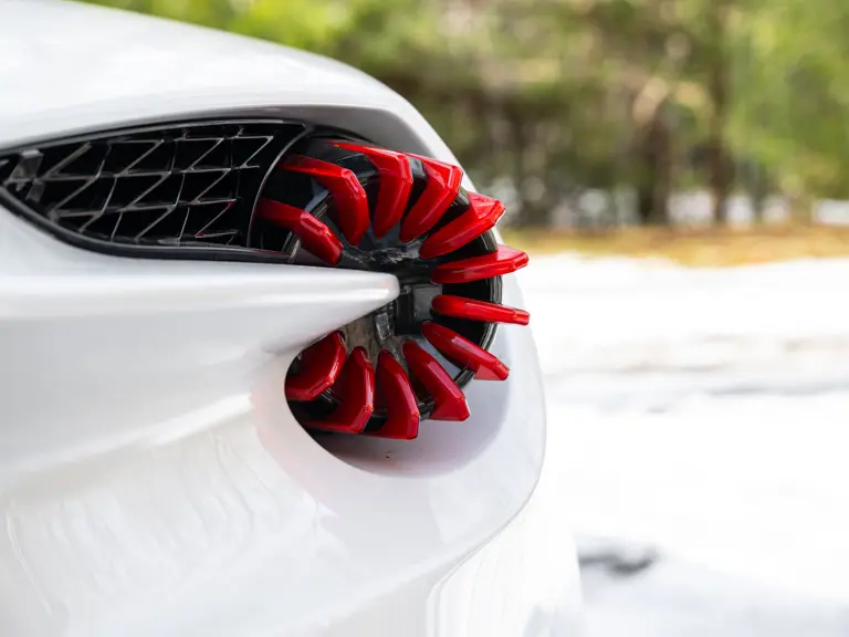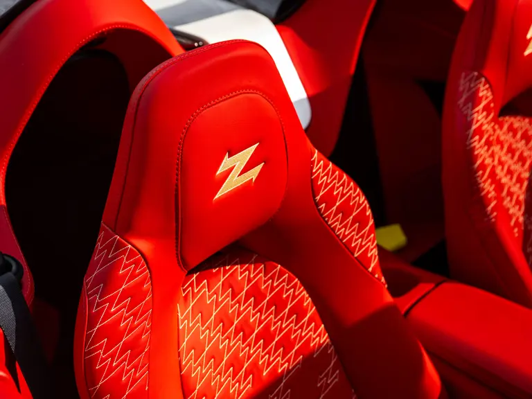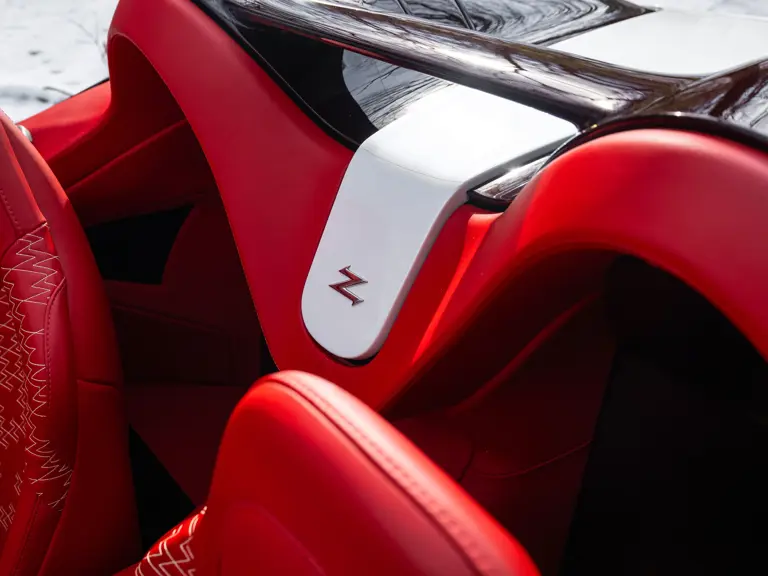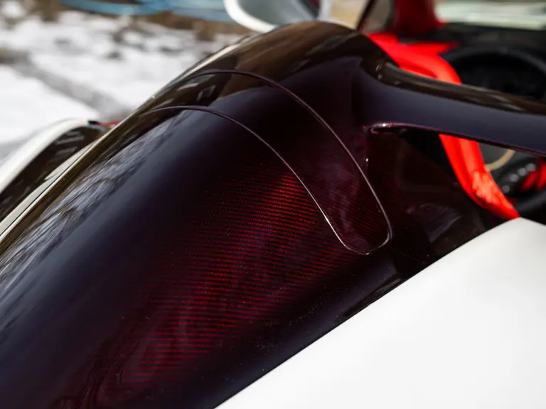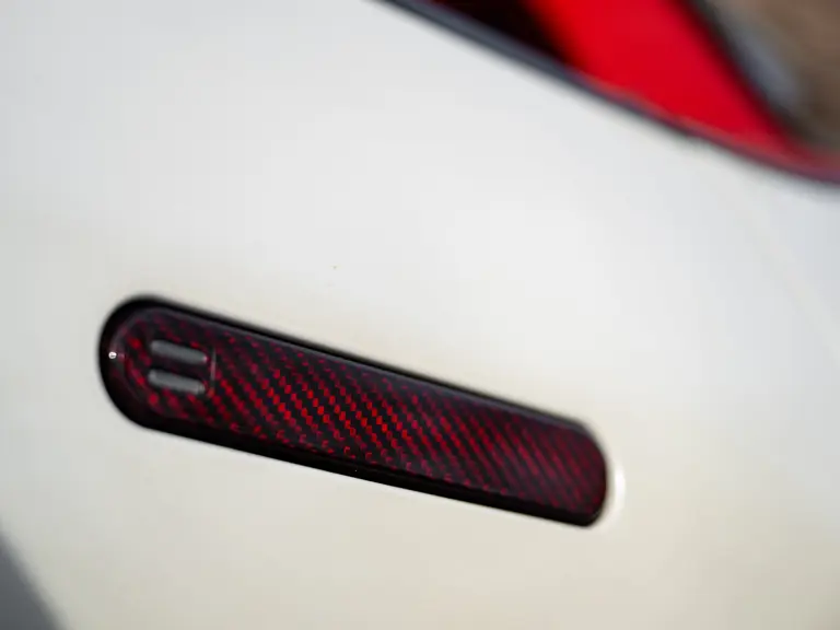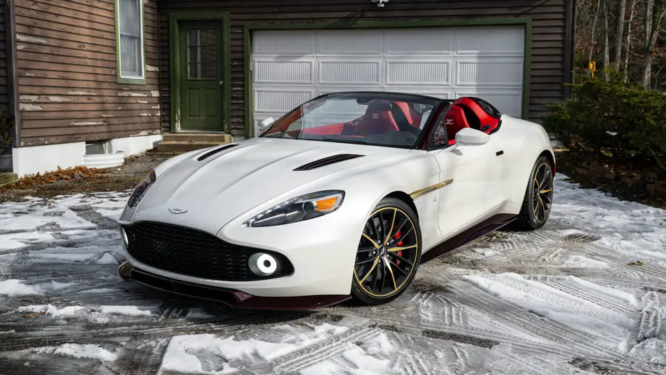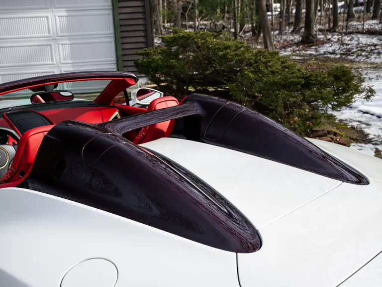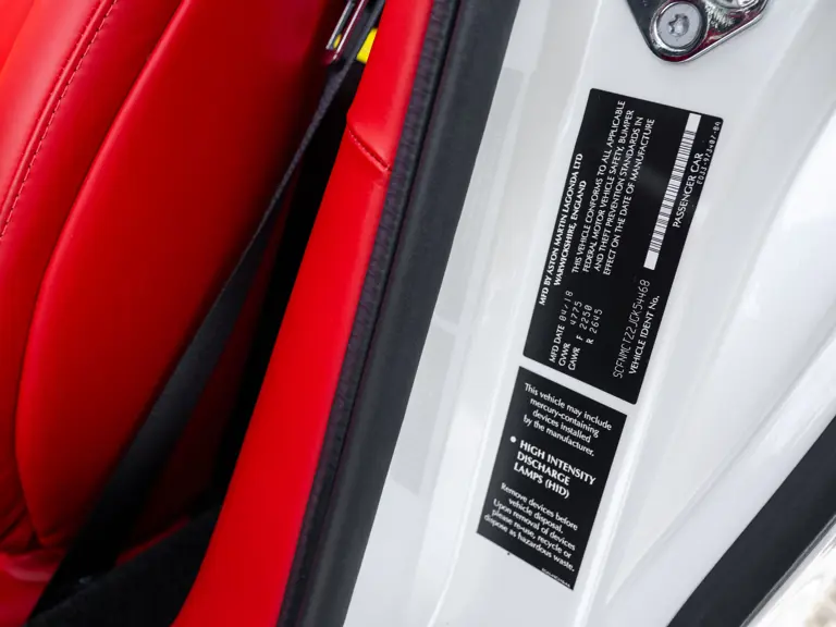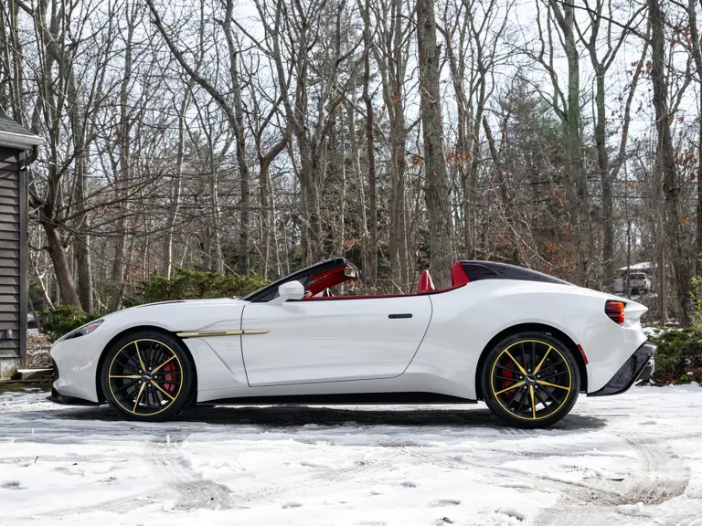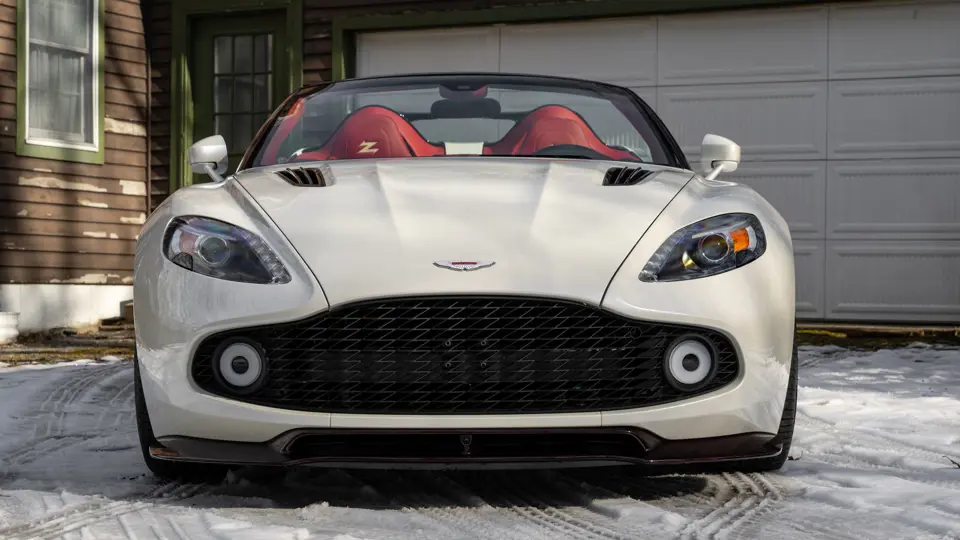 Numbered as the 11th of just 28 examples constructed, this striking Vanquish Zagato Speedster is presented from the care of its original owner, an Aston Martin VIP client. Finished in a bespoke specification of Morning Frost White over Obsidian Black and Spicy Red Z-quilted leather with Winter Wheat embroidery, the car reflects an extraordinary level of personalization. Equipped with nearly $140,000 in factory options, this Speedster features the coveted Villa d’Este package, which includes 20-inch 15-spoke satin black diamond-turned alloy wheels with a bronze tint, bronzed anodized side strakes, and gloss black window trim. Additional highlights include a One-77 steering wheel, carbon fiber paddle shifters, red brake calipers, red-tinted carbon fiber trim, leather-wrapped A-pillars, and distinctive Z-pattern front and rear grilles. The grilles alone represent a $45,000 option, each machined from a single solid block of aluminum.