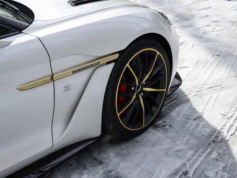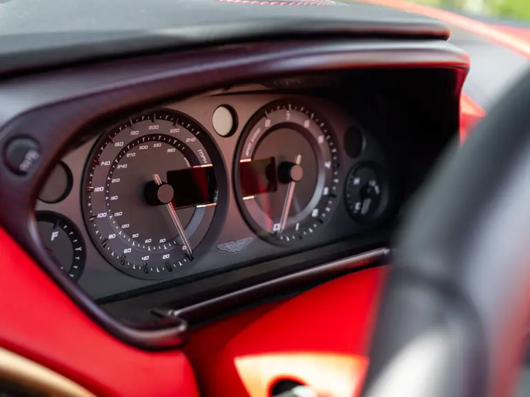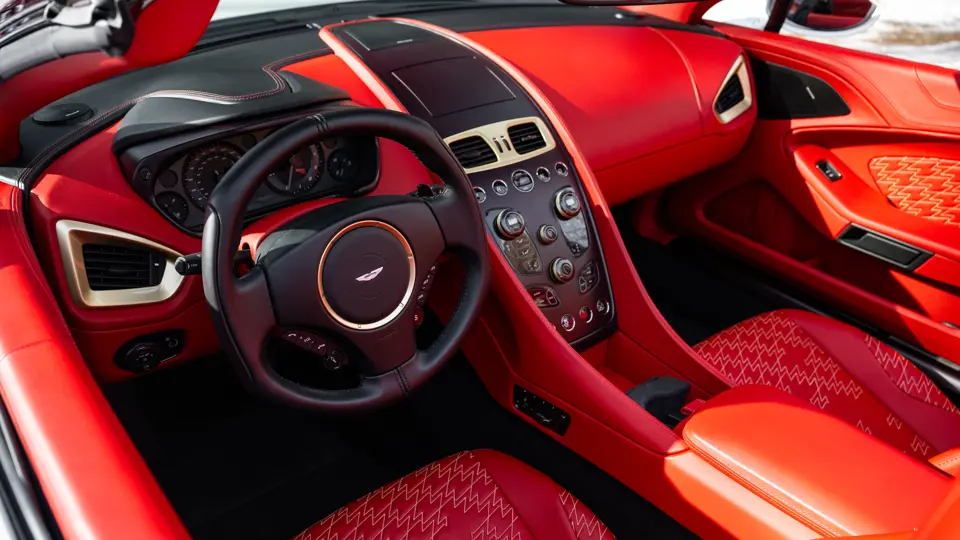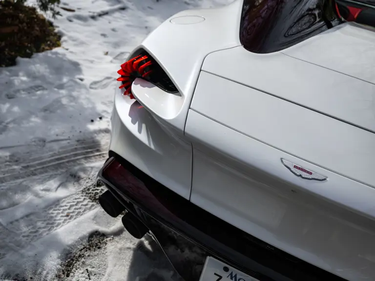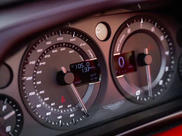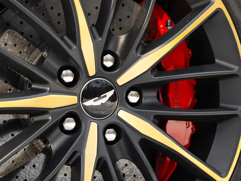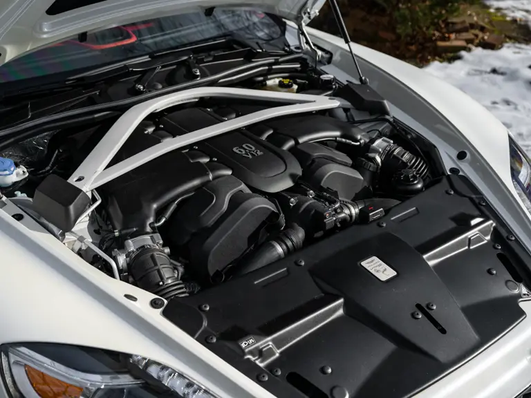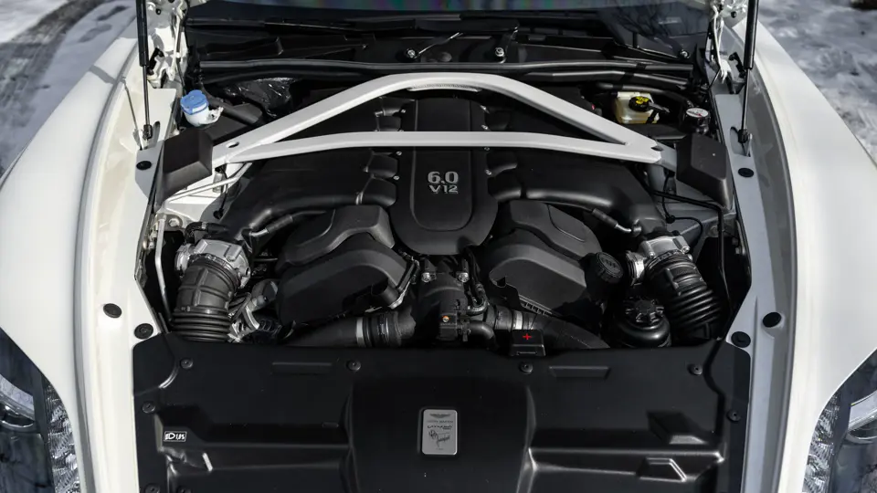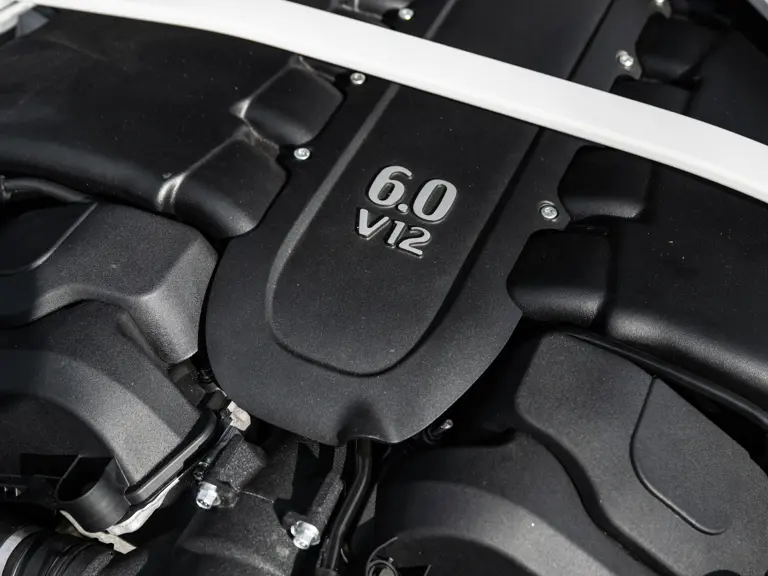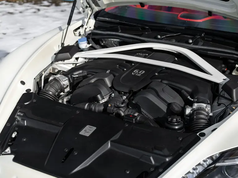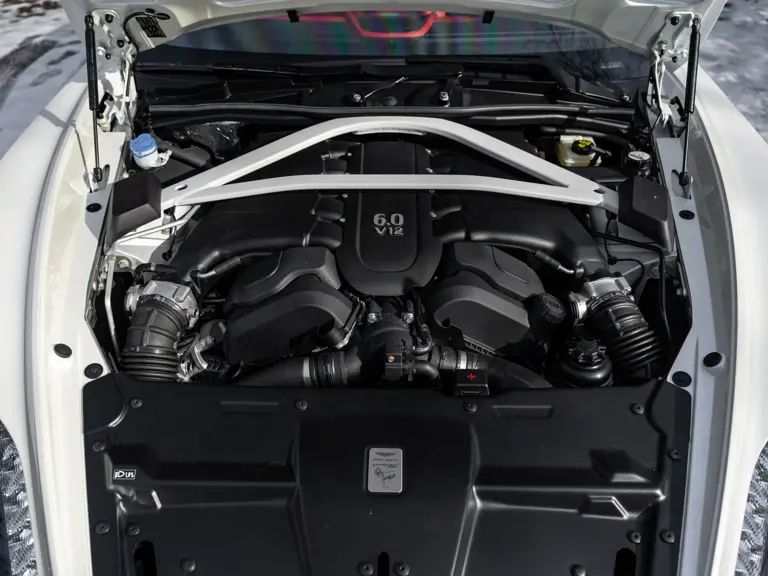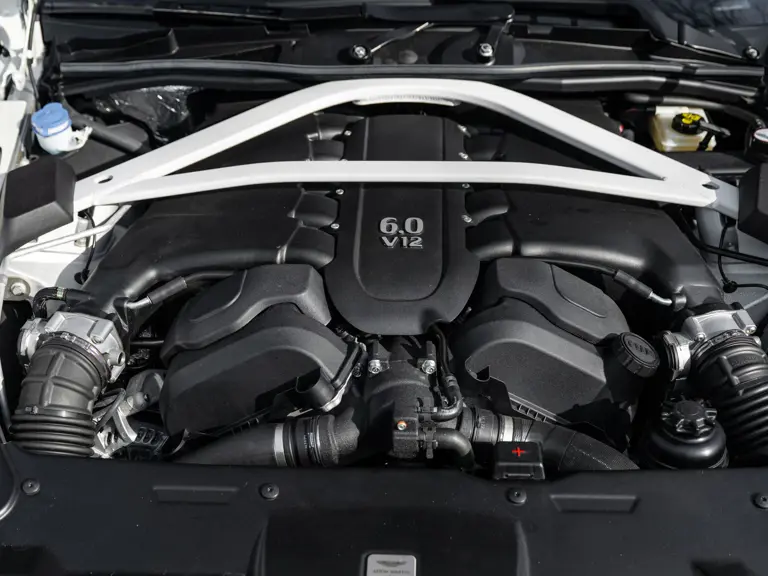 - Powered by Aston Martin’s venerable 5.9-liter, naturally aspirated V-12 rated at 592 horsepower