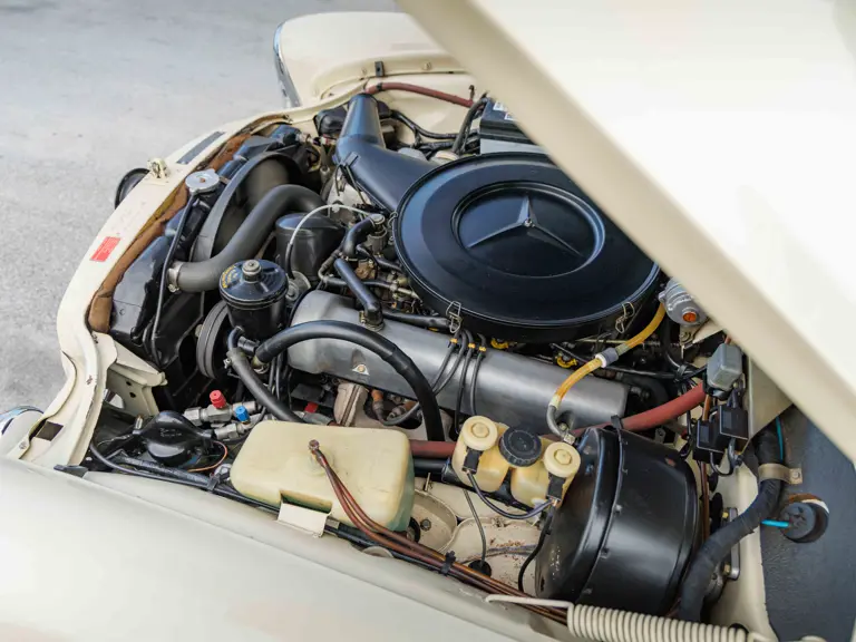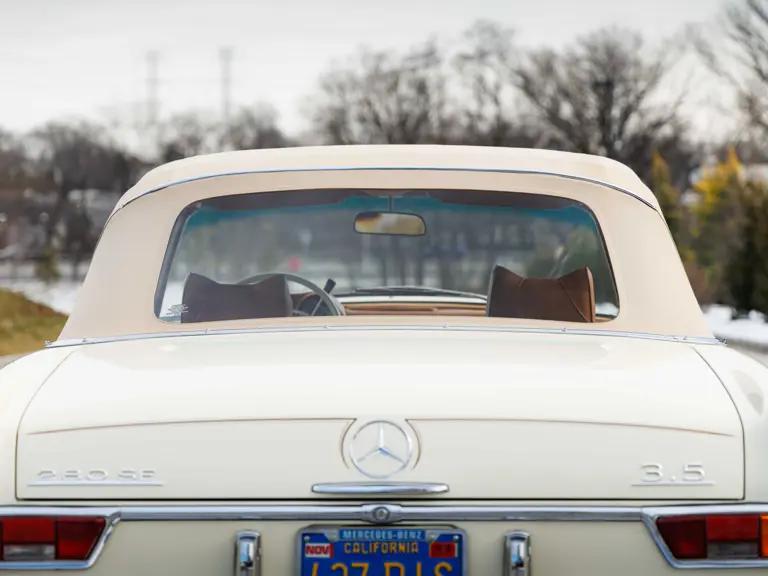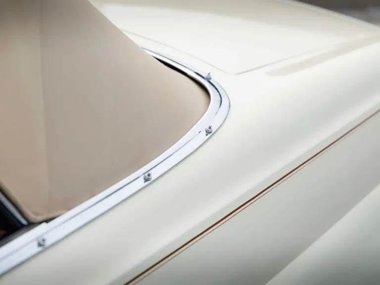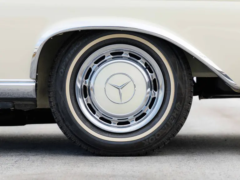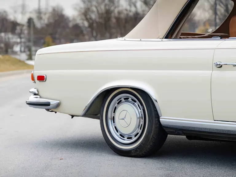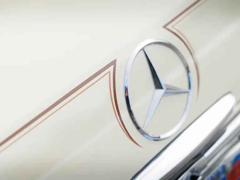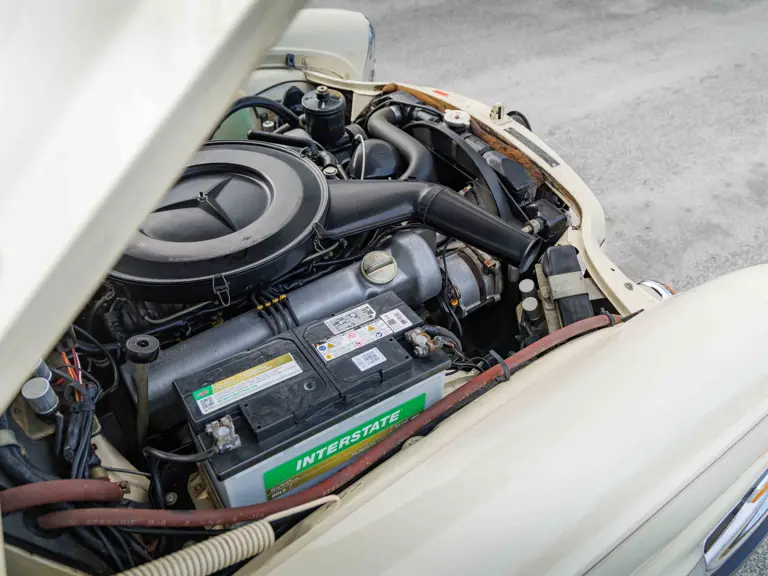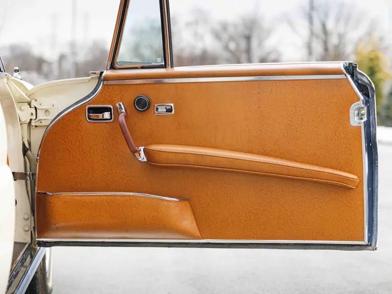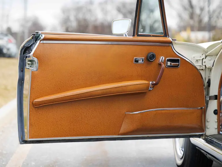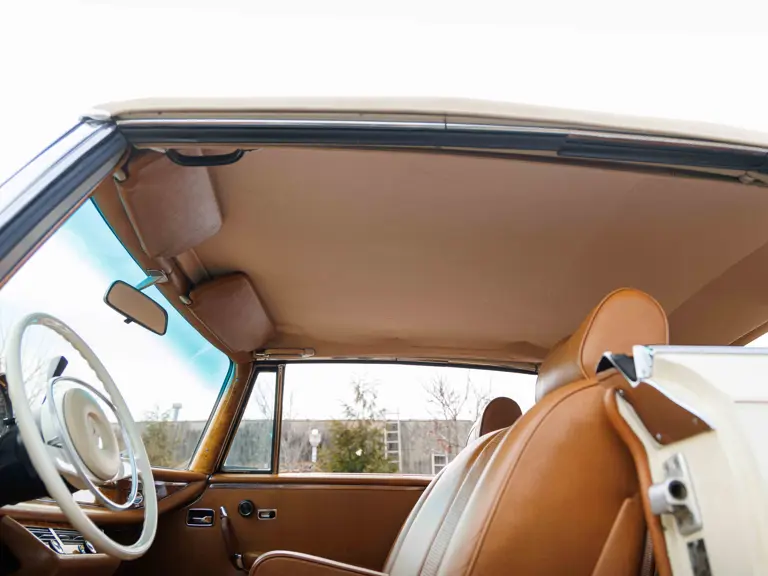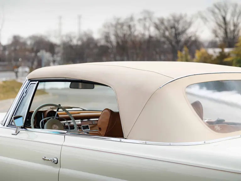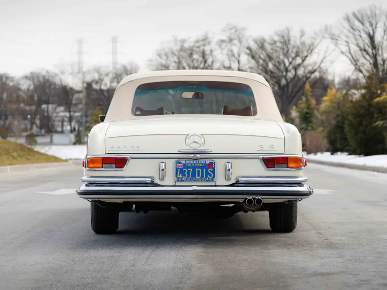 After four decades with its original owner, the Cabriolet was sold to Mercedes-Benz specialist Scott Melnick, who refreshed the Cognac leather interior and beige soft top before selling it to a prominent American automotive collection in 2016. The car has since been carefully enjoyed and meticulously maintained, with service invoices documenting regular upkeep prior to the consignor’s acquisition in 2022. Since then, the consignor has added a beltline pinstripe and chrome wheel lip trim moldings for a subtle, yet striking touch of flair. The car is accompanied by its original data card, owner identification plate, window sticker, manuals, service booklet, trim tag, tool roll, and California registration records tracing its history back to the original purchase.