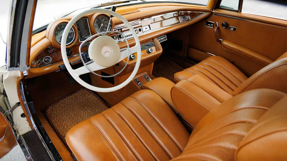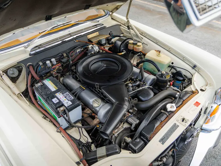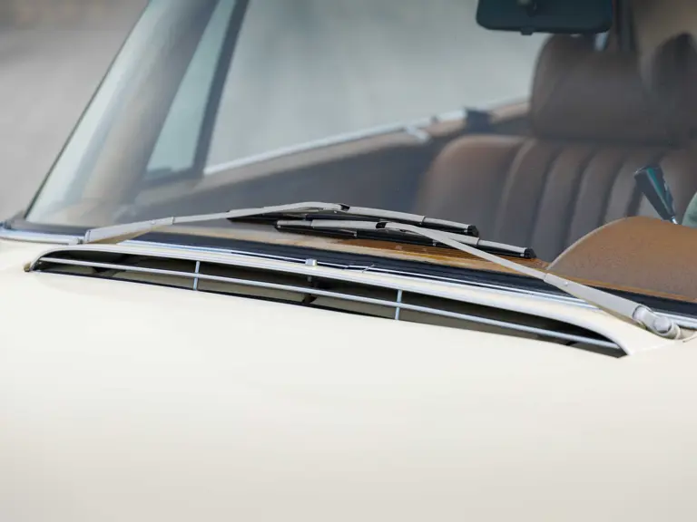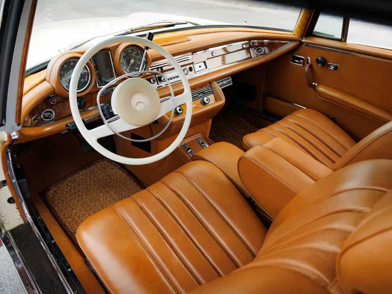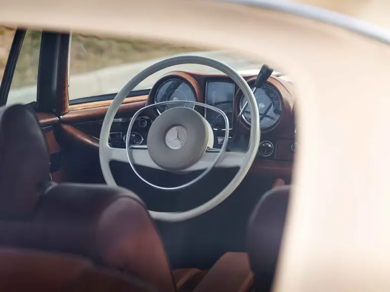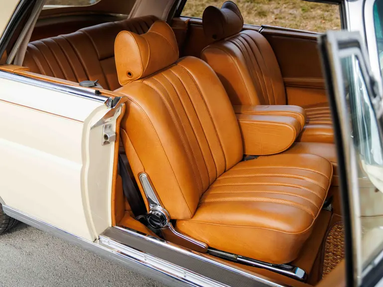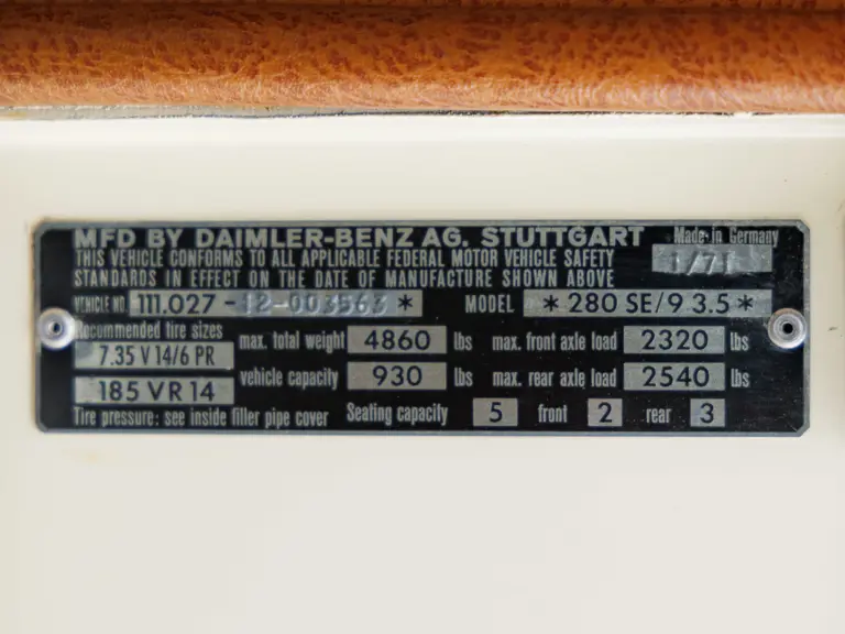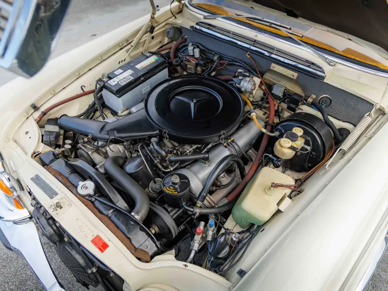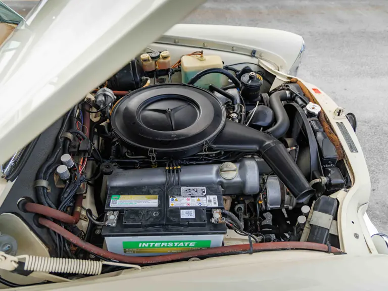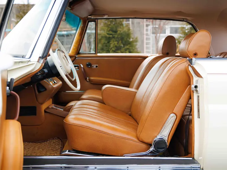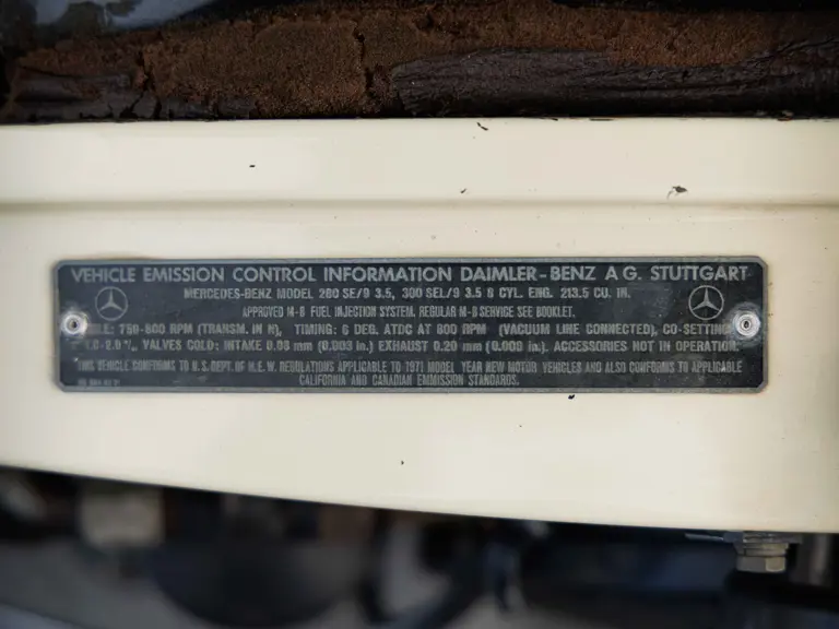 Unquestionably among the most thoroughly documented examples available, this 1971 Mercedes-Benz 280 SE 3.5 Cabriolet is said to wear its factory Light Ivory finish over Cognac leather upholstery. The car’s accompanying original window sticker confirms an impressive array of factory equipment, including air conditioning, power windows, a center folding armrest, Becker Europa stereo radio, tinted glass, and whitewall tires. Delivered new to Los Angeles, this handsome Cabriolet was sold through Mercedes-Benz of Hollywood on Sunset Boulevard to its original owner on 26 April 1971. The original maintenance booklet further attests to conscientious care, recording regular servicing at Mercedes-Benz facilities through September 1976, at which time the odometer displayed approximately 75,000 miles.