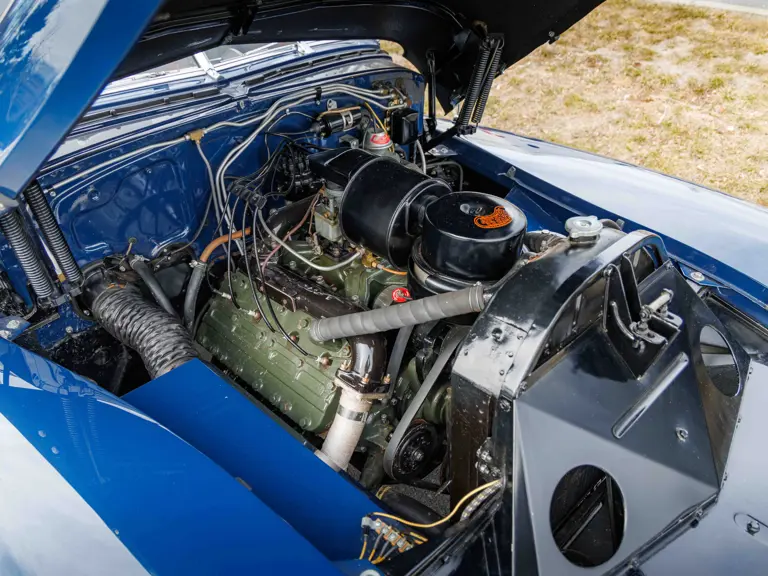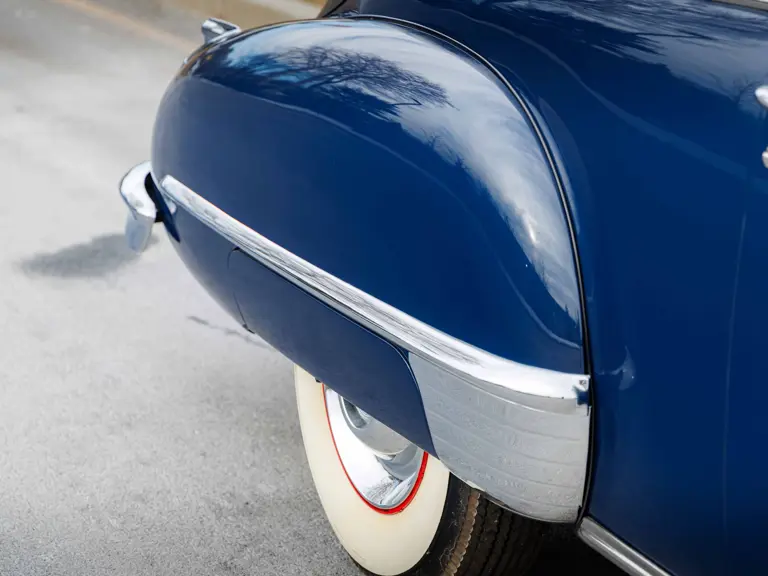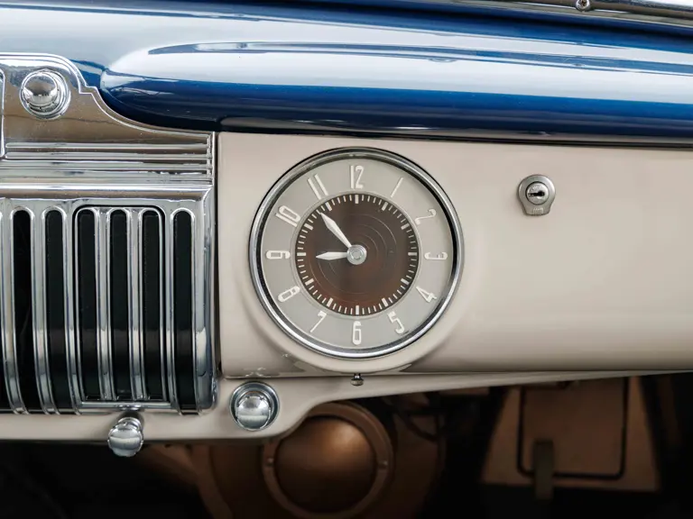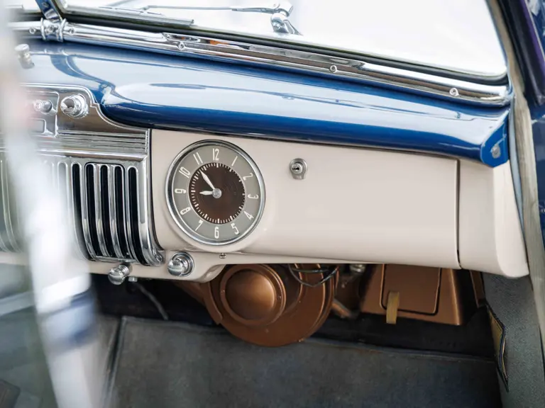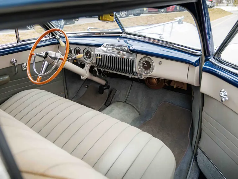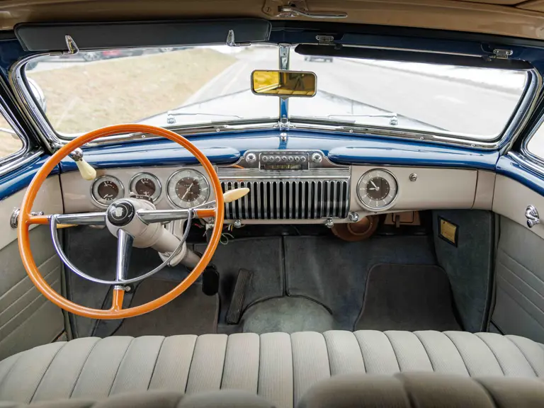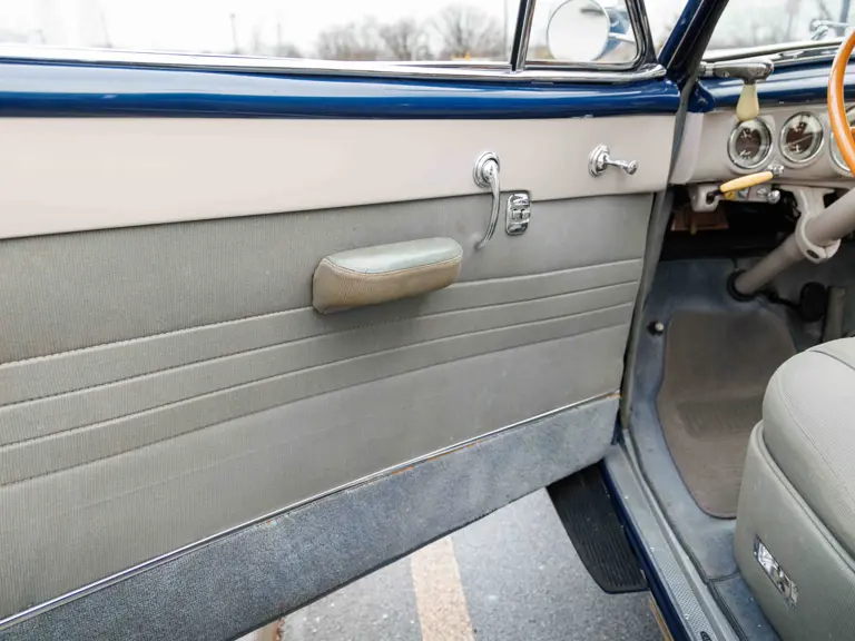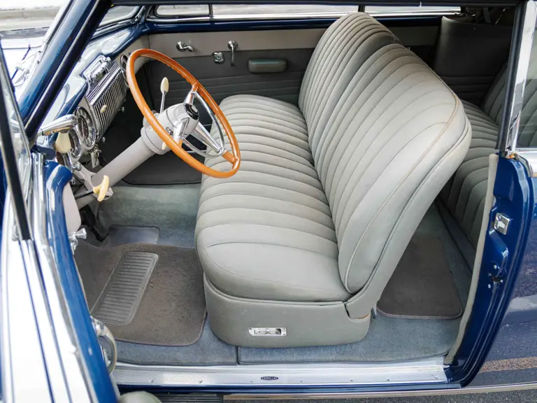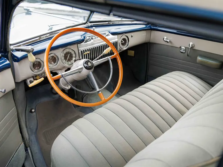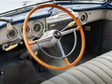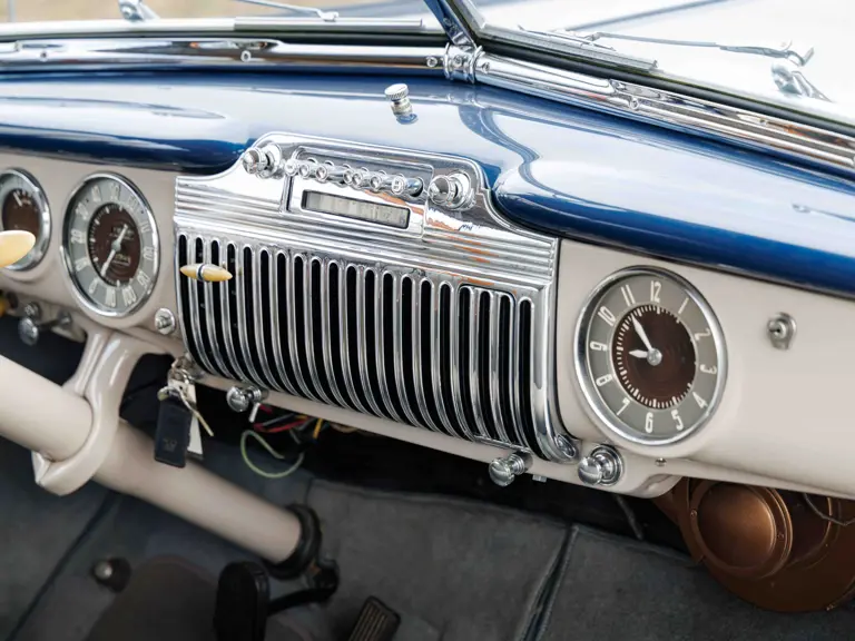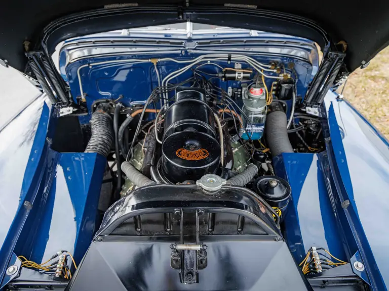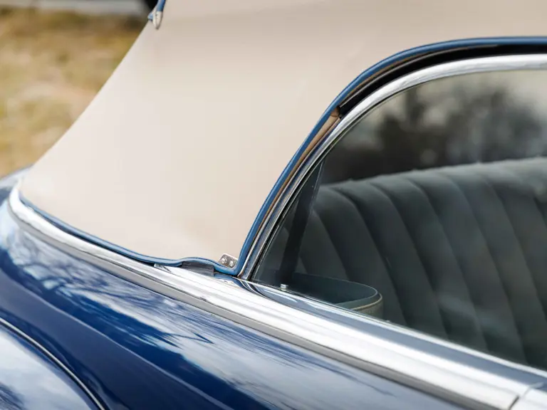 As documented by a copy of its factory build sheet, this Cadillac Series 62 Convertible was delivered new to Chicago on 17 January 1947 finished as it is today in Belden Blue Metallic over Gray Bedford Cord with a tan convertible soft top and equipped with a Hydra-Matic transmission, radio, power windows, Group C Accessory Group, fog lights, and an under-seat heating system. The car is said to have received an extensive body-on restoration in the early 2000s by Rich Fass’s Stone Barn Automobile Restoration in Vienna, New Jersey which saw it returned to its handsome factory specification.