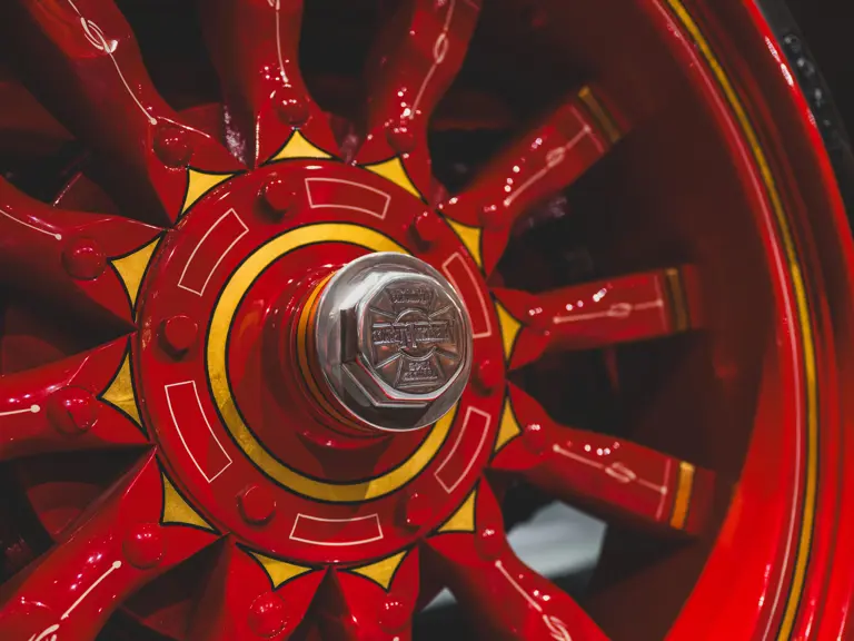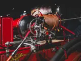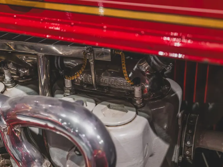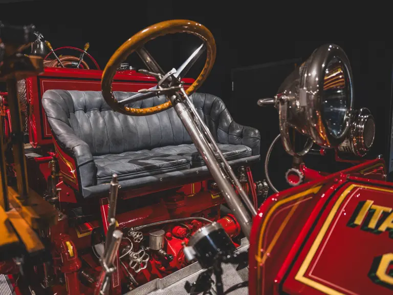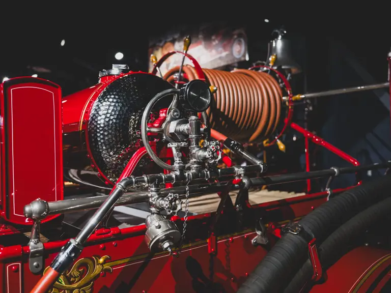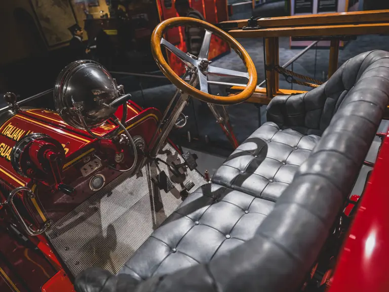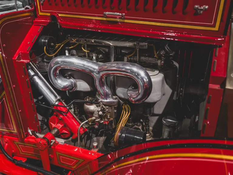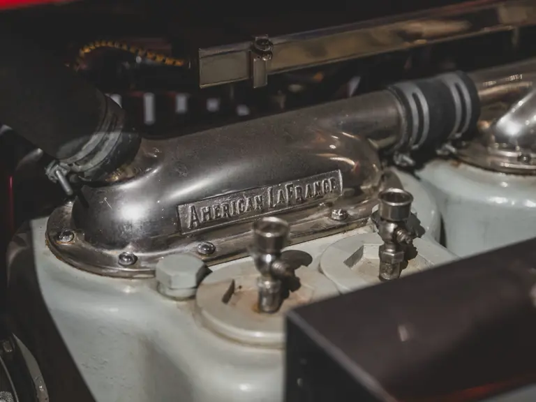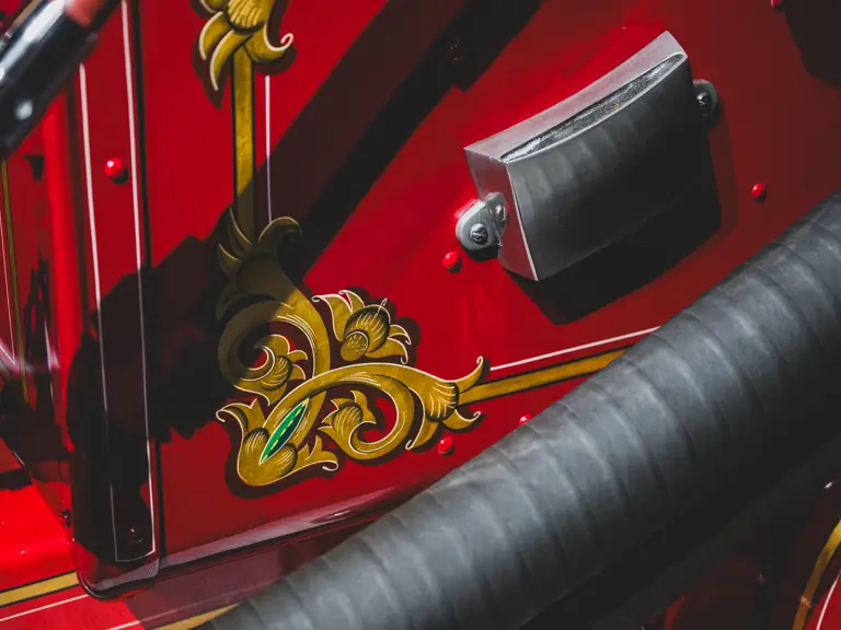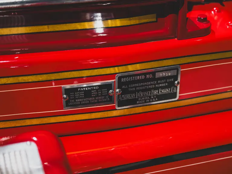 Guasti’s apparatus was fully restored for the American LaFrance Corporate Collection some years ago by the well-known Enfield Auto Restoration of Connecticut. It remains in very good overall condition, in its iconic livery, complete with proper lettering and 23k gold leaf decoration, leather seat upholstery in the correct pattern, correct wood spoke wheels with solid rubber tires, and an original dashboard and gauges; the pump appears restored and in good cosmetic order, albeit with incorrect gauges. Museum-displayed since its completion, it will require service prior to road use.