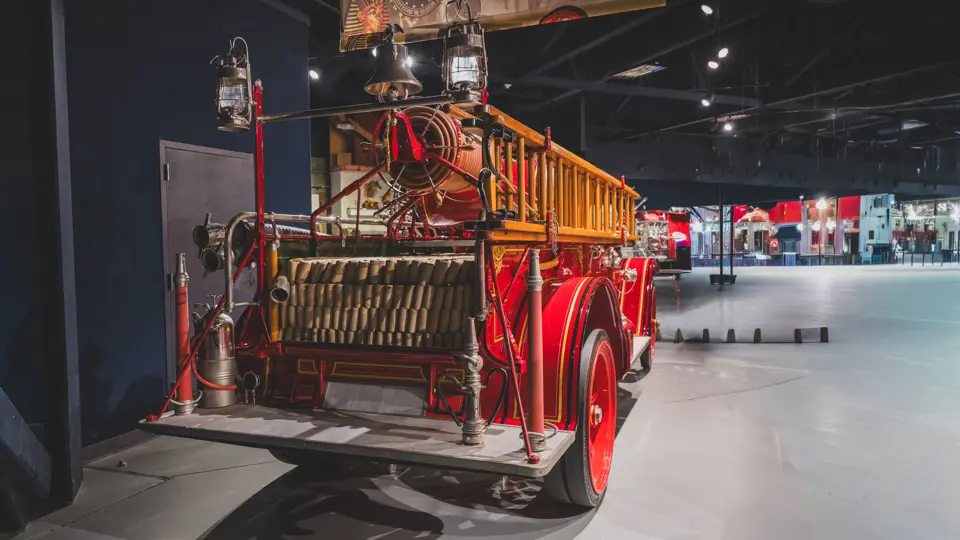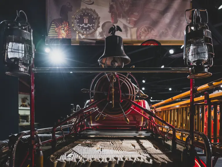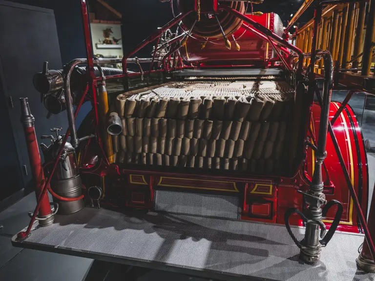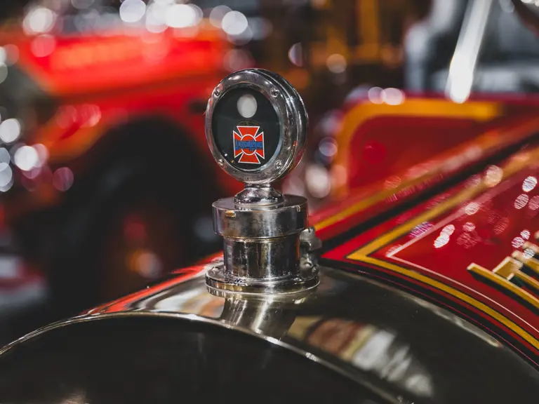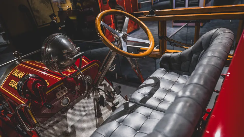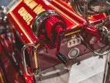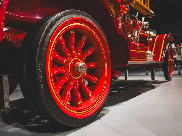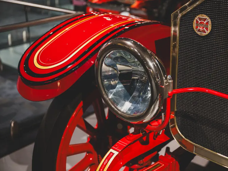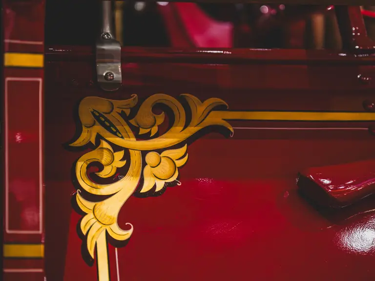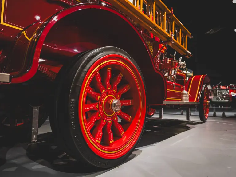 Guasti’s apparatus was fully restored for the American LaFrance Corporate Collection some years ago by the well-known Enfield Auto Restoration of Connecticut. It remains in very good overall condition, in its iconic livery, complete with proper lettering and 23k gold leaf decoration, leather seat upholstery in the correct pattern, correct wood spoke wheels with solid rubber tires, and an original dashboard and gauges; the pump appears restored and in good cosmetic order, albeit with incorrect gauges. Museum-displayed since its completion, it will require service prior to road use.