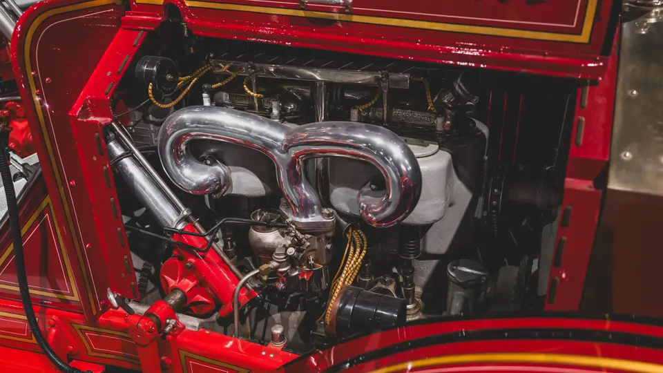 Perhaps the most iconic American LaFrance and one of the best-known fire engines of its era was the Type 40, which featured a 70-horsepower T-head four-cylinder engine, displacing a titanic 575 cubic inches from a 5-by-6-inch bore and stroke, and dual chain drive to a three-speed transaxle. Originally offered solely as a chemical tank model, it later became available as a combination model with an optional 300 gpm “Junior” rotary-gear pump. Somewhat shorter in wheelbase, with its 140 3/4-inch frame, it was, by fire engine standards, mid-sized and maneuverable, with a considerable amount of firefighting power provided by its dual systems. It was thus a practical choice for small municipalities, as well as for large industrial complexes.