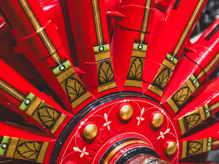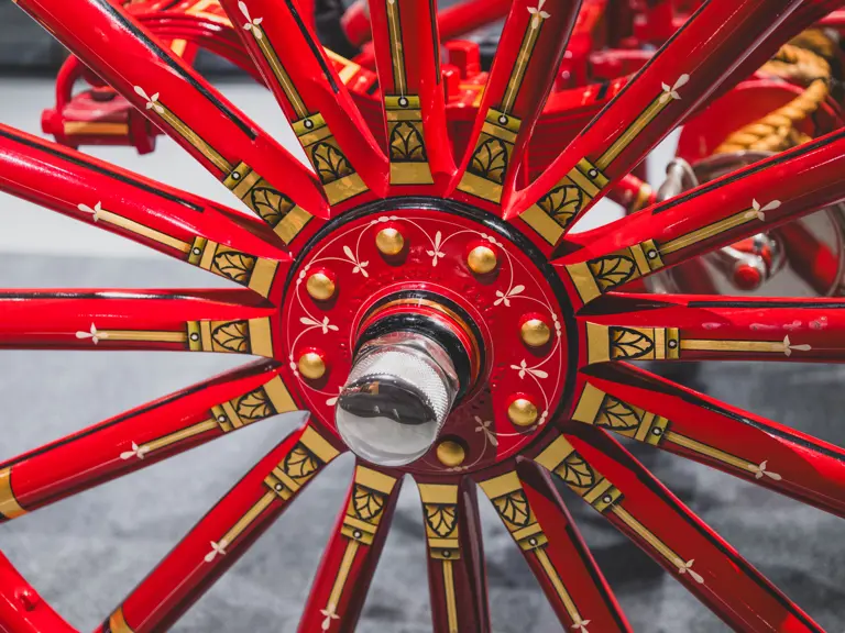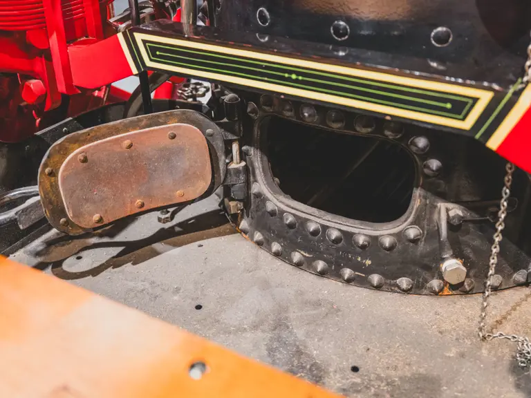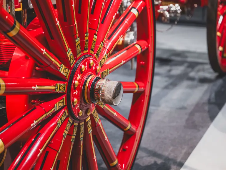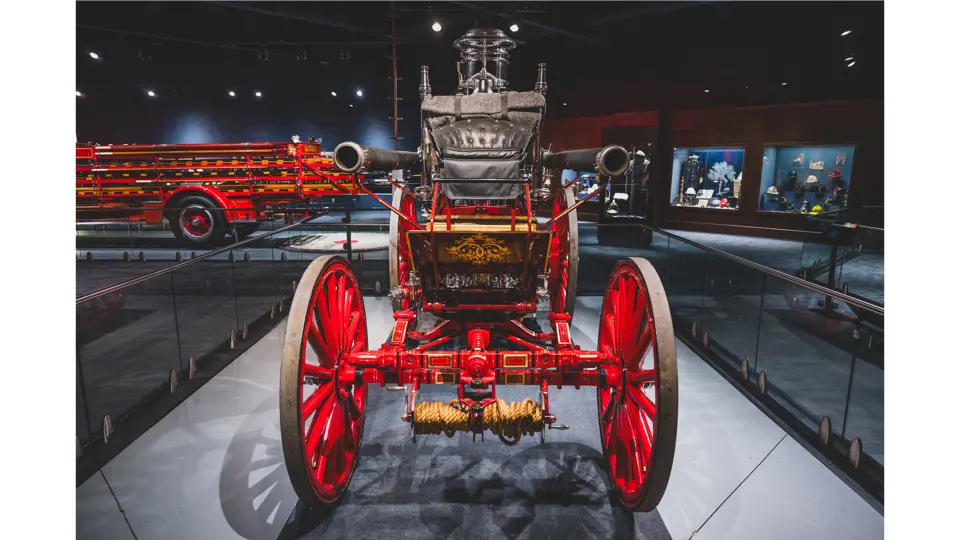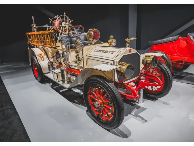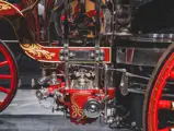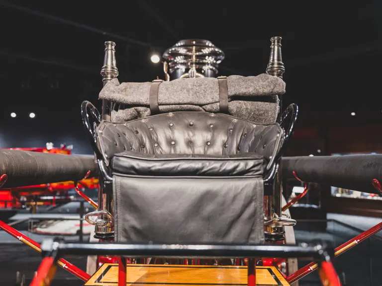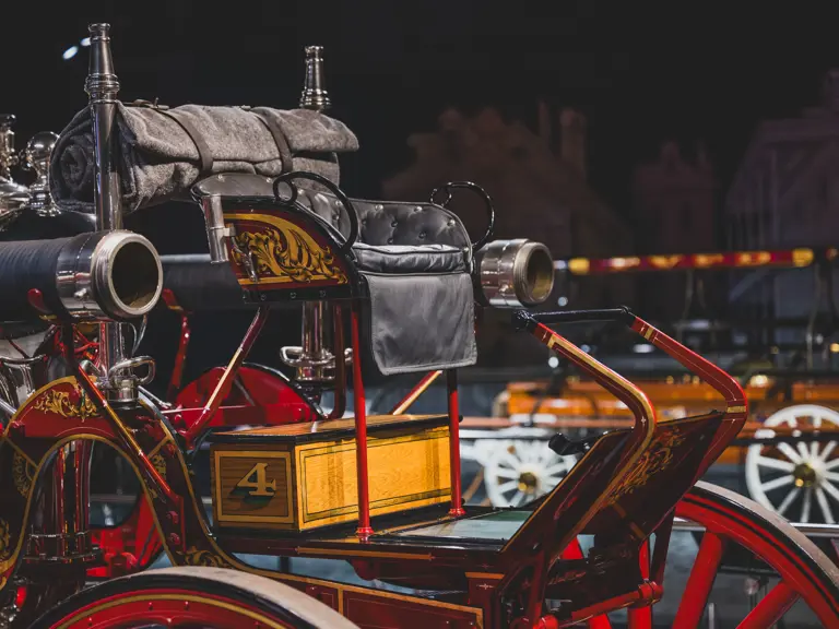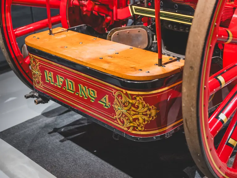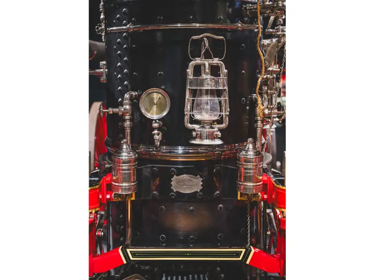 The Metropolitan was returned to its original color scheme and livery, including 23k gold leaf decoration and elaborate scroll work, applied by master decorator Ken Soderbeck; correct leather seat upholstery in the proper pattern; and nickel plating as-original. Further it was equipped with correct fire-fighting and steam engine accessories, including the oilers, oil cans, nozzles, hoses, and bell! Reportedly when completed the engine was fully functional and operational under steam power. As with many vehicles in the collection, it has been largely museum-exhibited since the restoration and while cosmetically still in very good overall order, would require service prior to use of its steam engine.