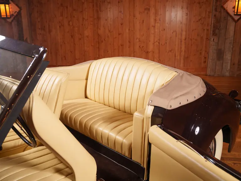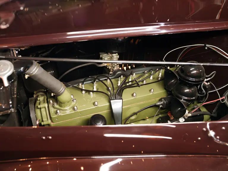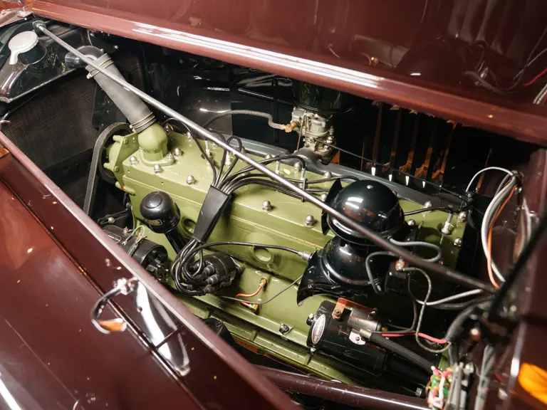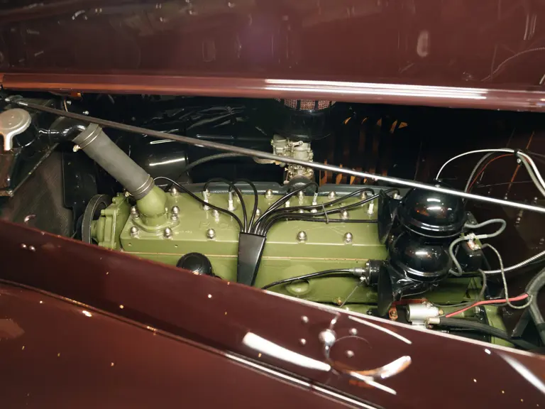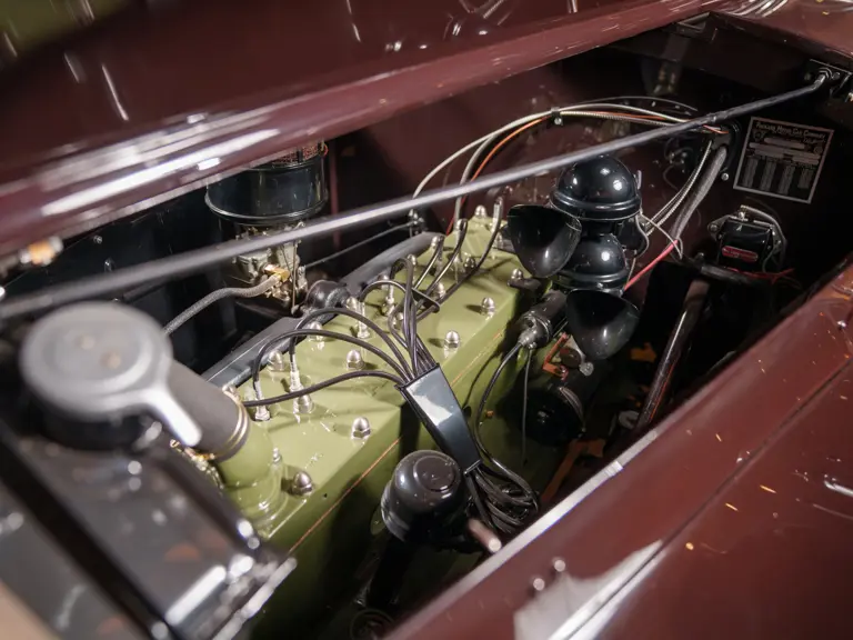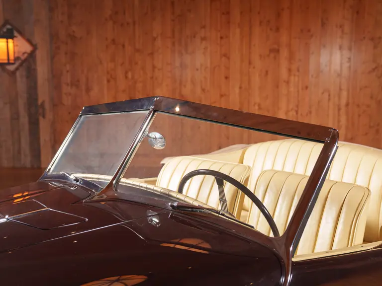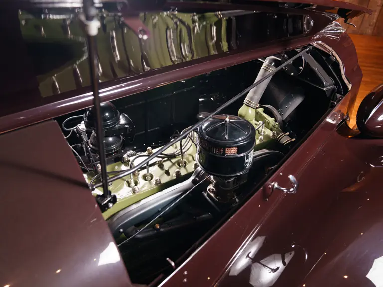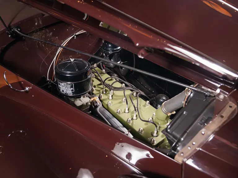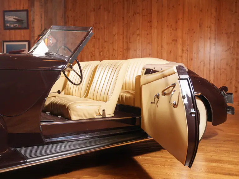 Gable’s car, offered here, was the second “Packard Darrin,” the first four-passenger version of the design, and thus the first “convertible victoria by Darrin,” as they would later more famously become known. It was the only other Darrin Packard to, like the Powell car before it, have a traditional cowl, framed in ash and paneled in aluminum; subsequent cars had a distinctive three-piece cast aluminum cowl, but this was not ready when the Gable car was completed. Darrin was savvy enough to not want to keep the best-known motorist in America waiting.