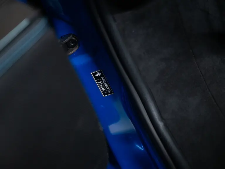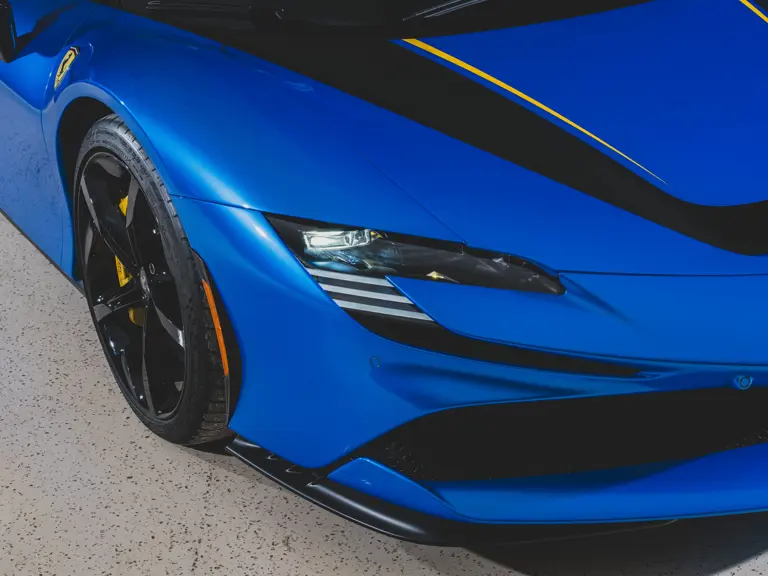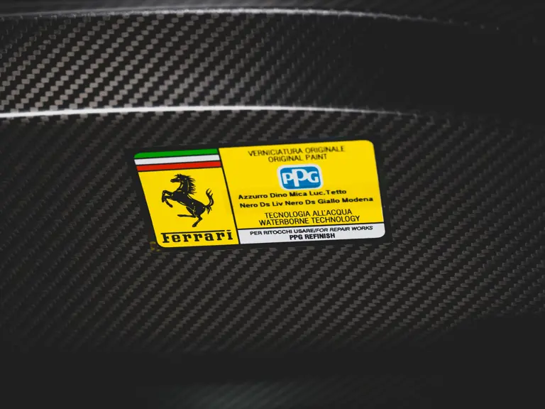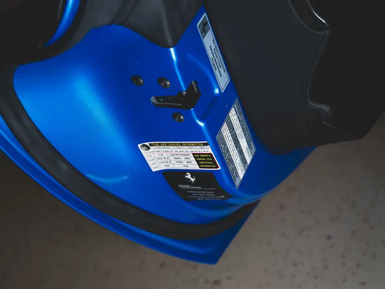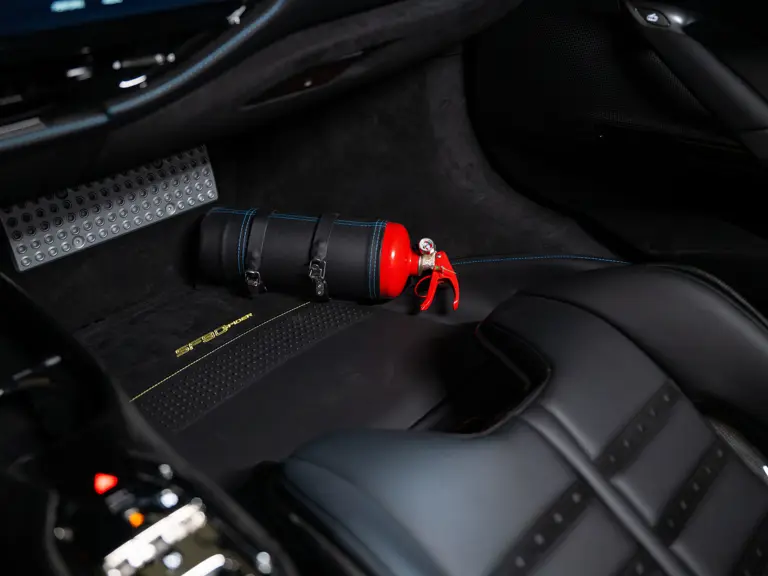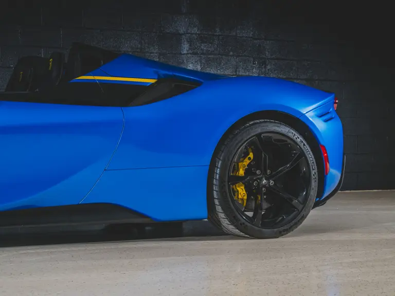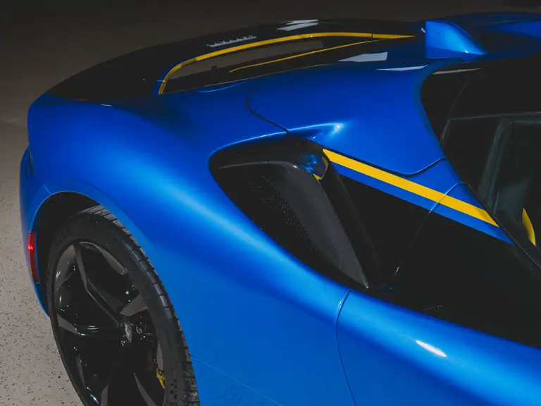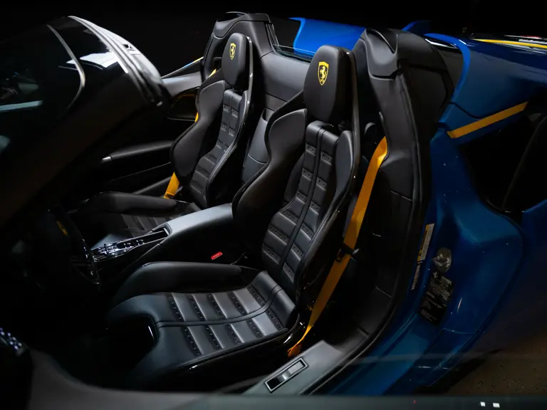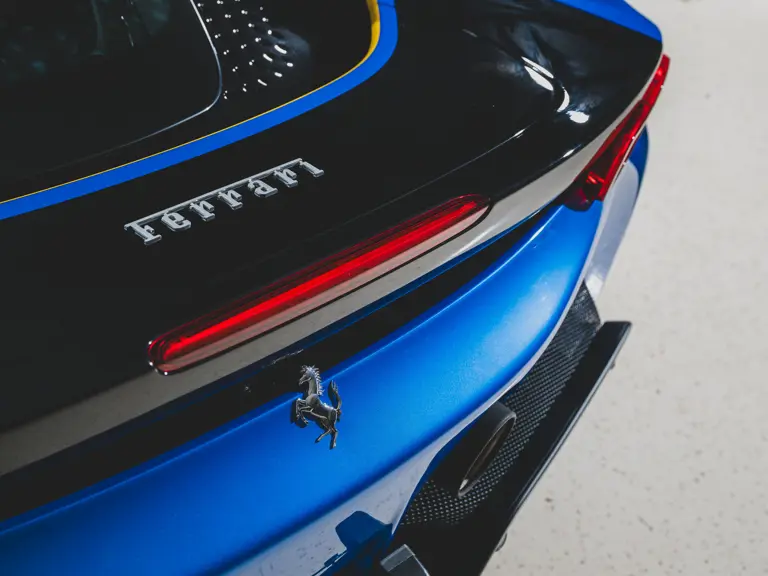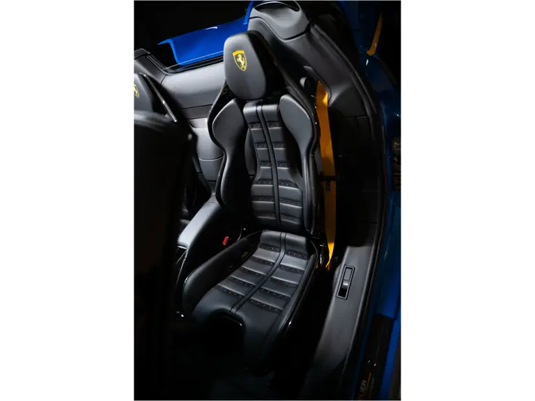 Inside, Nero leather provides a sumptuous base for additional details deliberately chosen to weave the exterior’s rich color palette into the cabin. These include blue contrast stitching, numerous exposed carbon fiber elements, yellow seatbelts, leather and Alcantara floormats with yellow embroidered logos, and size large, carbon fiber Daytona racing seats with perforated Alcantara inserts, seat lifters, and yellow embroidered logos on the headrests. Other special equipment designed to improve convenience, safety, and driving enjoyment includes Ferrari’s Advanced Front Lighting System (AFS), suspension lifter, Apple CarPlay, fire extinguisher, and wheel stud bolts in titanium.