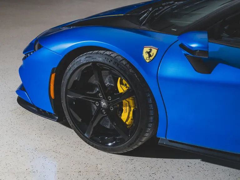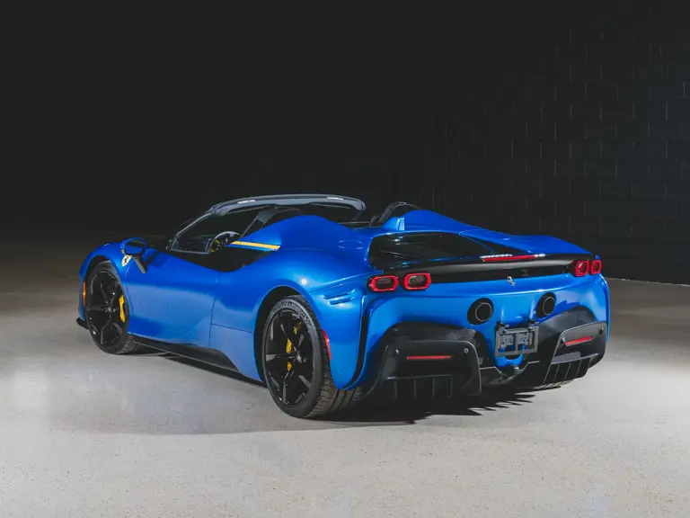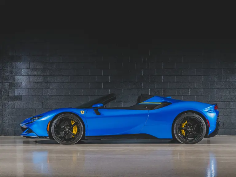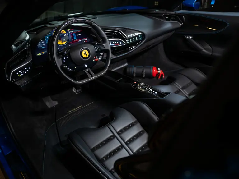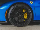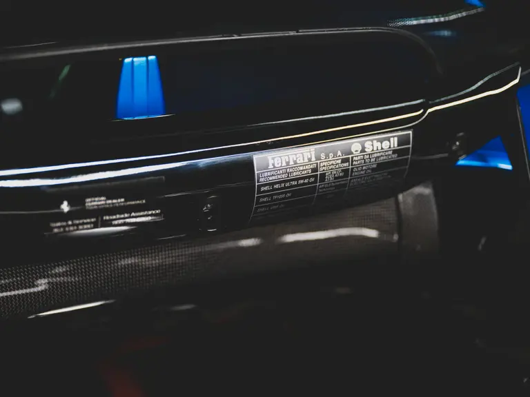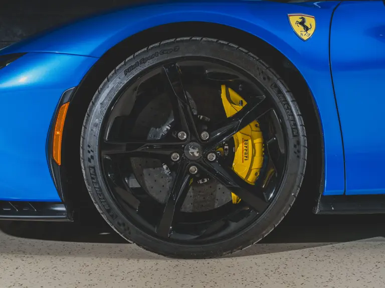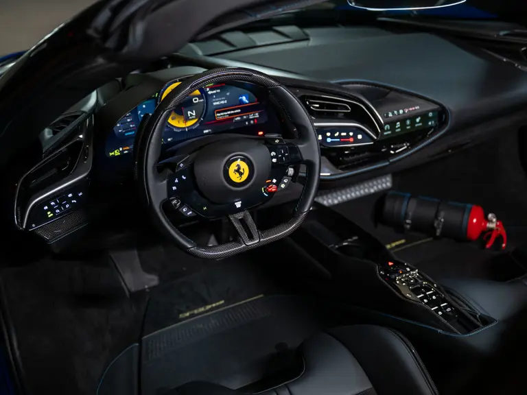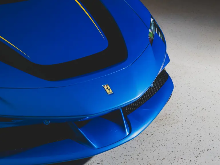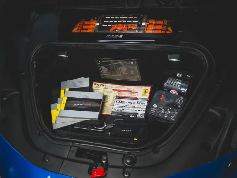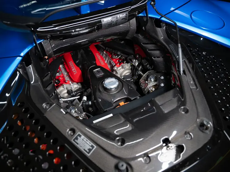 Inside, Nero leather provides a sumptuous base for additional details deliberately chosen to weave the exterior’s rich color palette into the cabin. These include blue contrast stitching, numerous exposed carbon fiber elements, yellow seatbelts, leather and Alcantara floormats with yellow embroidered logos, and size large, carbon fiber Daytona racing seats with perforated Alcantara inserts, seat lifters, and yellow embroidered logos on the headrests. Other special equipment designed to improve convenience, safety, and driving enjoyment includes Ferrari’s Advanced Front Lighting System (AFS), suspension lifter, Apple CarPlay, fire extinguisher, and wheel stud bolts in titanium.