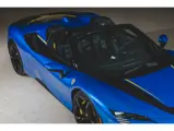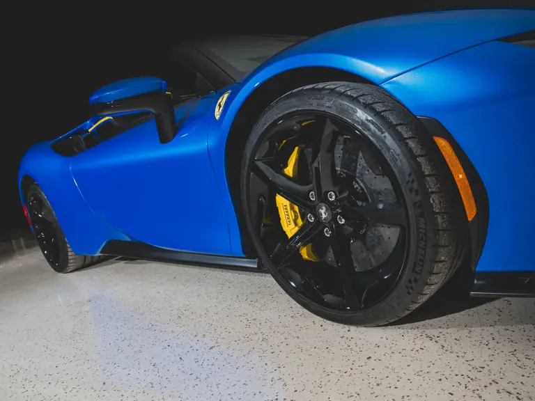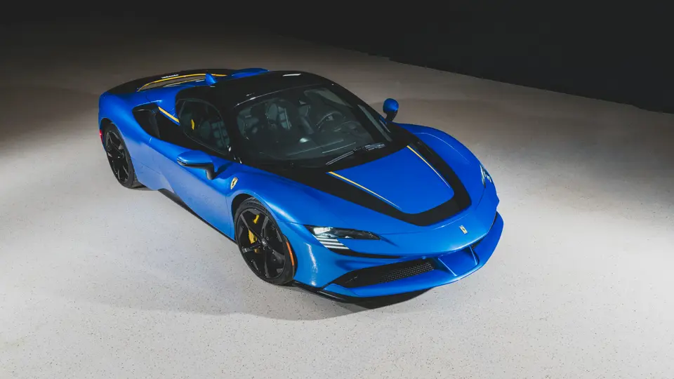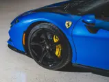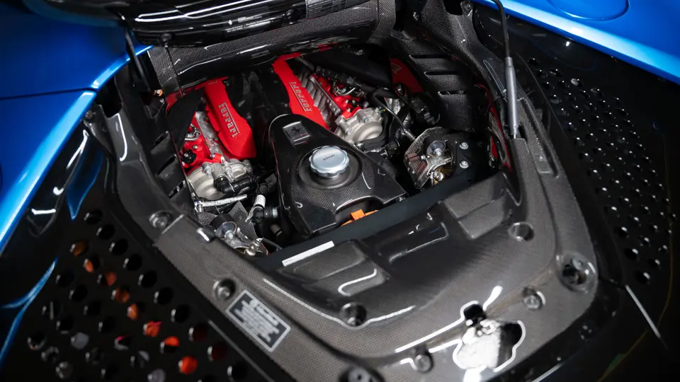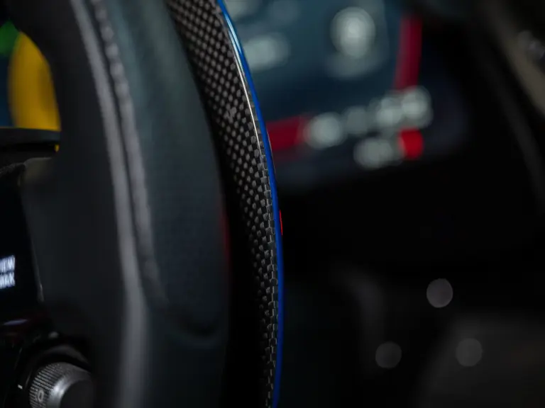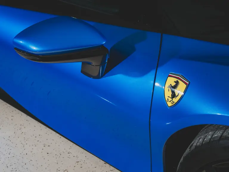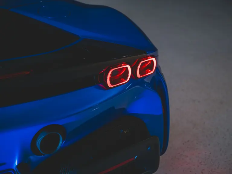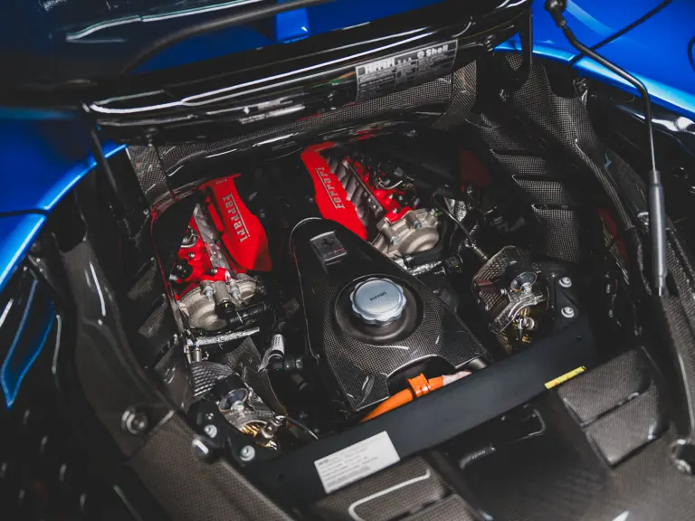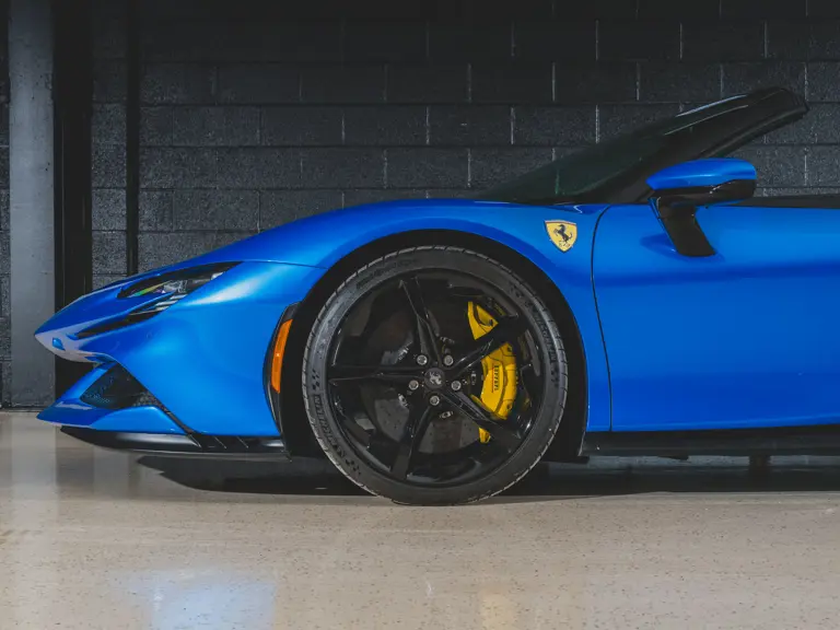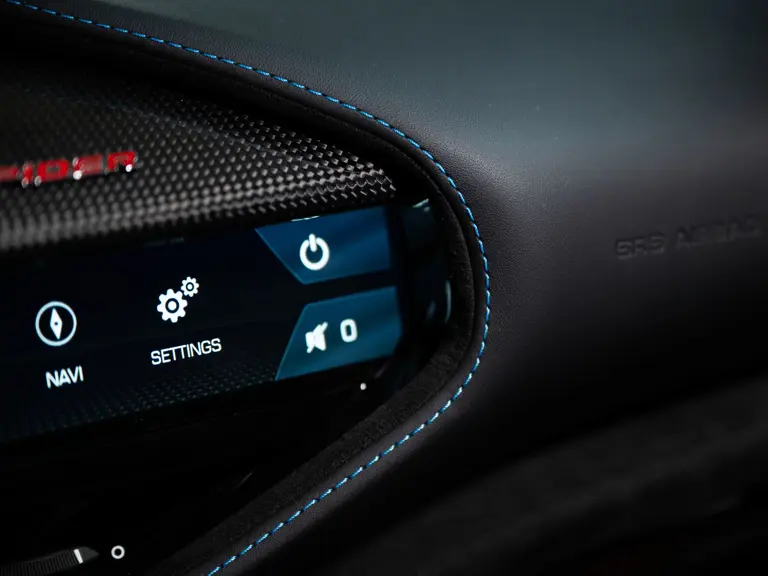 Inside, Nero leather provides a sumptuous base for additional details deliberately chosen to weave the exterior’s rich color palette into the cabin. These include blue contrast stitching, numerous exposed carbon fiber elements, yellow seatbelts, leather and Alcantara floormats with yellow embroidered logos, and size large, carbon fiber Daytona racing seats with perforated Alcantara inserts, seat lifters, and yellow embroidered logos on the headrests. Other special equipment designed to improve convenience, safety, and driving enjoyment includes Ferrari’s Advanced Front Lighting System (AFS), suspension lifter, Apple CarPlay, fire extinguisher, and wheel stud bolts in titanium.