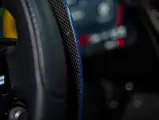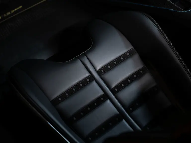- Nero leather interior with blue stitching, yellow embroidered logos and seatbelts, and size large Daytona racing seats with Alcantara inserts