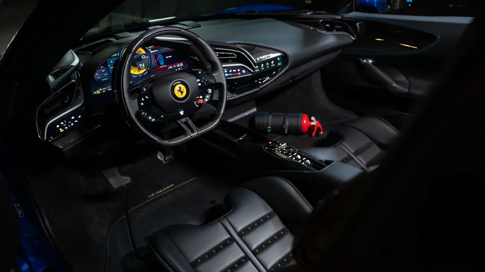 The exterior is finished in stunning, special-order Azzurro Dino Mica paint, a $33,000 option, combined with special livery featuring tasteful black and yellow graphics, costing an additional $30,373. Every customized component was given careful consideration, as seen in the black 20-inch forged wheels, black tailpipes, and exposed carbon fiber elements throughout, which beautifully offset the deep blue paint. Vivid yellow striping and brake calipers punctuate the presentation and highlight the fender-mounted Scuderia shields.