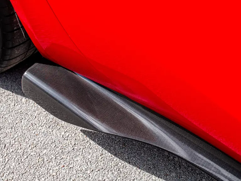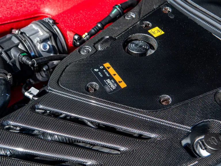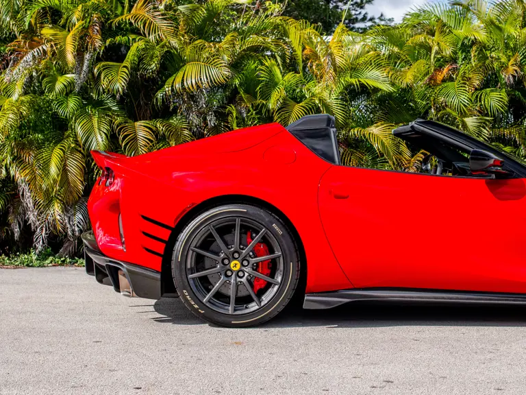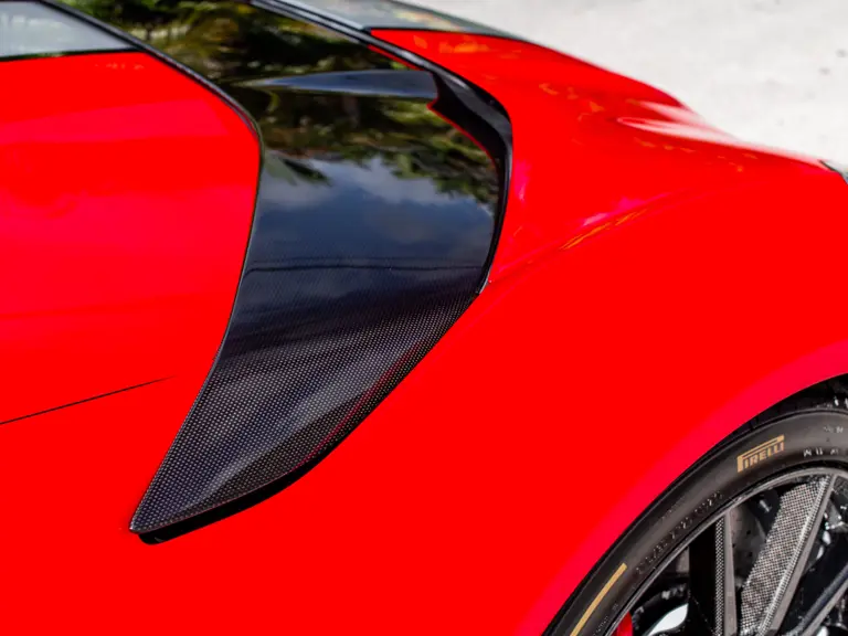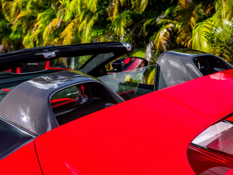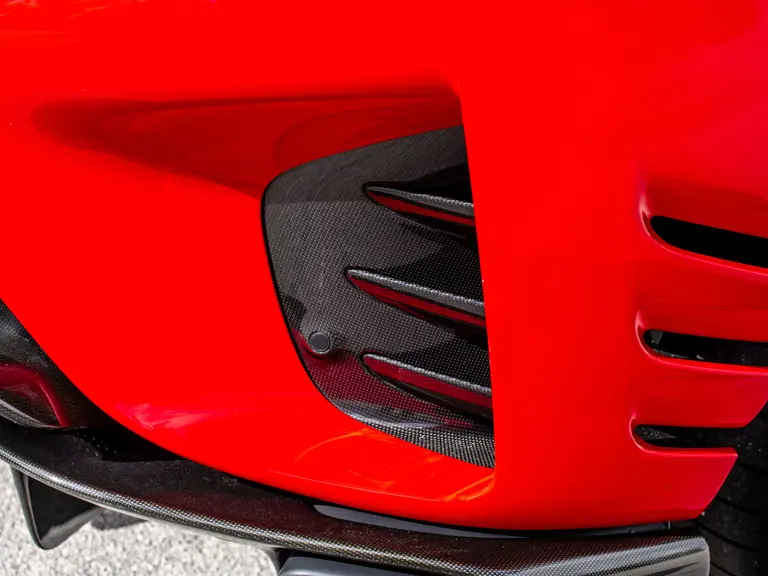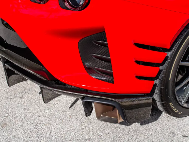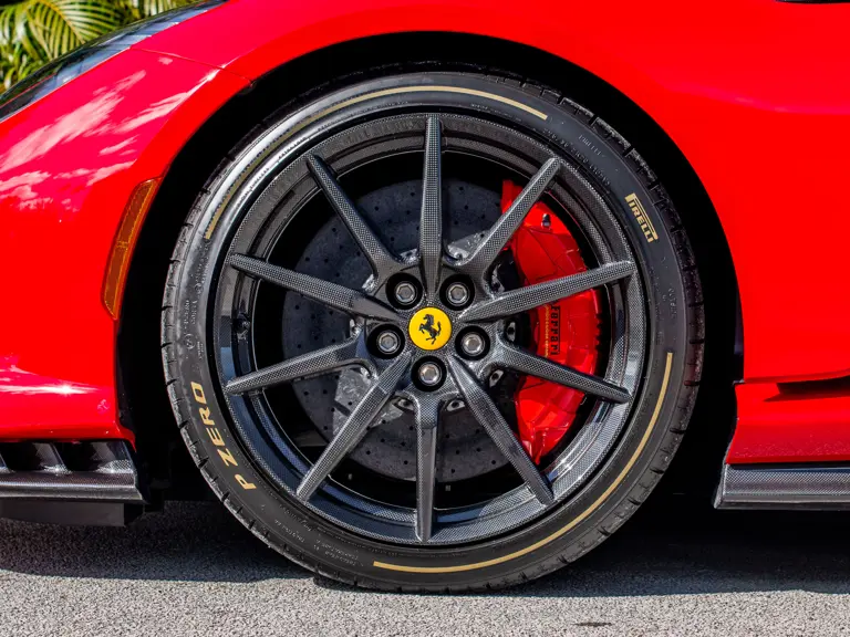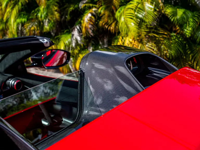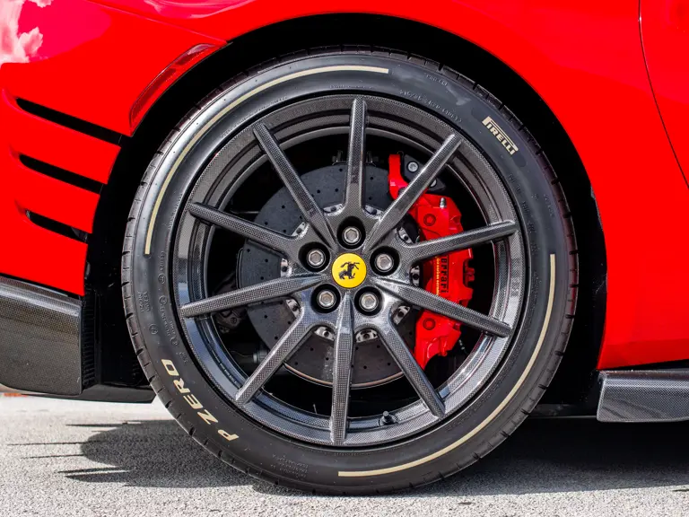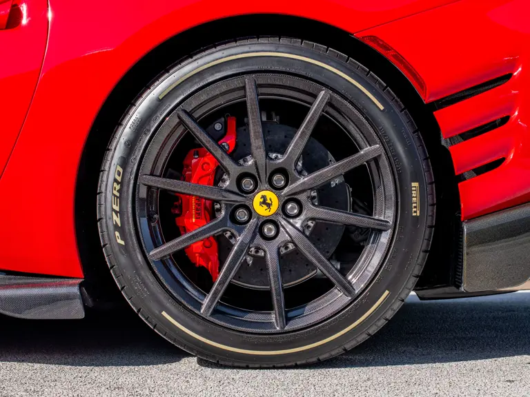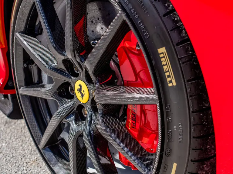 Carbon fiber features prominently throughout the specification, including the hardtop, rear diffuser, under-door covers, front air intakes, and engine and airbox covers, with the entire ensemble meeting the pavement via Rosso Scuderia brake calipers lurking behind 20-inch carbon fiber wheels shod in Grigio Pirelli Color Edition tires.