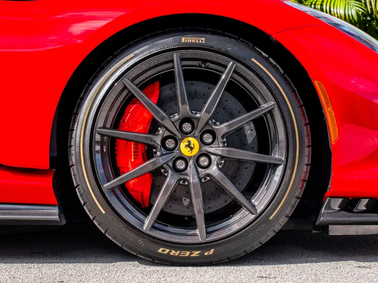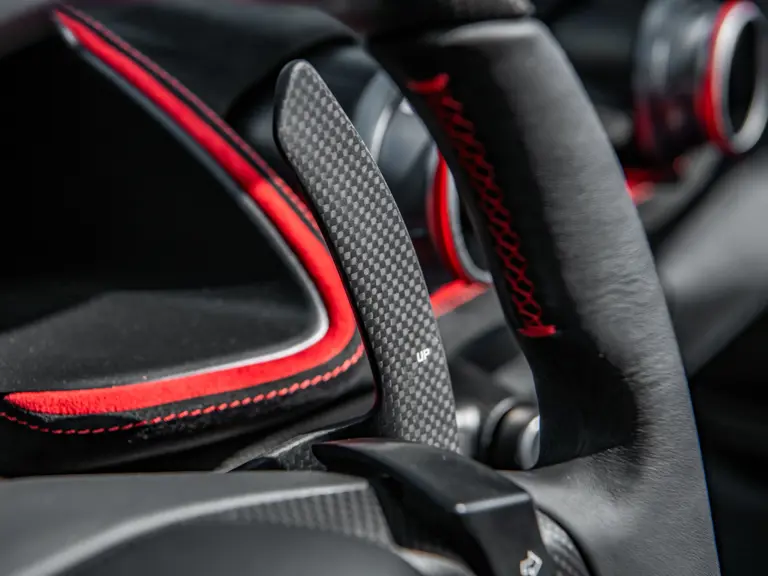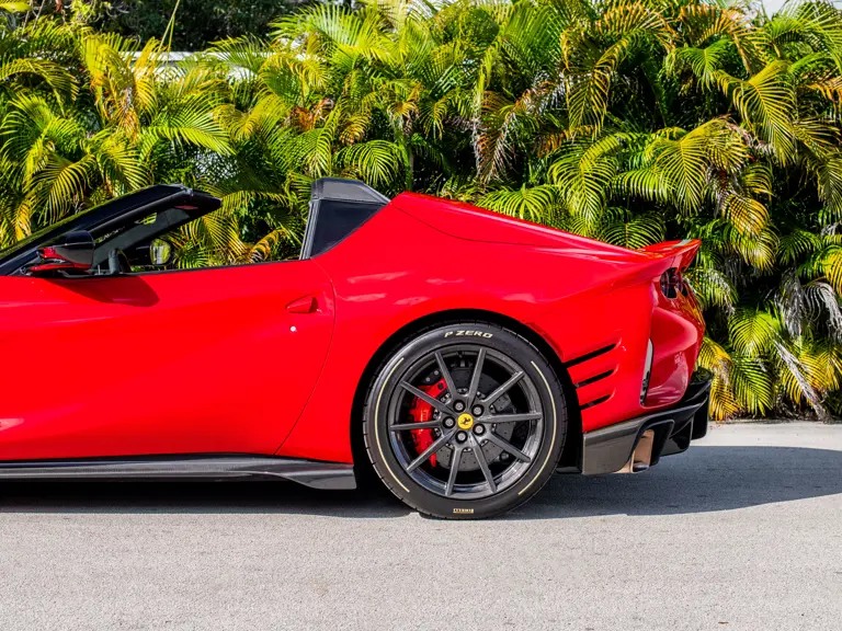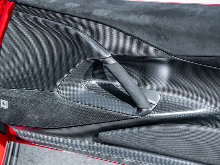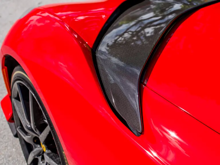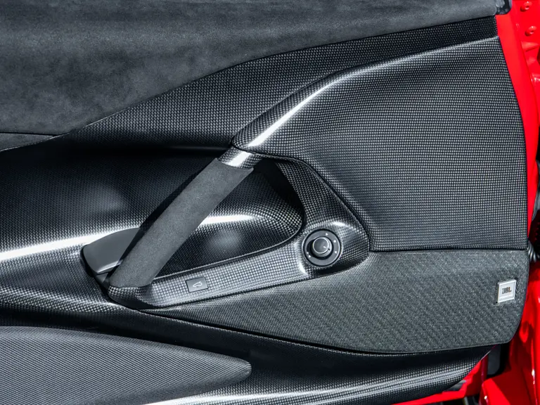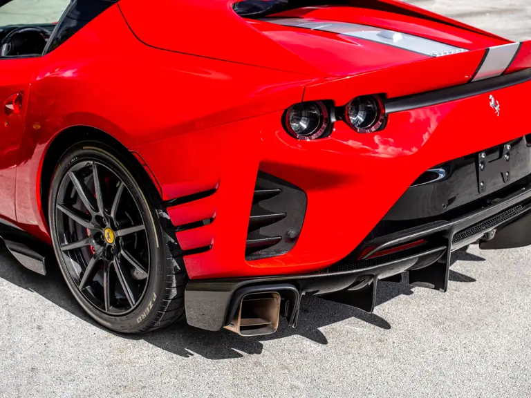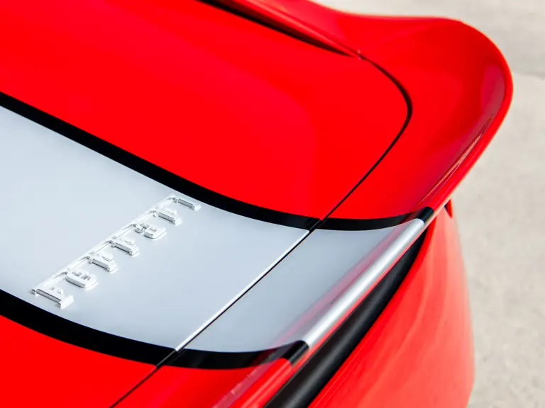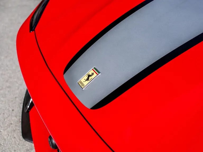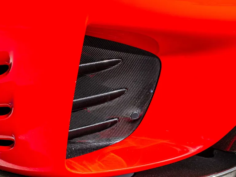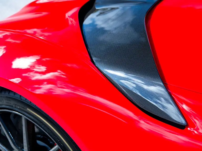 Carbon fiber features prominently throughout the specification, including the hardtop, rear diffuser, under-door covers, front air intakes, and engine and airbox covers, with the entire ensemble meeting the pavement via Rosso Scuderia brake calipers lurking behind 20-inch carbon fiber wheels shod in Grigio Pirelli Color Edition tires.
