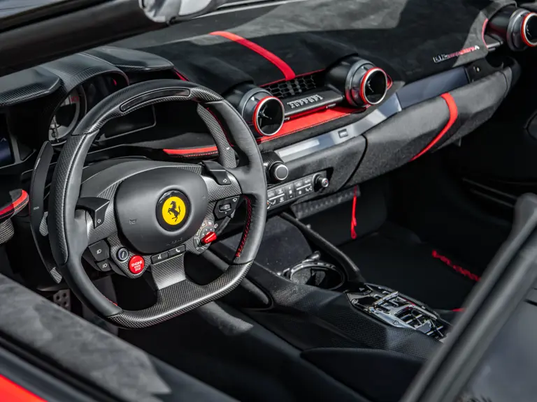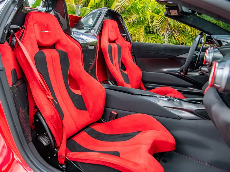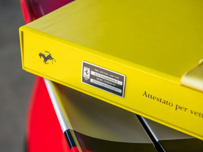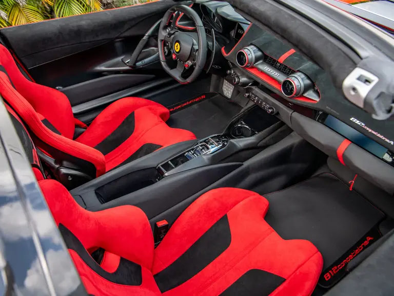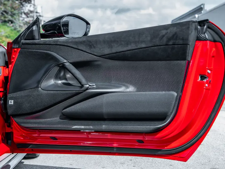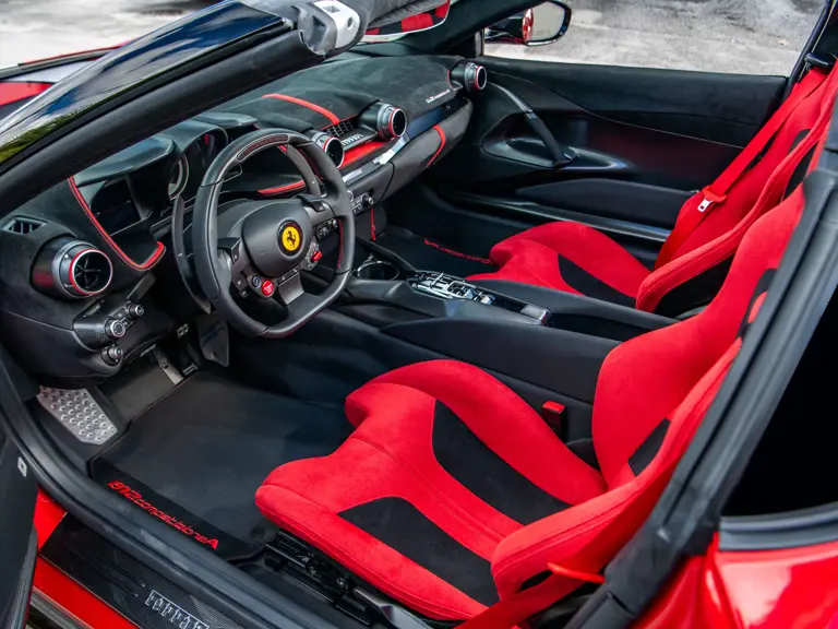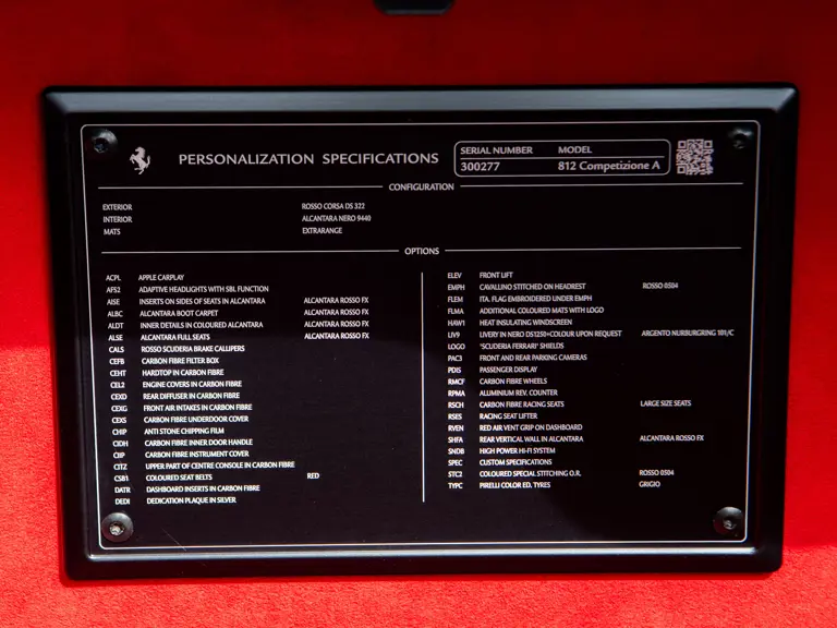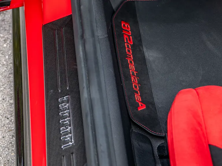 Displaying just 95 miles at the time of cataloguing, the 812 Competizione A on offer strikes a commanding presence in Rosso Corsa (DS 322) with a Nero and Argento Nürburgring racing stripe over a Nero and Rosso Alcantara interior. The car is enhanced by nearly $150,000 in factory options, including Scuderia fender shields, parking cameras, a front suspension lift system, and adaptive LED headlights.