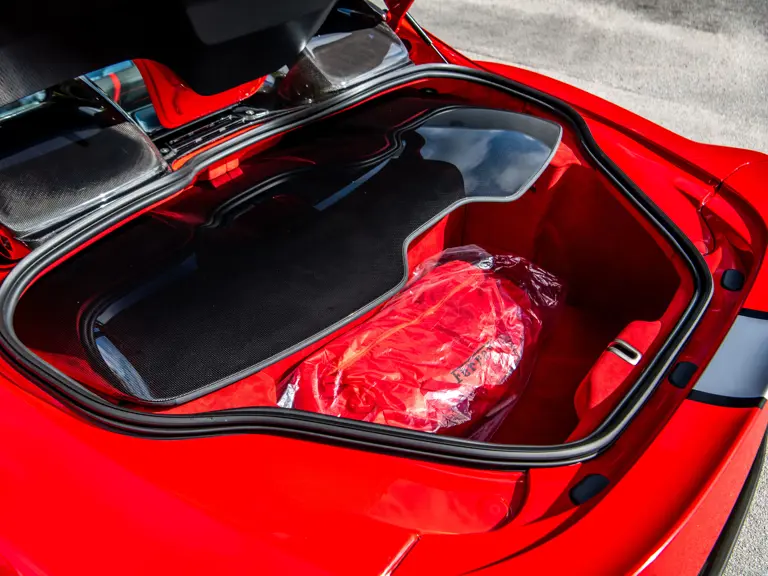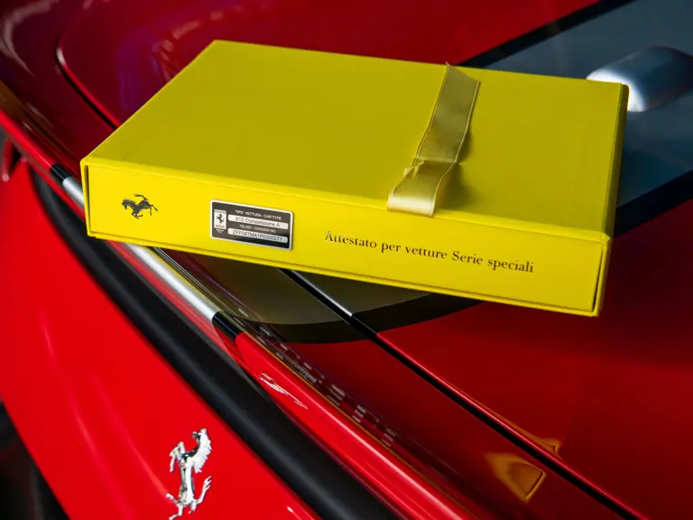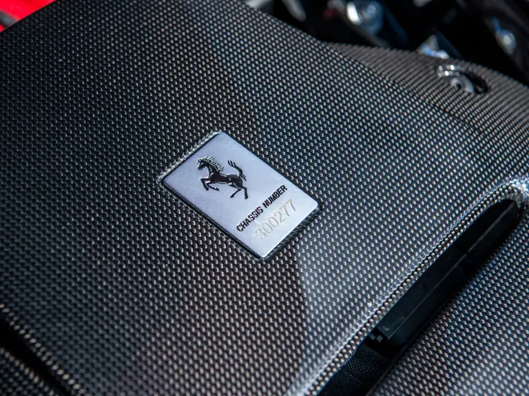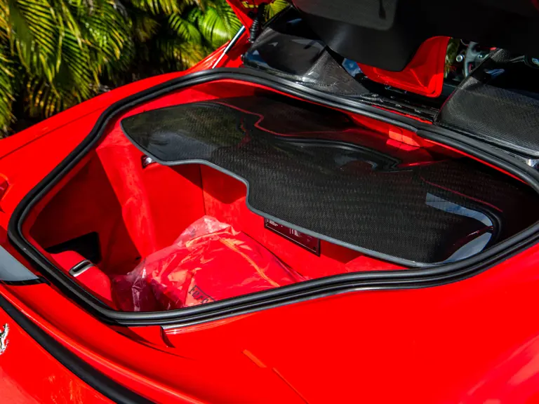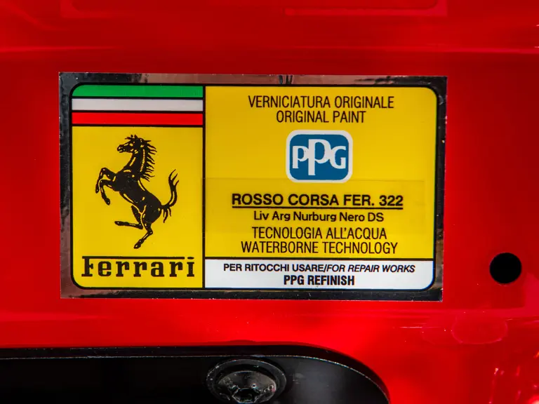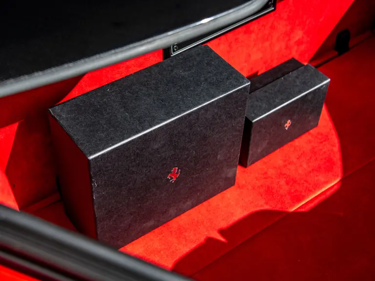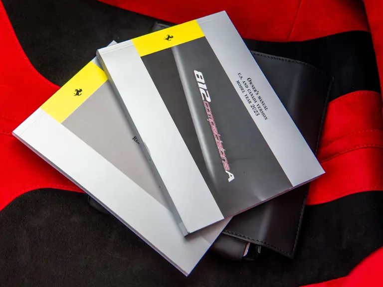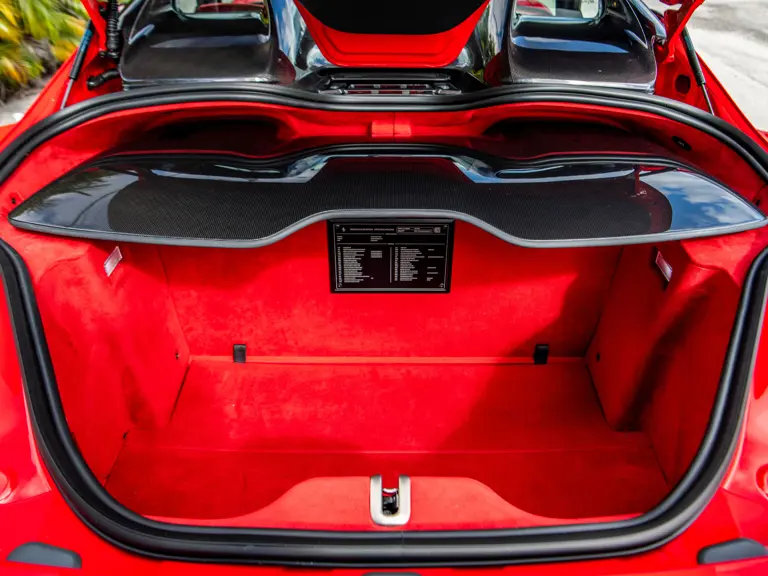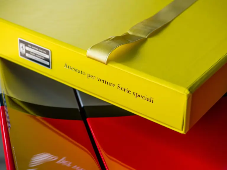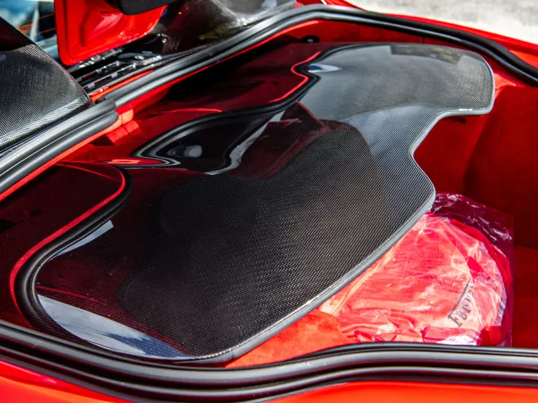 The Rosso and Nero Alcantara–trimmed cabin is generously equipped, featuring large racing seats with lifters and embroidered headrests wearing both the Cavallino Rampante and the Italian flag. Further appointments include a Rosso Alcantara trunk lining, Rosso stitching and seat belts, carbon fiber for the instrument cluster, dashboard inserts, interior door handles, and upper console, as well as Apple CarPlay and a high-power Hi-Fi audio system. With an impressive original MSRP of $852,420, this exceptional Competizione A is now offered with a copy of its original window sticker, car cover, and other factory accessories.