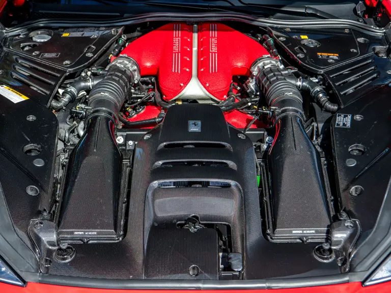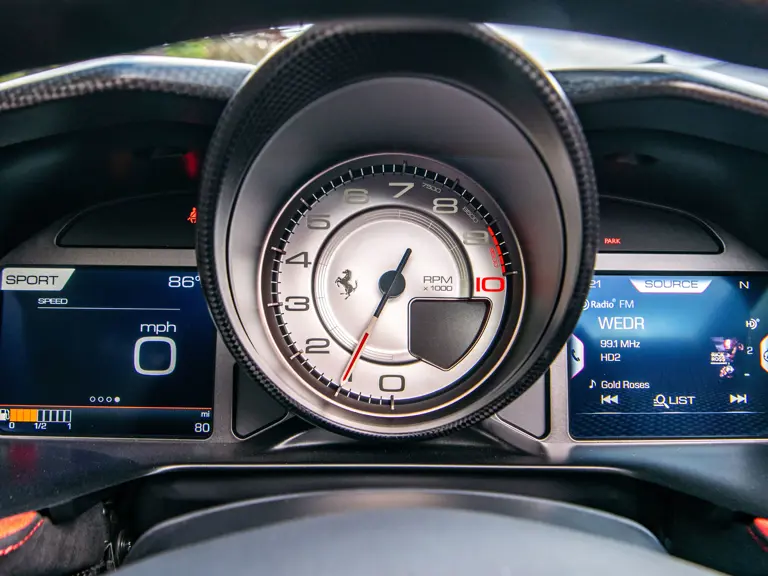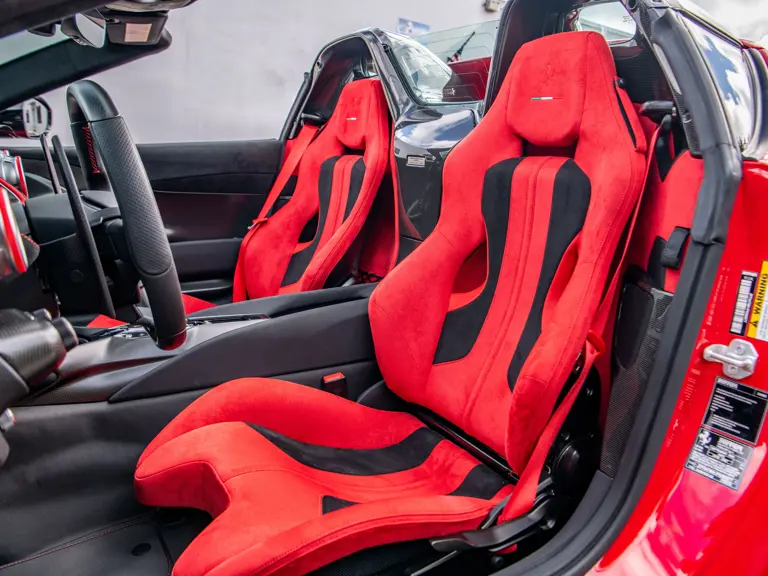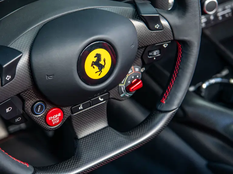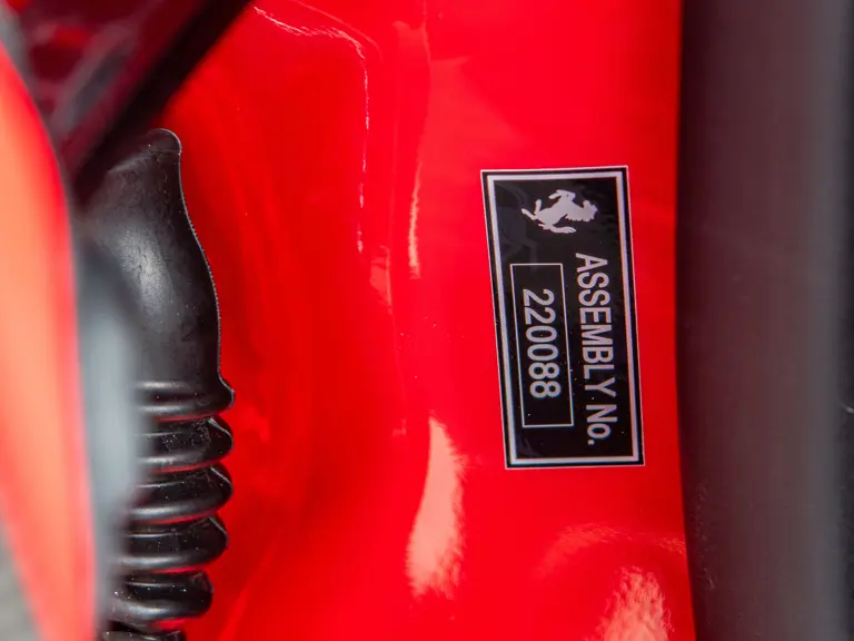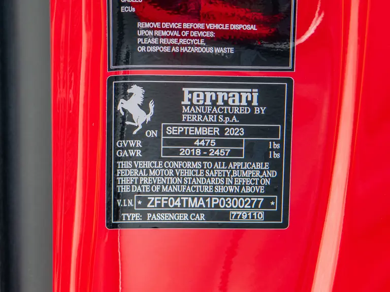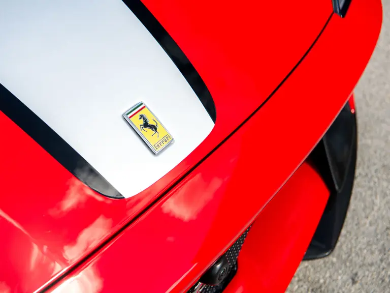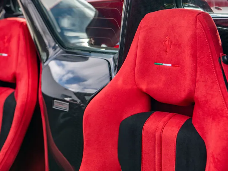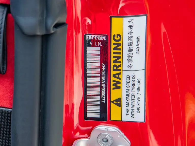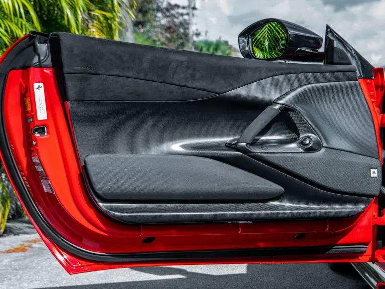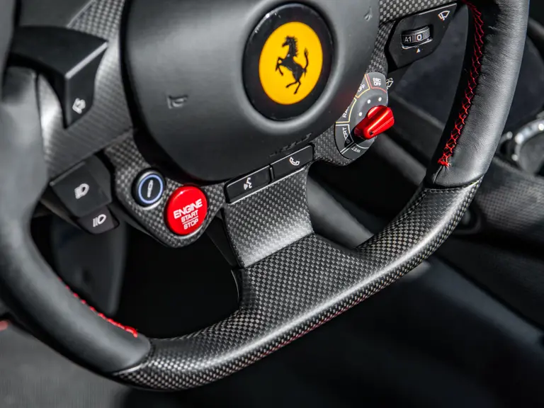 The Rosso and Nero Alcantara–trimmed cabin is generously equipped, featuring large racing seats with lifters and embroidered headrests wearing both the Cavallino Rampante and the Italian flag. Further appointments include a Rosso Alcantara trunk lining, Rosso stitching and seat belts, carbon fiber for the instrument cluster, dashboard inserts, interior door handles, and upper console, as well as Apple CarPlay and a high-power Hi-Fi audio system. With an impressive original MSRP of $852,420, this exceptional Competizione A is now offered with a copy of its original window sticker, car cover, and other factory accessories.