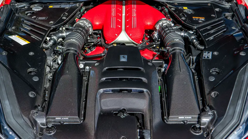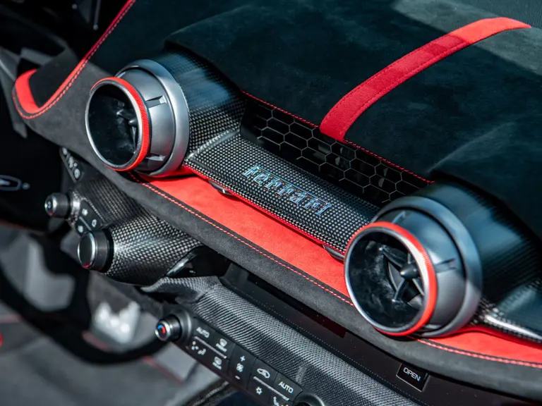 To harness this performance, Ferrari engineers extensively reworked the chassis and aerodynamics. Independent rear-wheel steering sharpens agility, while improved brake cooling ensures consistency under sustained high-speed driving. Visually and functionally, the front cowl is defined by a bold carbon fiber blade that masks enlarged engine bay vents, reducing drag while optimizing thermal efficiency. At the rear, airflow over the open cabin is carefully managed by twin aerodynamic openings nestled between the dual flying buttresses. These channels control air from both above and alongside the cockpit, enhancing comfort at speed while delivering a measurable gain in overall aerodynamic performance.