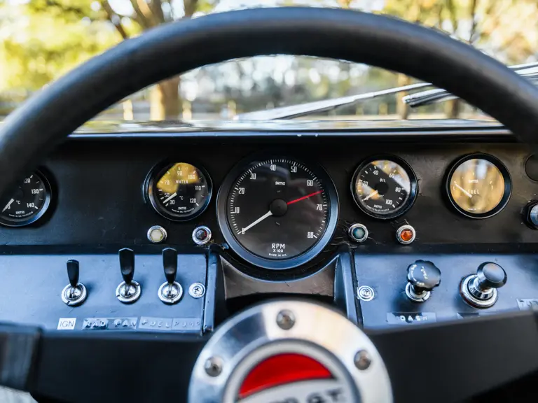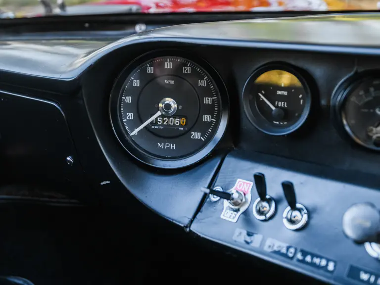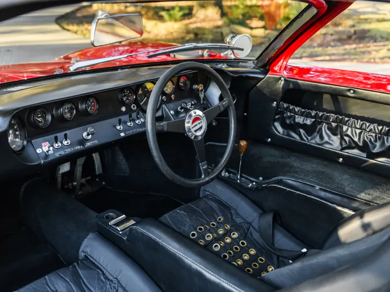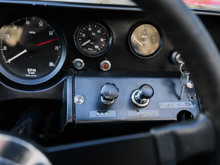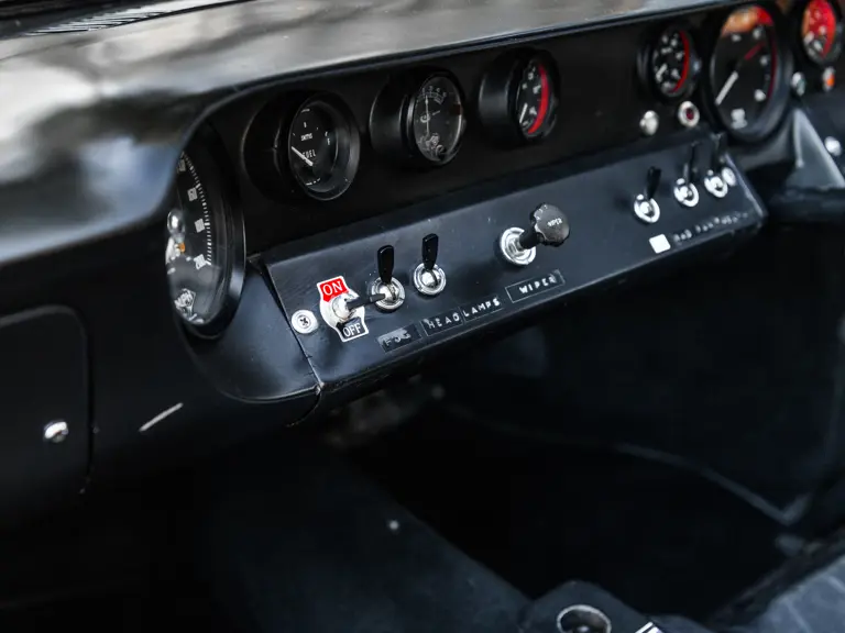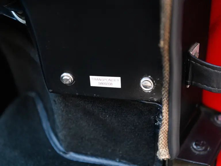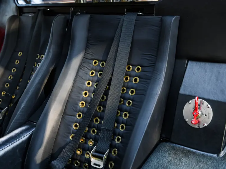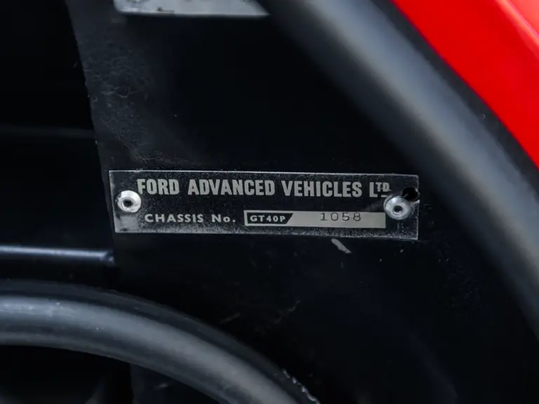 In a testament to the relatively gentle use P/1058 has experienced throughout its life, compared to those that were used in wheel-to-wheel racing, riveted 1058 tags can be found throughout the car on various body panels, and it even retains the small “luggage boxes” beneath the rear clamshell that, if only technically, allowed the GT40 to meet storage requirements necessary for racing qualification. Under current ownership the seats have been changed in favor of the lightweight racing style design trimmed in lightweight black fabric with brass eyelets; original seat coverings and components accompany the sale.