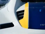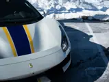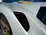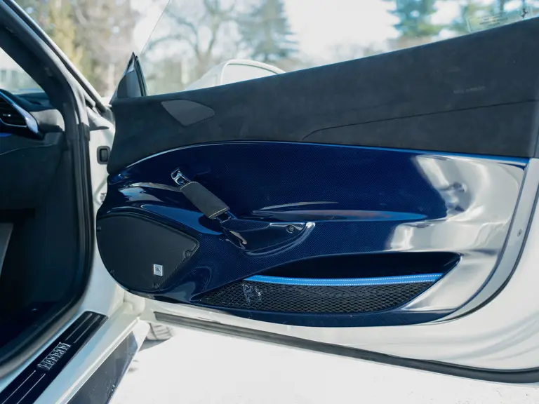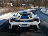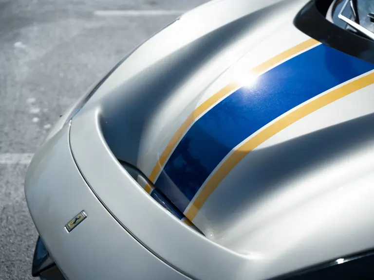 - Beautiful extra-range Bianco Italia exterior with Blu Elettrico and Giallo extended racing stripes over a black Alcantara and leather interior; blue exposed-weave carbon fiber details and gold-colored forged wheels