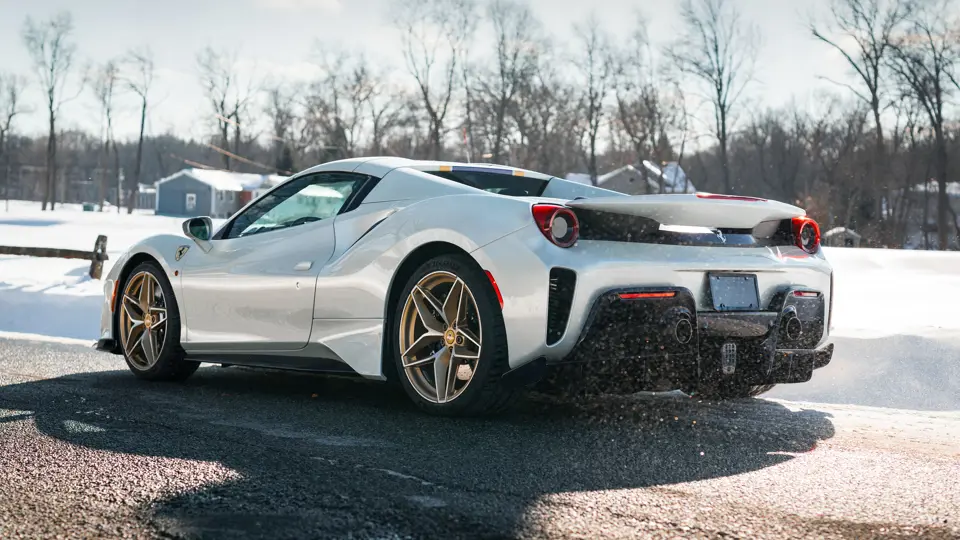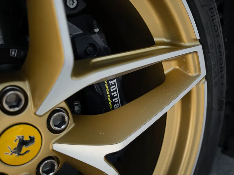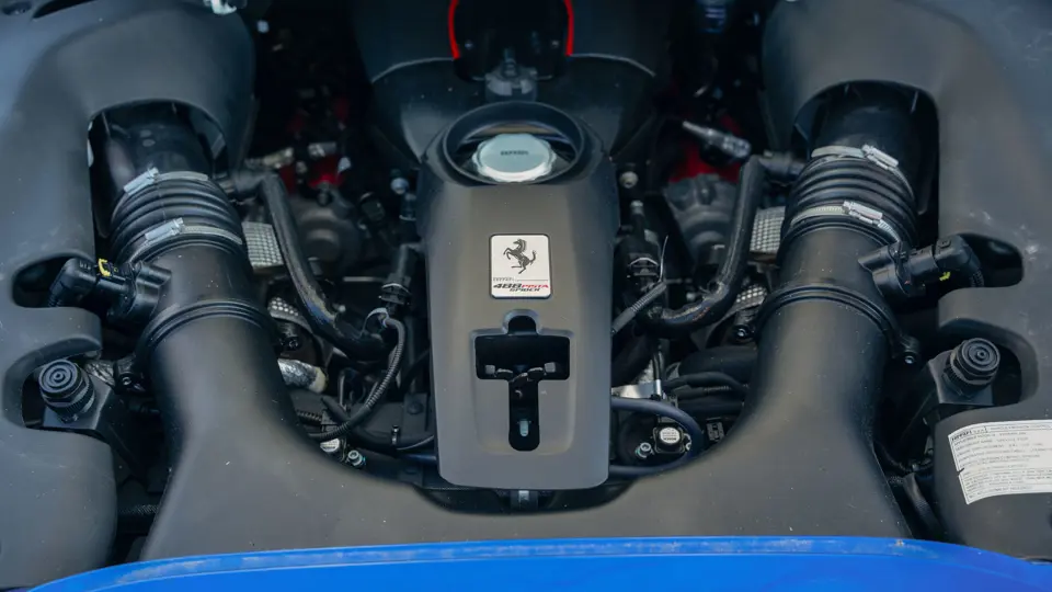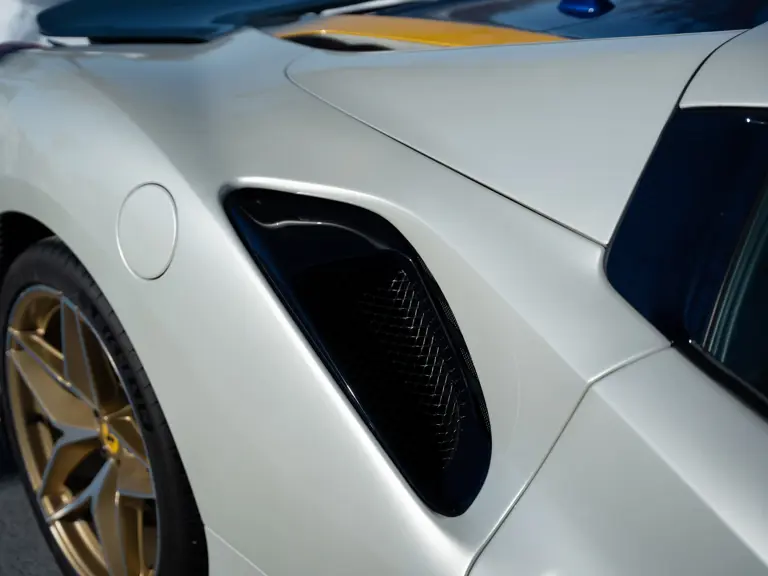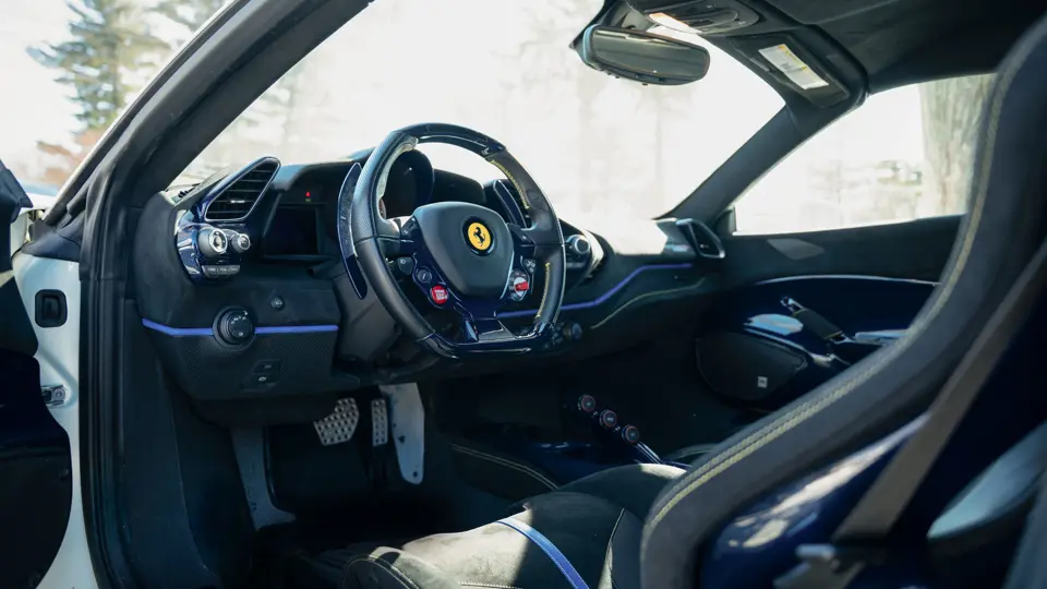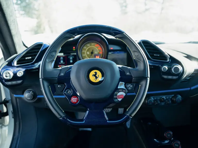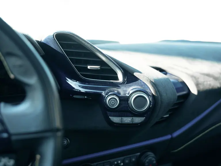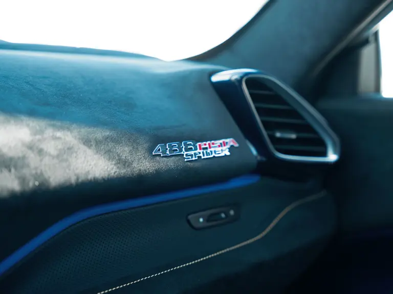 Perhaps the most outstanding element of this 488 Pista Spider, carbon fiber options were selected wherever possible, including the front flaps, side air splitters, rear diffuser, front vents, B-pillar trim, door sills, and a spectacular amount of the interior trim. To highlight this lightweight material (and to wonderfully complement the multicolored exterior), the composite resin has been tinted a deep blue and the carbon weave has been left exposed, rewarding those who take a closer look.