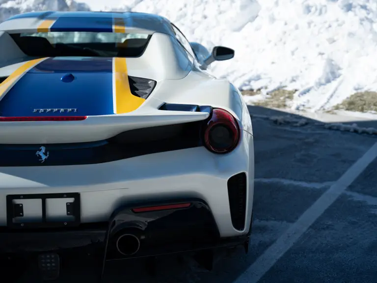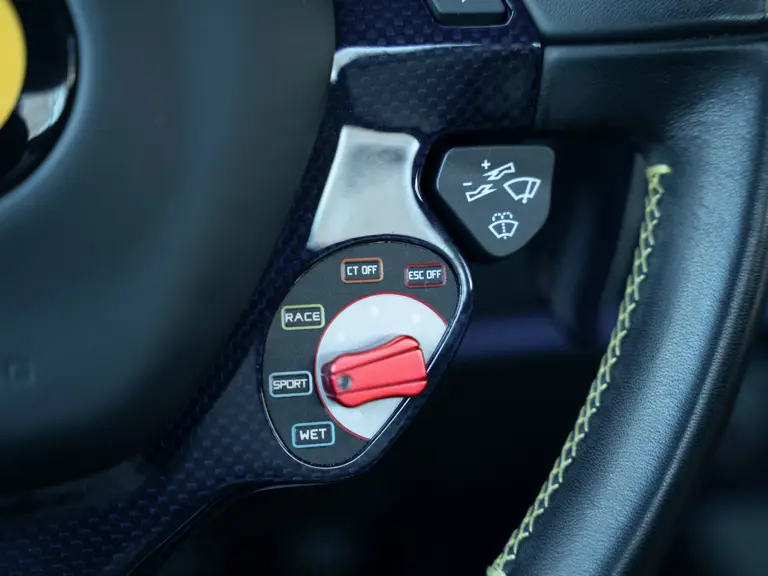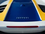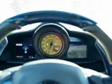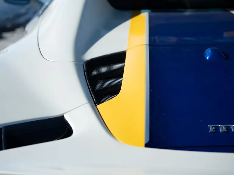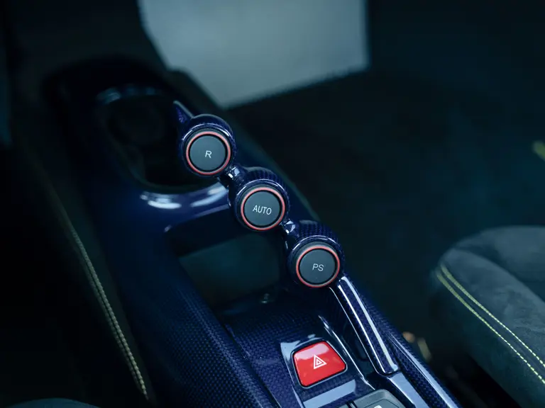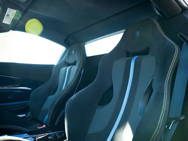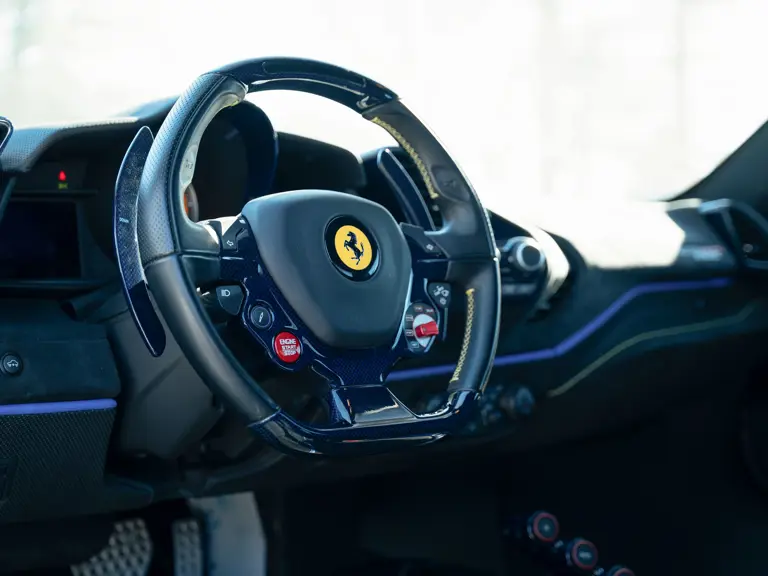 The attention to detail continues inside the car. In line with the Pista’s track-focused nature, the seating surfaces are swathed in black Alcantara with Giallo contrast stitching. An Azzurro Santorini stripe runs down each seat, matching the dashboard piping, and the headrests each bear the famous Prancing Horse silhouette. Even the steering wheel, which features Ferrari’s signature “Manettino” drive mode selector dial, is trimmed in blue carbon with yellow stitching and perfectly frames the yellow tachometer.