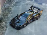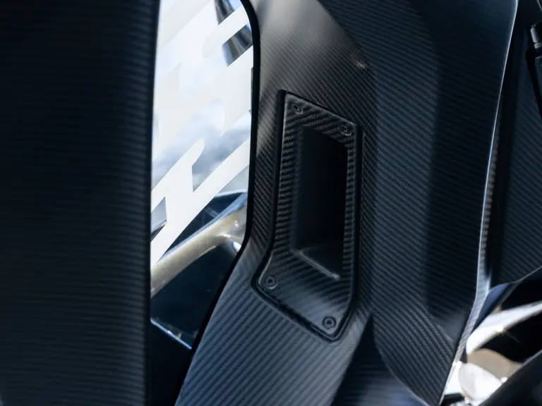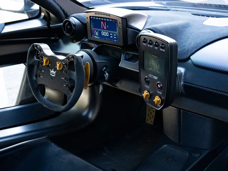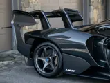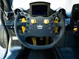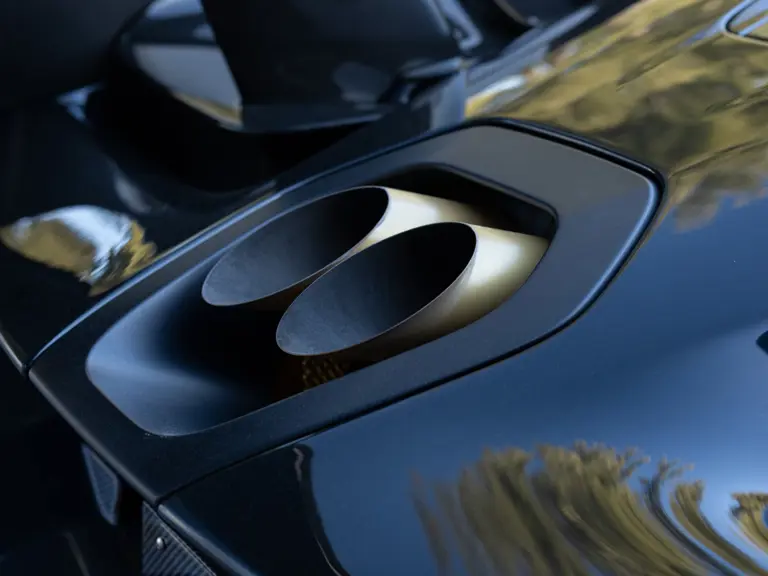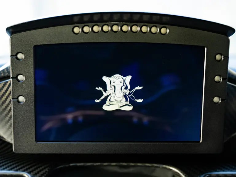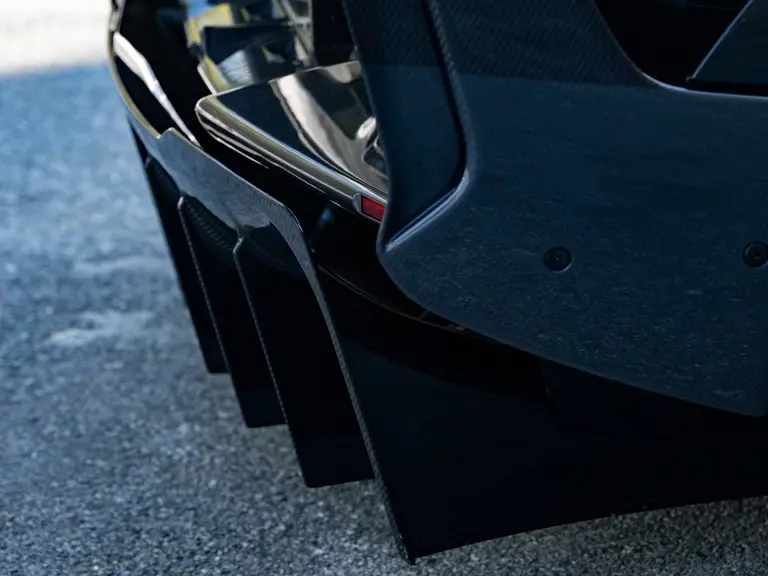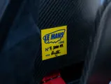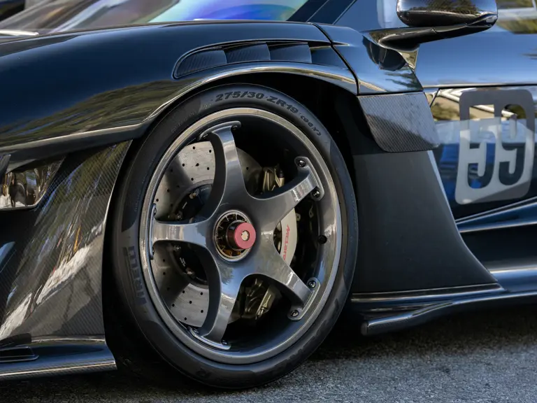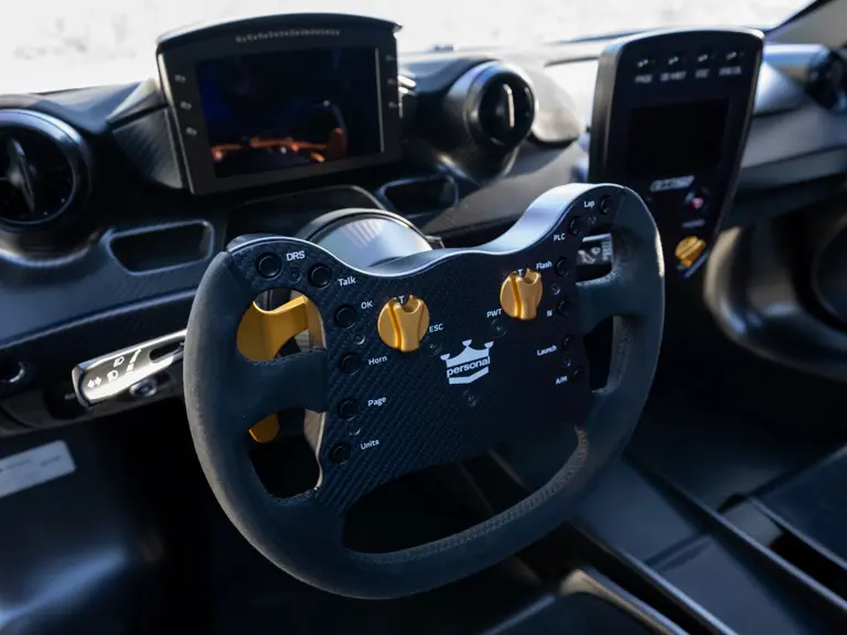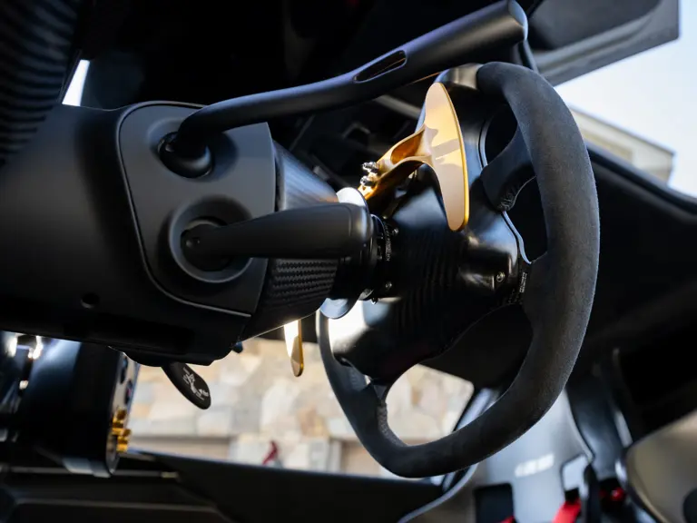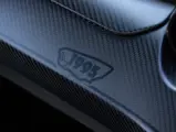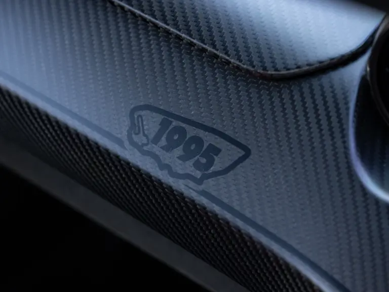 This Senna GTR LM 25 benefits from measures that reportedly reduce curb weight by 90 pounds versus the standard model. Discreet visual references to the Le Mans-winning McLaren include the racing number 59 etched on the lower door glass and Tokyo Ueno Clinic-sponsor decals on the carbon fiber monocoque shell, visible only when the car’s dihedral doors are lifted open. Inside, ultra-light carbon fiber-shell seats customized with LM 25 logos on the headrests mimic those of the F1 GTR and feature blue and red Willans multi-point harnesses. Other unique details include gold-finished pedals and switchgear, a carbon fiber steering wheel with gold-finished paddle shifters, and various subtle references to the 1995 win, such as a faithful rendition of the scrutineering decal on the rear bulkhead.