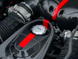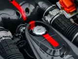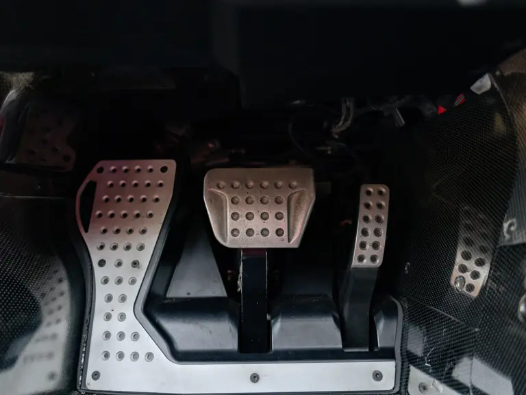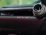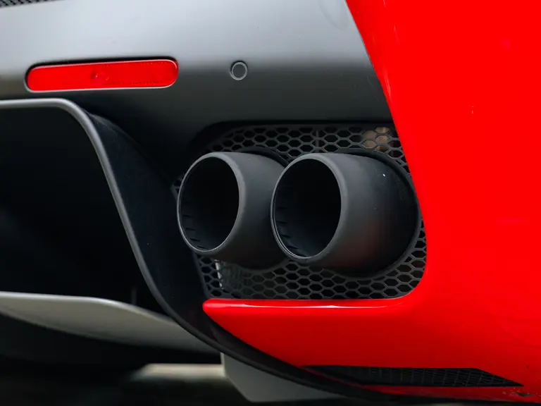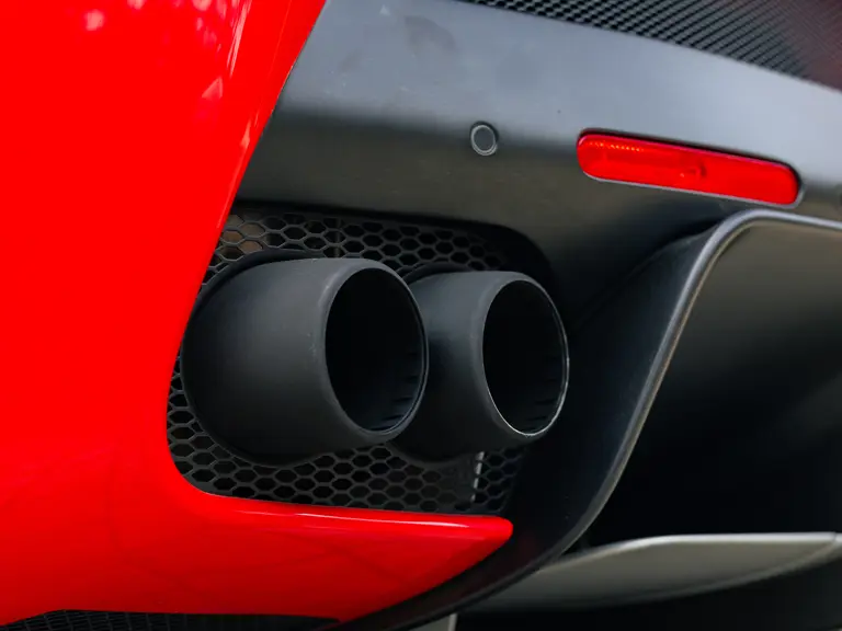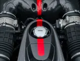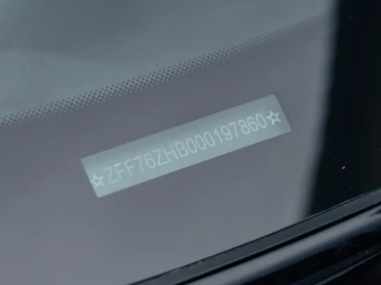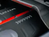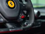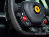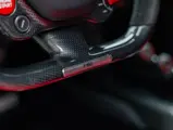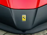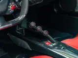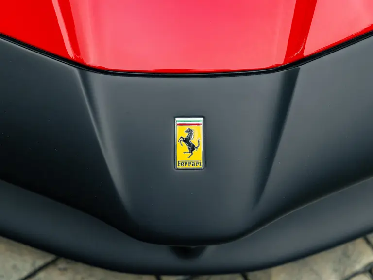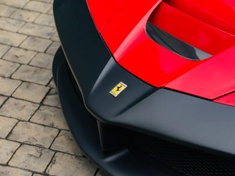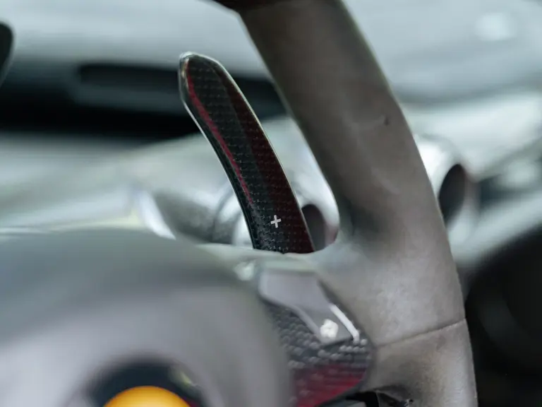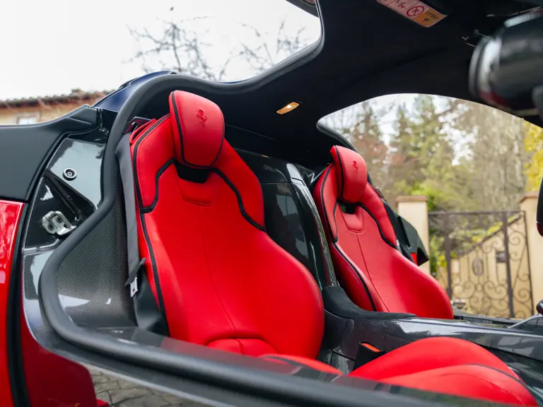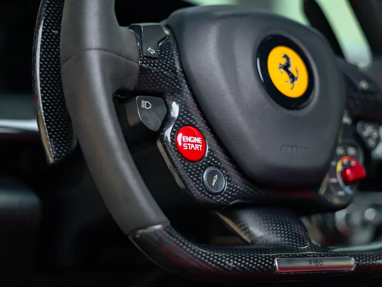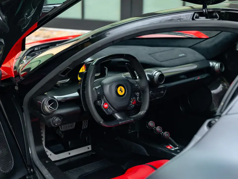 The interior features a livery of Nero leather upholstery and lacquered exposed carbon fiber offset by Rosso leather seats with complementary Nero trim and red Prancing Horses stitched into the headrests. Although the interior amenities and related switchgear are largely identical to the production LaFerrari, one noticeable difference is evident at the bottom of the steering wheel, where the standard “LaFerrari” plaque is replaced with one reading “F150,” a reference to the project code.