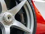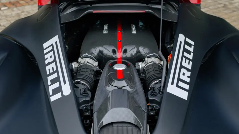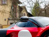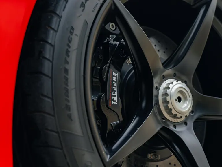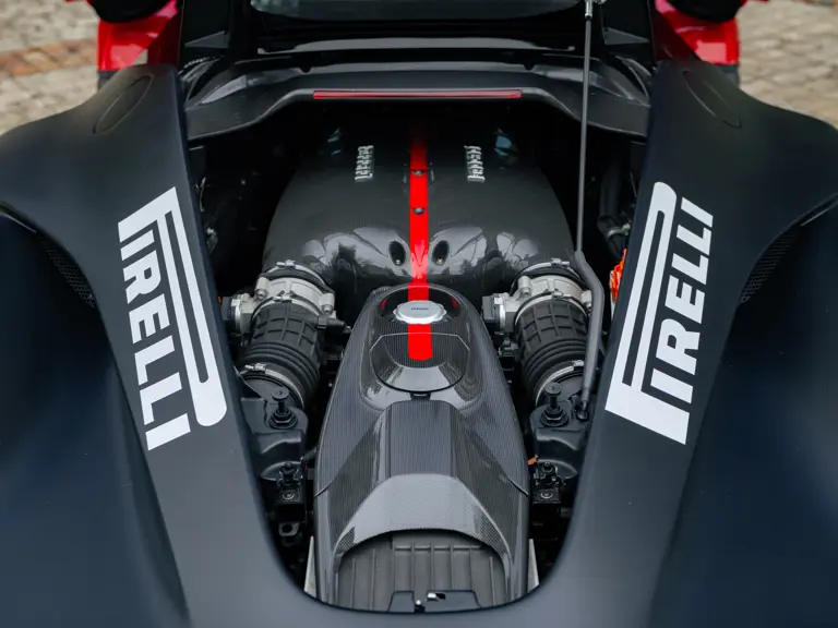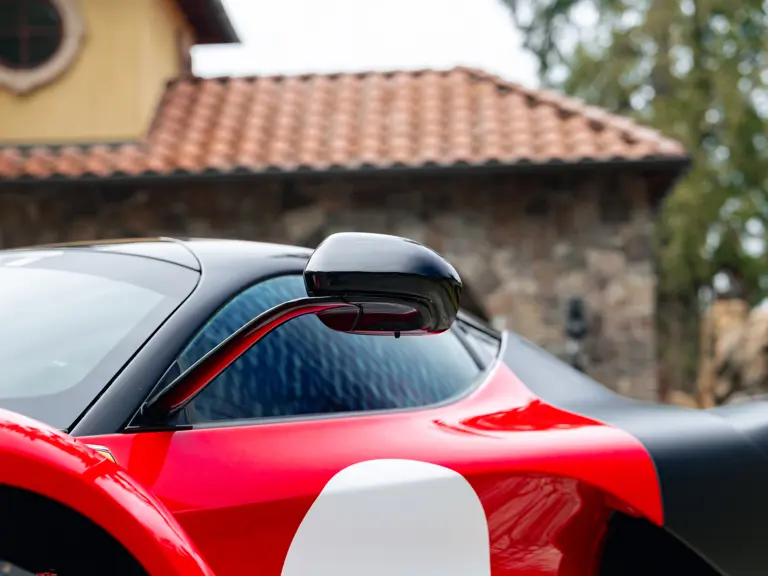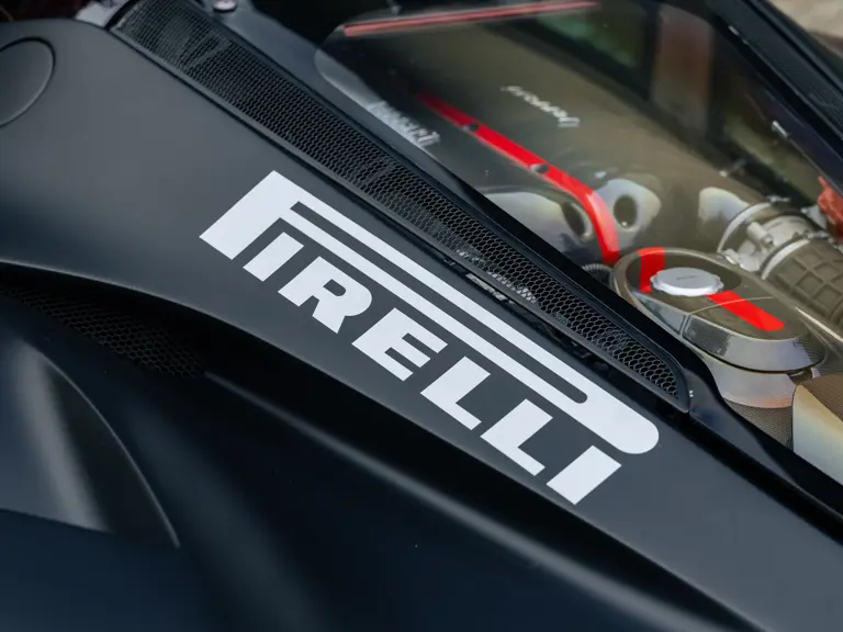 Completed in 2013, this chassis is particularly distinctive for its two-tone exterior finish in Rosso Corsa over matte satin Nero on the roof, bumper, and rear section. The coachwork takes on a competition-themed character with large white roundels on the doors, and Pirelli decals across the top of the windscreen and astride the engine lid. While five-spoke wheels are equipped all around, the front wheels are finished in silver, and the rear wheels are in Nero.