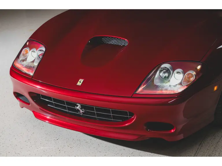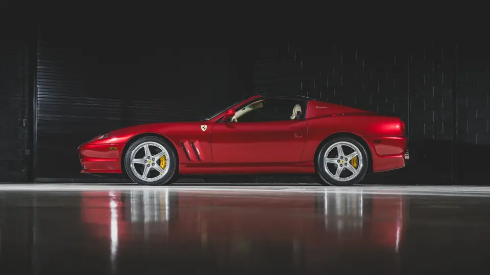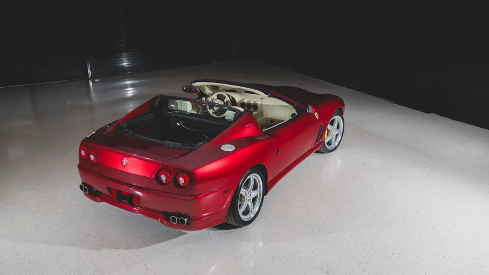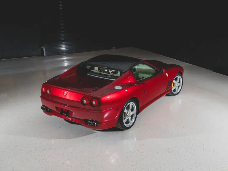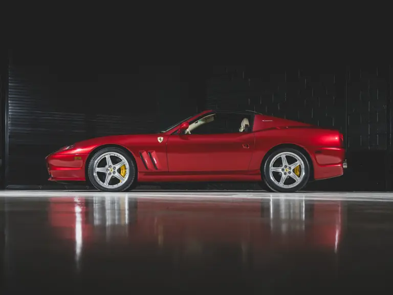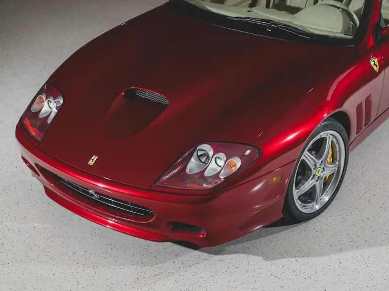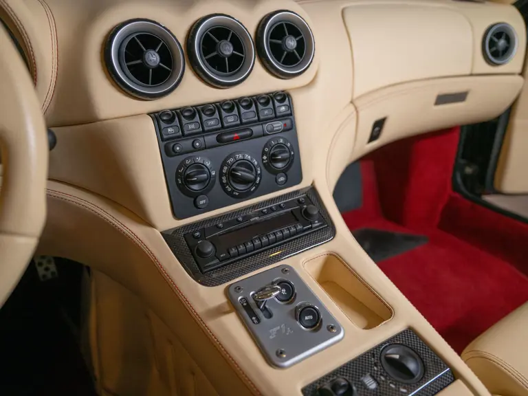 Ferrari’s 575 Superamerica was immediately set apart by its Revocromico rotating hardtop, the first of its kind ever fitted to a production car. It was constructed using a carbon fiber frame integrated with electrochromic glass; when the top was closed, the opacity of the glass could be adjusted via a dial in the cabin, allowing the driver and passenger to experience the full brightness of a conventional sunroof at its lightest setting or just 1% of available light at its darkest. Further, the Superamerica could be transformed into a convertible at the touch of a button, with the roof rotating back to rest flush with the rear deck in just 10 seconds. Combined with the potent drivetrain of the 575M Maranello beneath, it made for a formidable sports car for all occasions and weather, one that was true to the storied spirit of the Superamerica name.