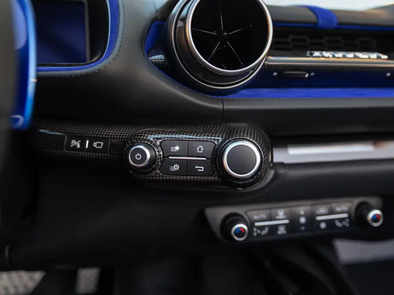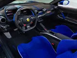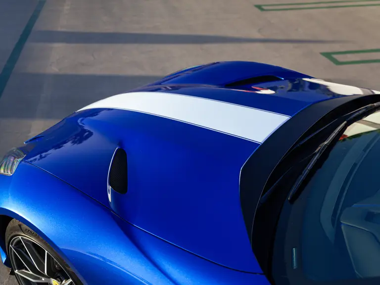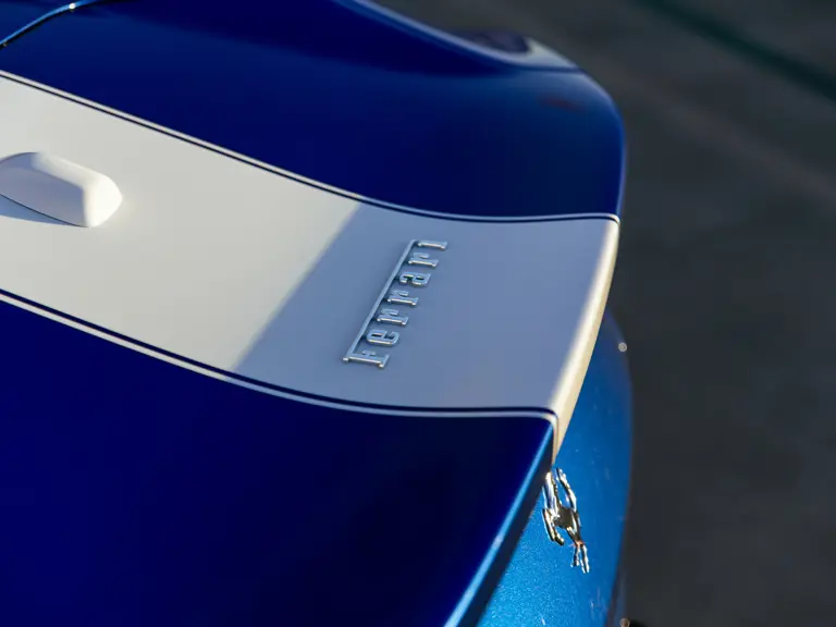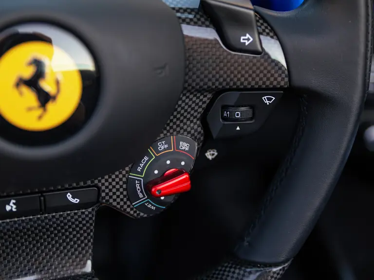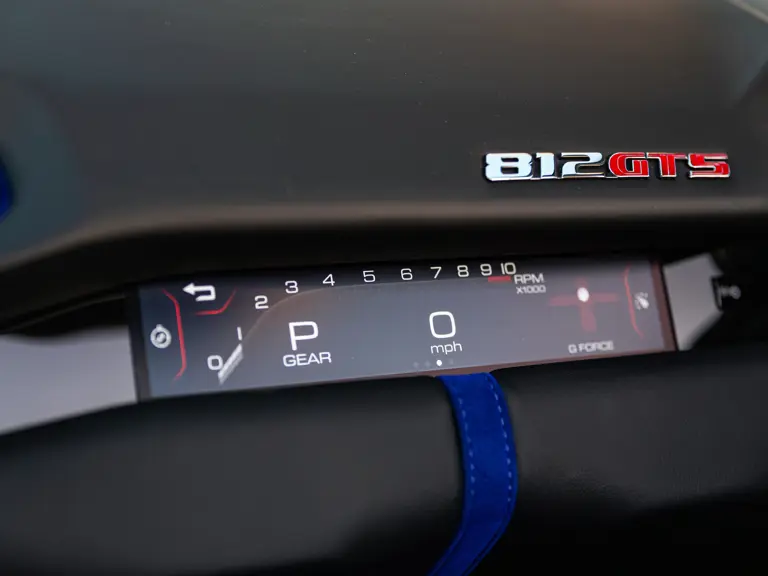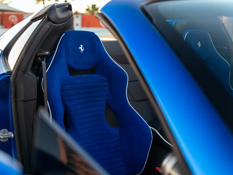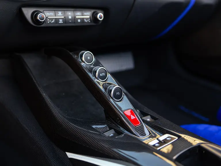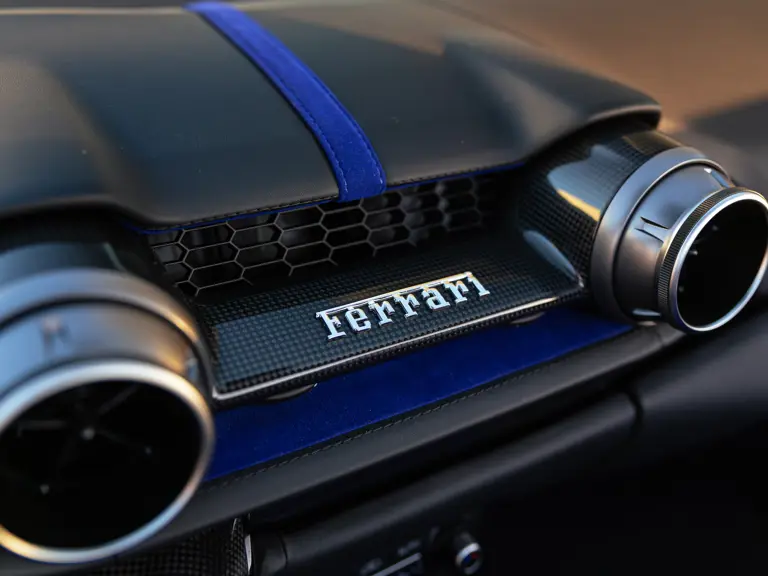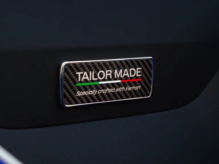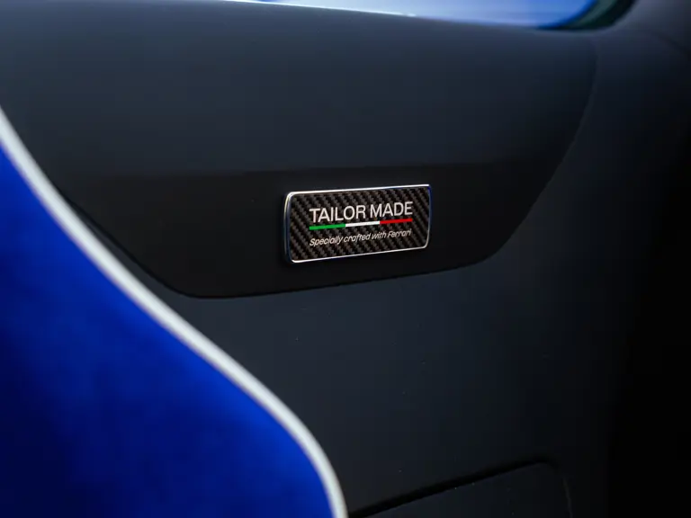 Bringing cohesion to the presentation, the interior mirrors the exterior treatment with Blu Superelettrico Alcantara covering the carbon fiber racing seats with complementary dashes of blue found on the door handles, gauge cluster surround, shift paddles, and dashboard strips. Bianco Cavallino logos embroidered on each headrest, along with a white rev counter, further enhance the cabin. Carbon fiber kick plates on the door sills feature the Tailor Made logo and the Italian tricolor stripe. A spectacularly luxurious element, the leather treatments found throughout the cabin are composed of hides sourced through the high-end Italian furniture manufacturer Poltrona Frau.