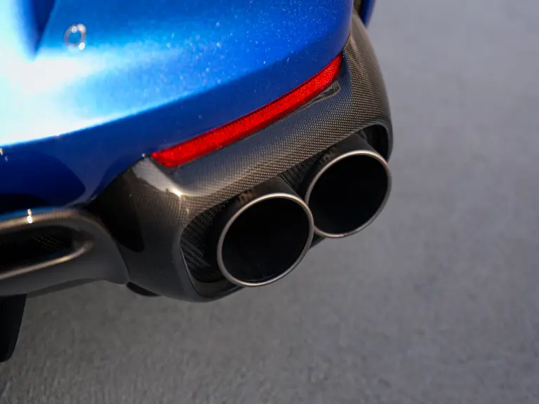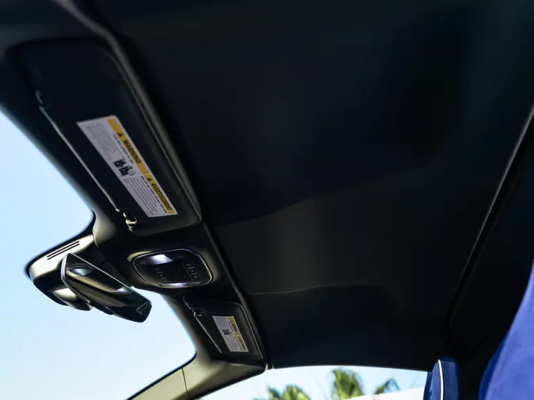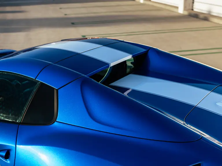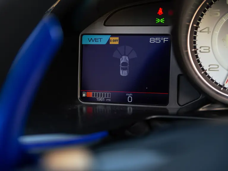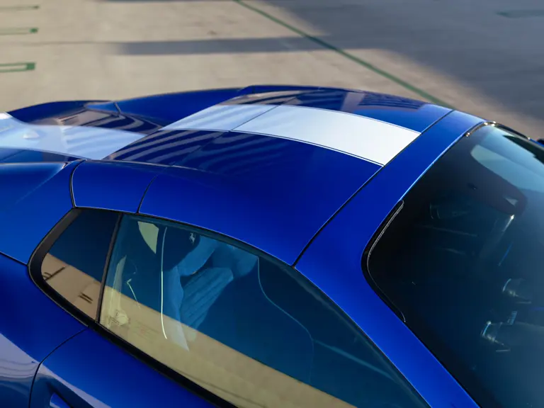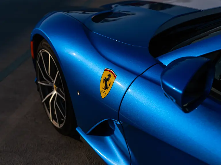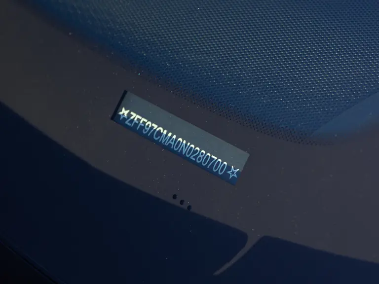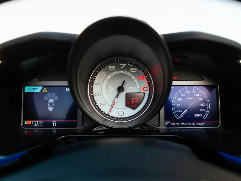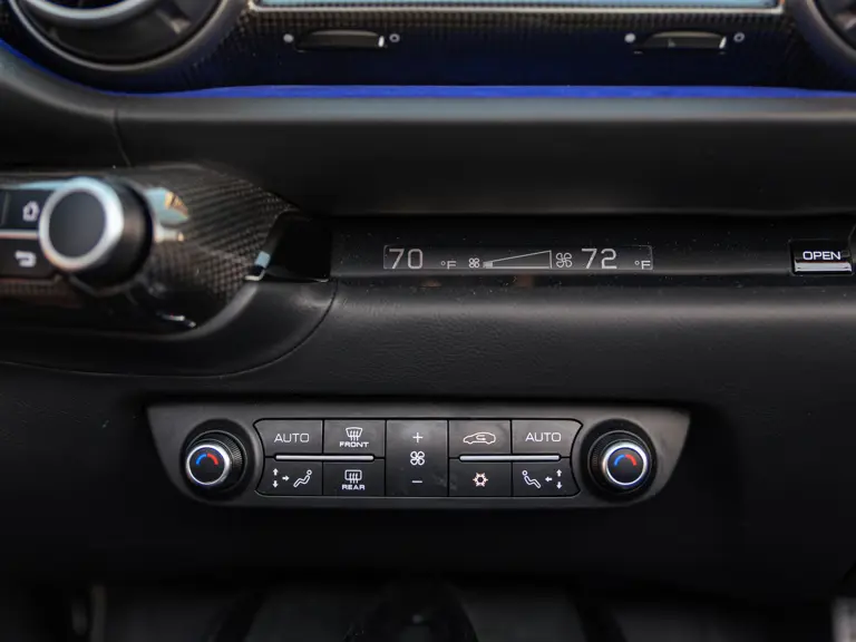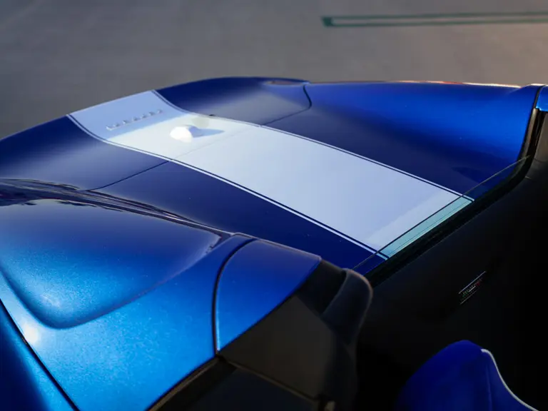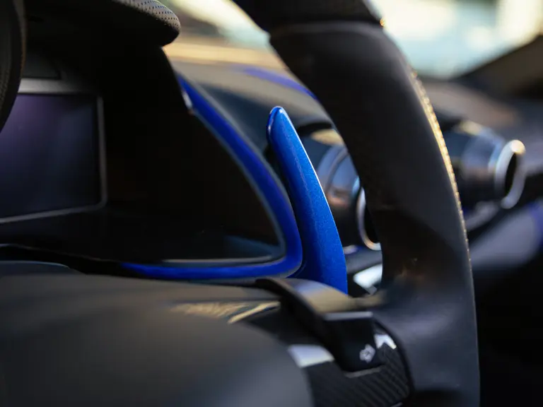 Bringing cohesion to the presentation, the interior mirrors the exterior treatment with Blu Superelettrico Alcantara covering the carbon fiber racing seats with complementary dashes of blue found on the door handles, gauge cluster surround, shift paddles, and dashboard strips. Bianco Cavallino logos embroidered on each headrest, along with a white rev counter, further enhance the cabin. Carbon fiber kick plates on the door sills feature the Tailor Made logo and the Italian tricolor stripe. A spectacularly luxurious element, the leather treatments found throughout the cabin are composed of hides sourced through the high-end Italian furniture manufacturer Poltrona Frau.
