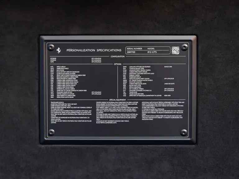 This one-of-one 12-cylinder Ferrari has been driven just 1,961 miles as of cataloguing time and remains in outstanding condition throughout. It is ideal for the connoisseur who favors a highly bespoke, singular specification in the most exclusive Tailor Made colors and trim—an 812 GTS as striking to behold as it is to drive.