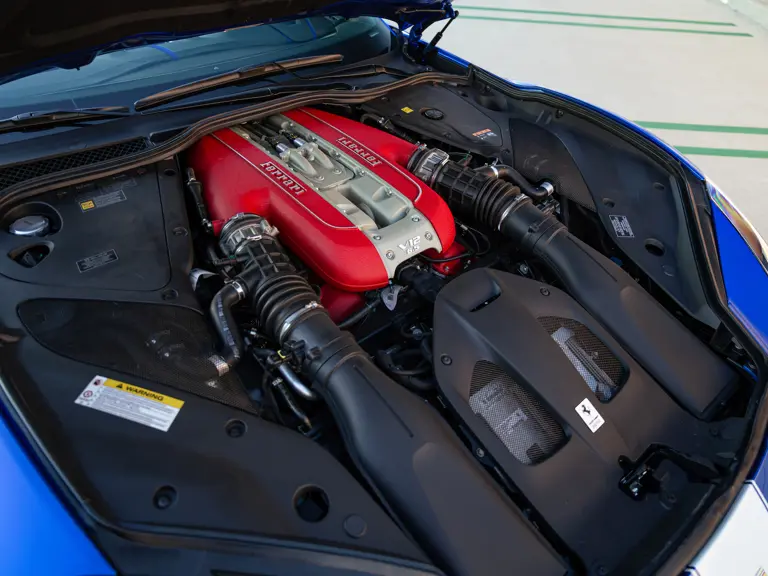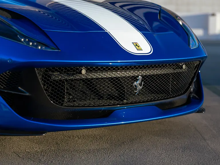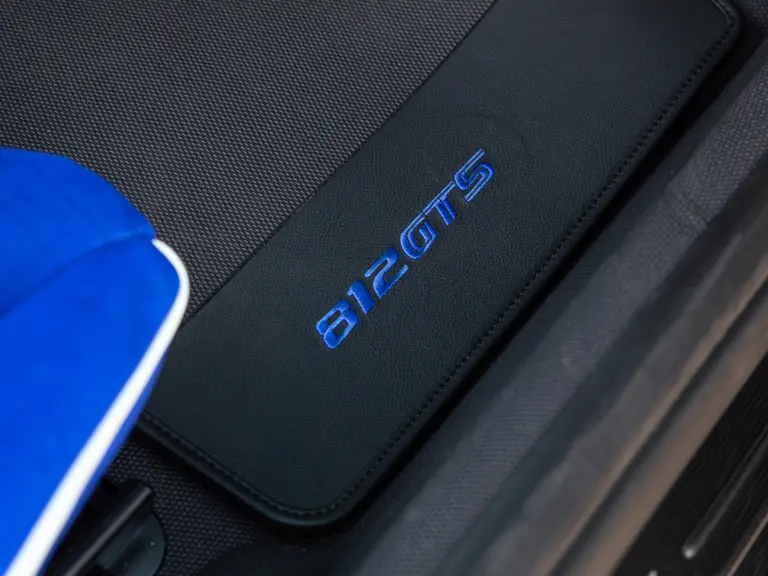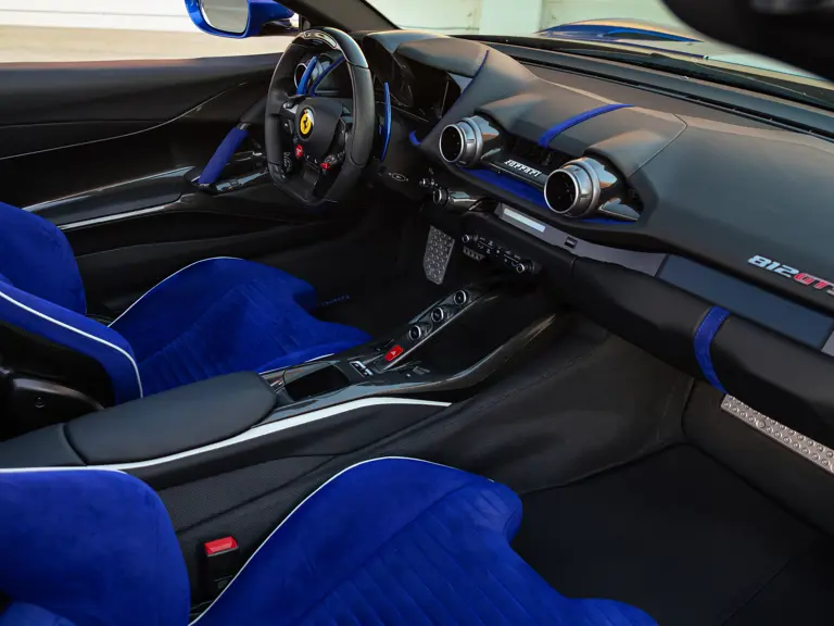 The 2022 Ferrari 812 GTS on offer is a wonderous display of the Tailor Made program’s capabilities. A bold statement, the car is finished in Blu Stephanie, offset by a wide Bianco King central stripe flanked by thinner stripes in the same color. The one-off specification also features extensive use of carbon fiber, including for the front bumper valance, rear bumper sides, front spoiler, rear diffuser, the underside of the doors, inner door handles, driver zone and bridge, kick panels, door panels, dashboard inserts, and console. Alloy silver forged racing wheels, glossy black brake calipers, and airbrushed Scuderia Ferrari fender shields further dress the exterior.