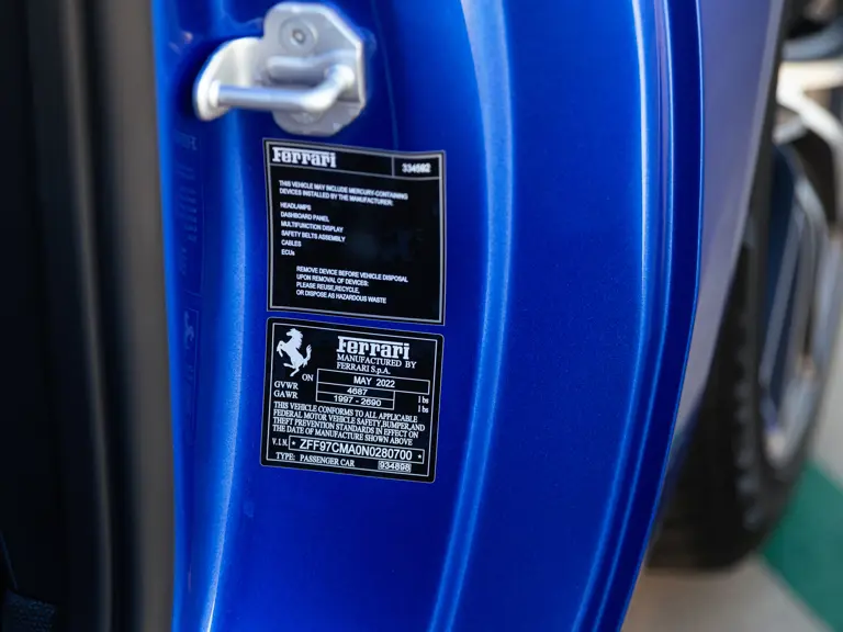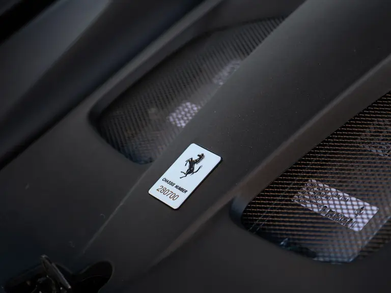 Other notable equipment includes front and rear cameras, passenger display, and titanium exhaust pipes. As indicated by an invoice on file, Ferrari Beverly Hills performed a second annual service which included a filter change, brake flush, and systems check in August 2024.