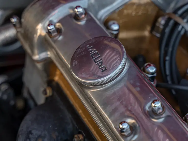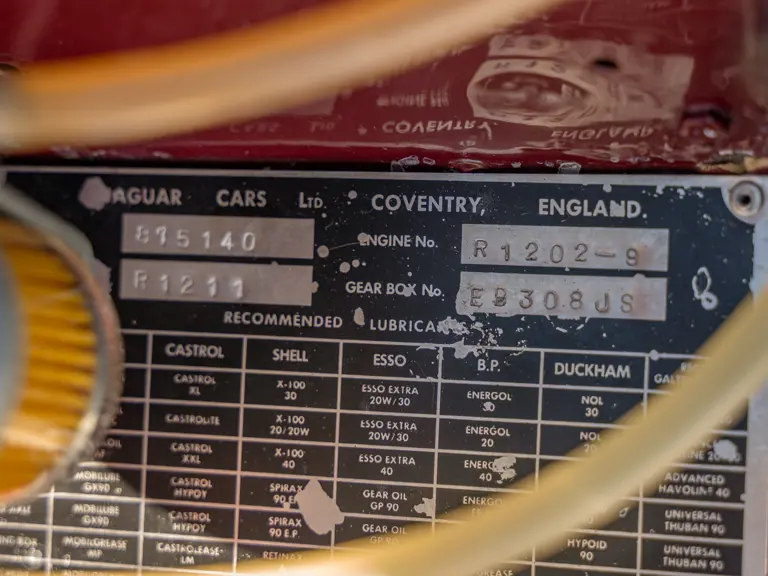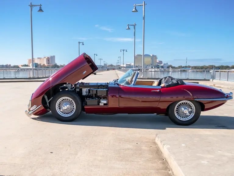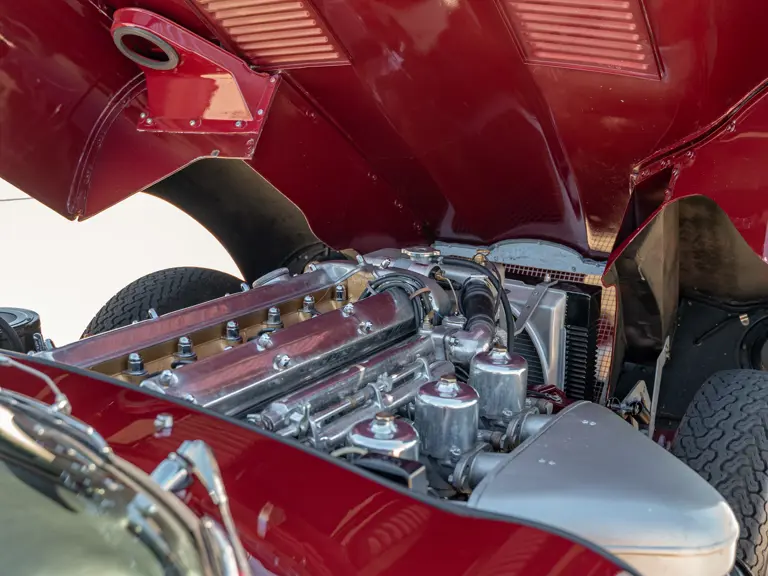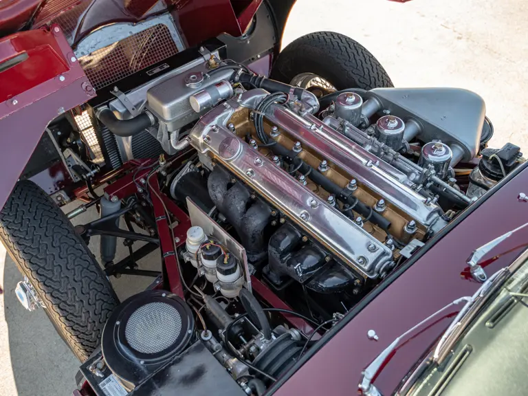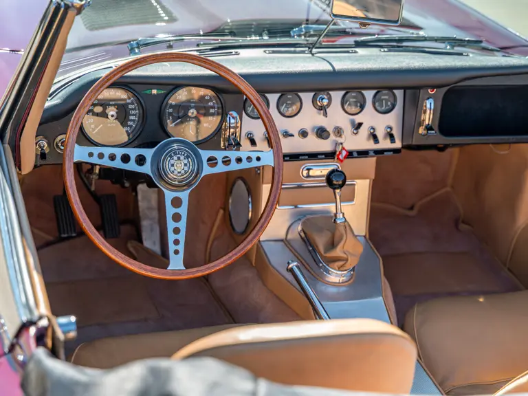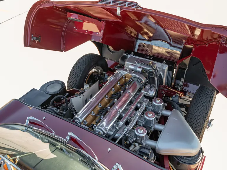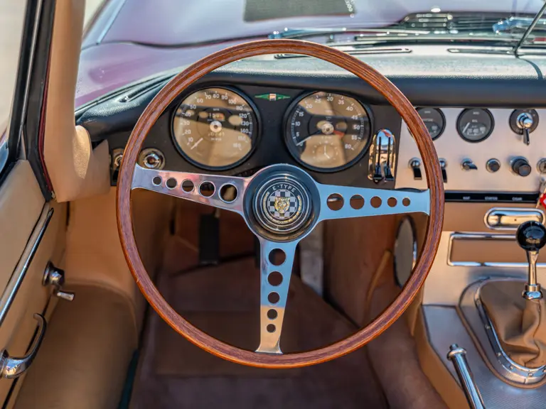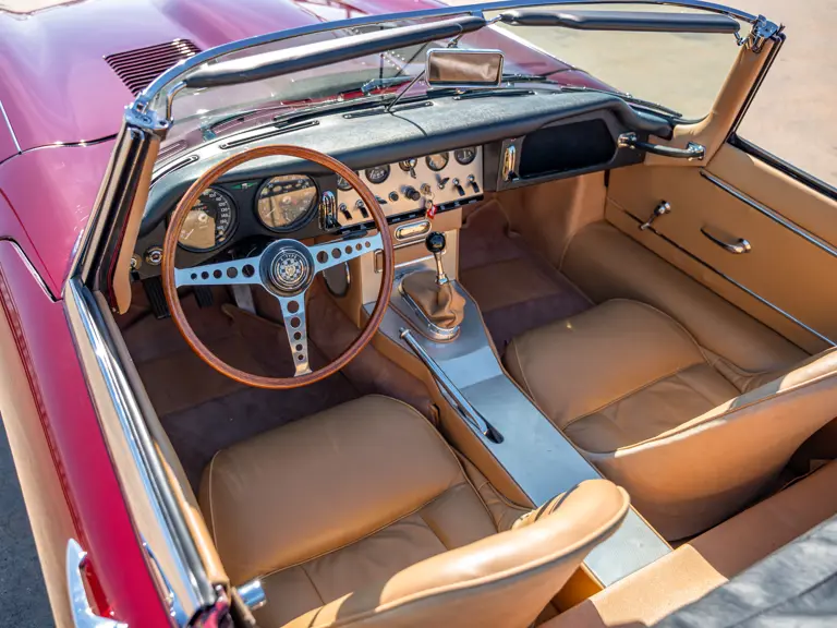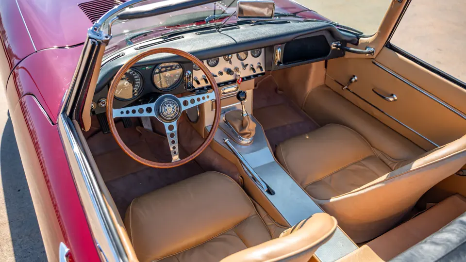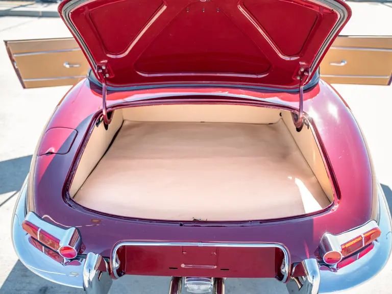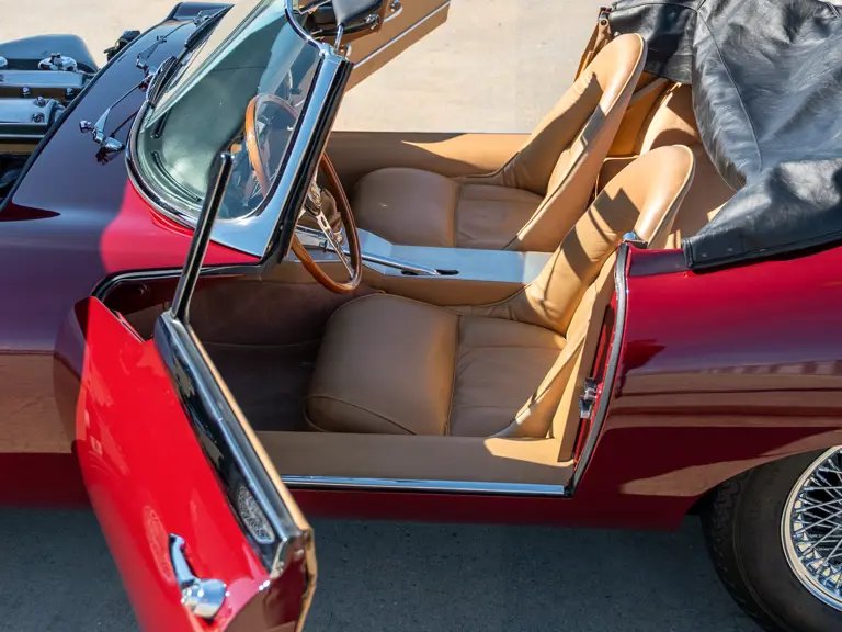 The E-Type was later restored in maroon over a beige interior with a black soft-top, a color combination that suits the car’s lithe lines well. It has seen limited road use since, with the 241 miles displayed on the odometer at the time of cataloguing believed to represent miles driven since the restoration’s completion. In 2023, over $15,000 was invested in the car’s mechanical condition, with Function Drives Form of Carson City, Nevada, addressing the car’s electrical, braking, and cooling system, as well as replacing seals and repairing lubrication and exhaust system leaks as needed. In preparation for sale, the car was refreshed, including a show-car-quality repaint in maroon, with work completed in early 2026. Importantly, it retains its numbers-matching engine, cylinder head, and body, per its JDHT certificate.