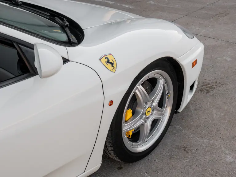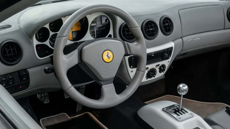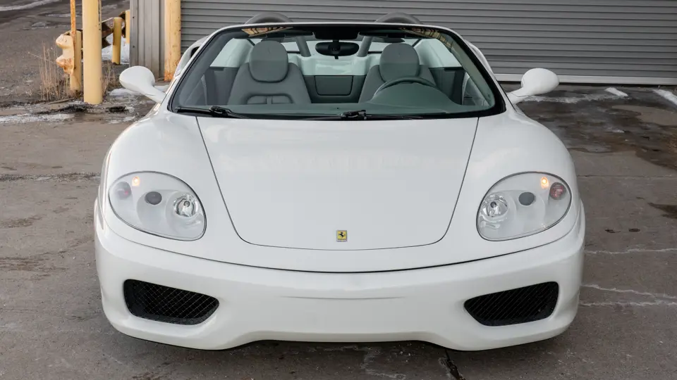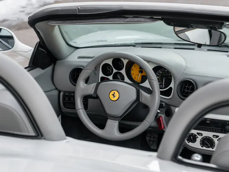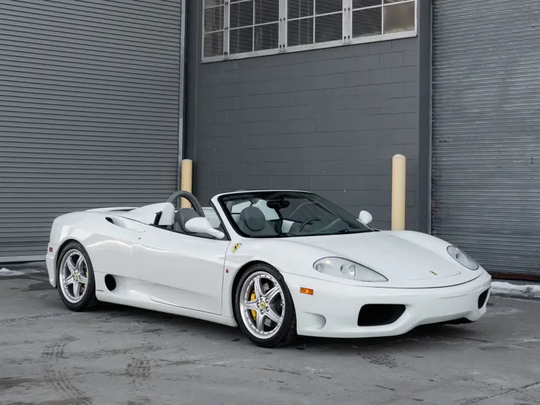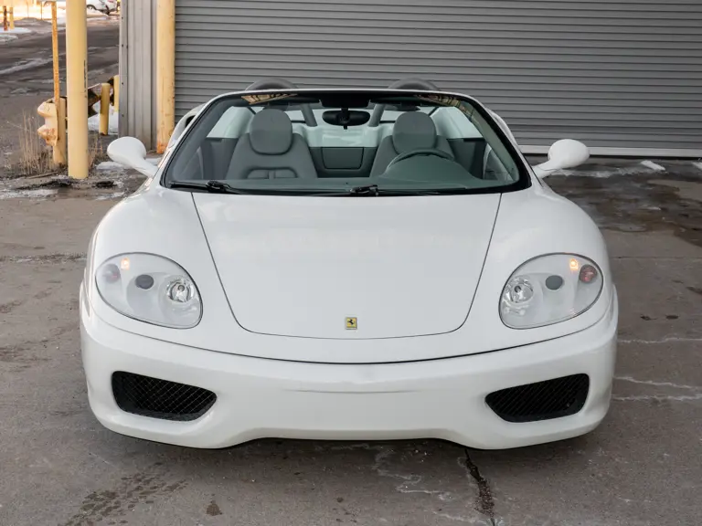Delivered new to Ferrari San Francisco in Mill Valley, California, this Ferrari 360 Spider is finished in striking Bianco Avus (100 D.S.) over a beautifully tailored gray leather interior. The cabin is a vivid demonstration of Ferrari’s bespoke craftsmanship, featuring extensively upholstered gray leather complemented by an array of factory options including electrically adjustable Daytona-style seats, a color-matched upper dashboard and steering wheel with coordinating stitching, color-coordinated roll-bar trim, and Challenge-style grilles, creating a crisp and highly distinctive specification.